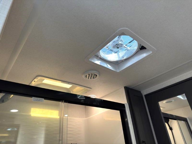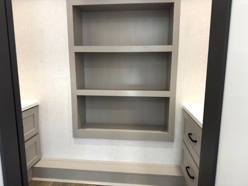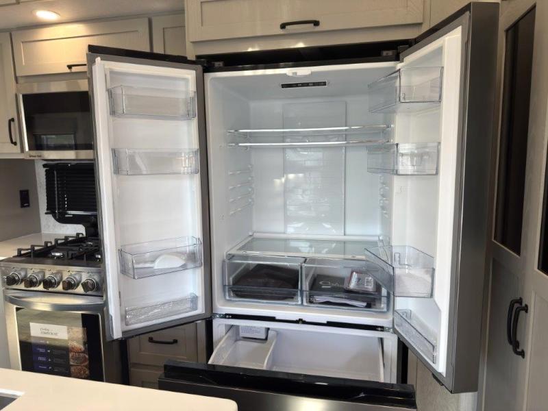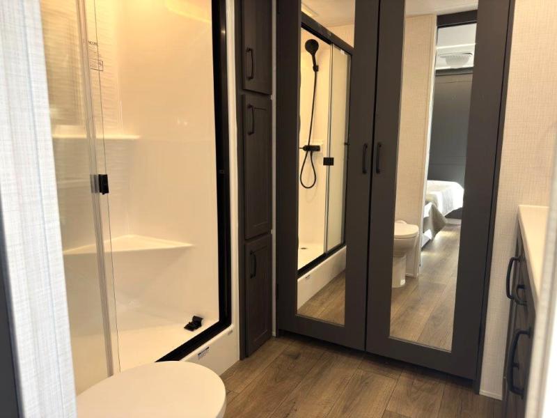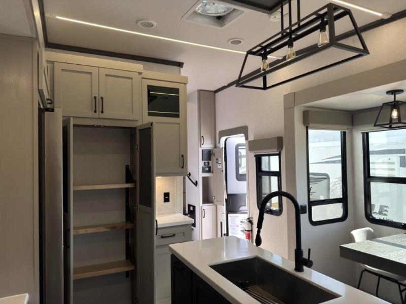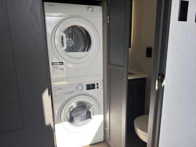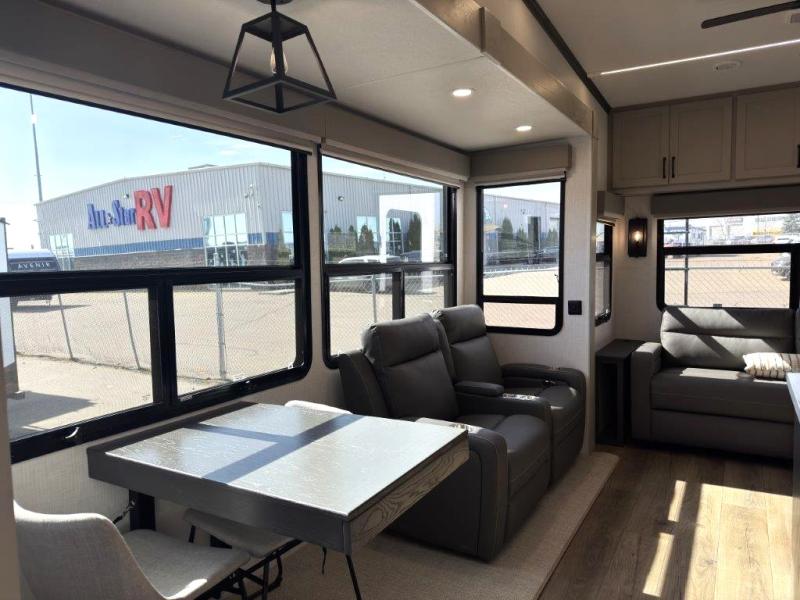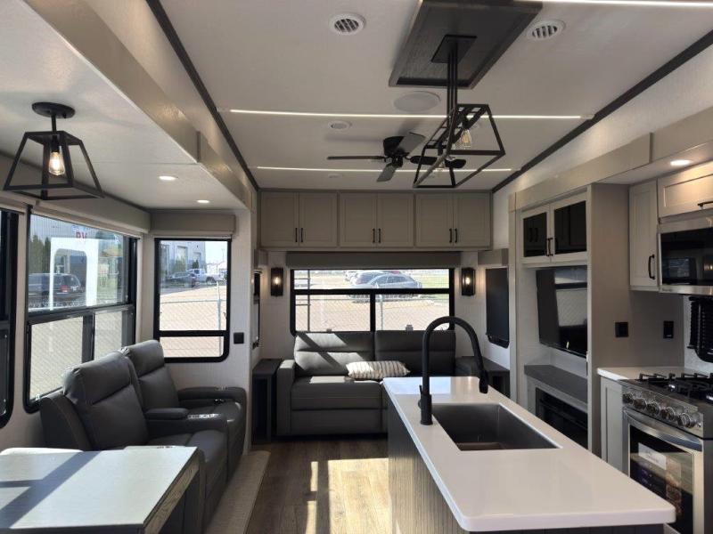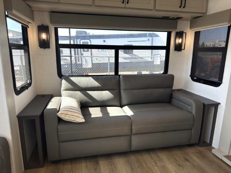 Everyone will stay clean with a bath and a half in this fifth wheel! The kitchen has a pantry big enough for everyone's favorite snacks, a four burner gas cooktop, and a kitchen island to prepare your best meals. You can have game night indoors at the table and chairs or set up a table and chairs underneath the two power awnings. The rear living area offers a comfortable place to watch the big game too with an sofa/sleeper and theater seating directly across from the entertainment center with a 50" Smart TV and fireplace. Two can get ready at once in the front bathroom featuring a vanity with dual sinks, and since there is washer and dryer prep, you have the option to make wash day easier!