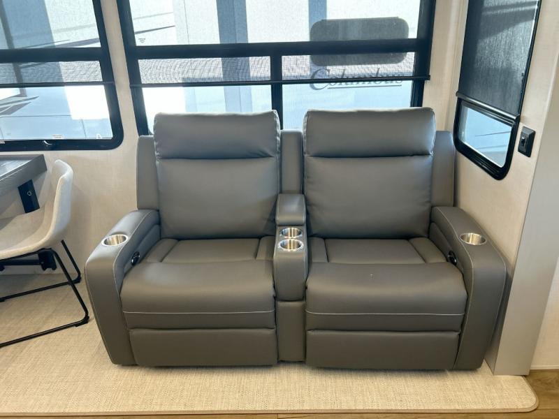 Experience a different camping life with residential furnishings and high end features in each one of these Palomino Columbus fifth wheels! The 101" wide body lets you walk around more throughout and the all-welded aluminum-frame superstructure has a snap-in ceiling molding to hold up through every adventure. Don't leave any of your gear behind either when you can easily store it in the climate controlled drop frame storage area. On the exterior, you'll find a heated utility convenience center, an outside sprayer to keep the dirt outside where it belongs, and magnetic compartment door holds to keep them from falling on you as you grab your items. Plus, there are some modern features that will really seal the deal like the Wi-Fi Booster with 4G LTE capability prep, upgraded true solid-surface countertops, power theater seating with USB charging, and a 260W solar panel for off-grid camping!