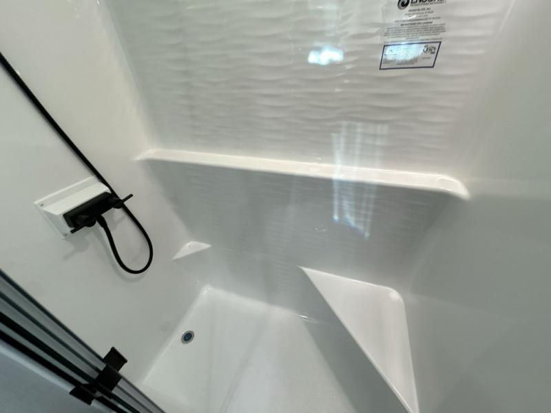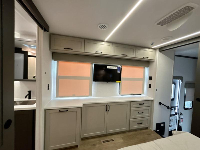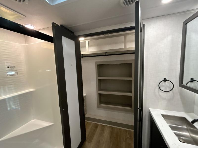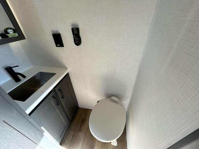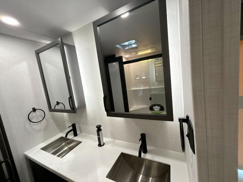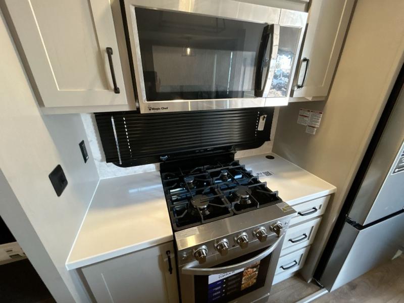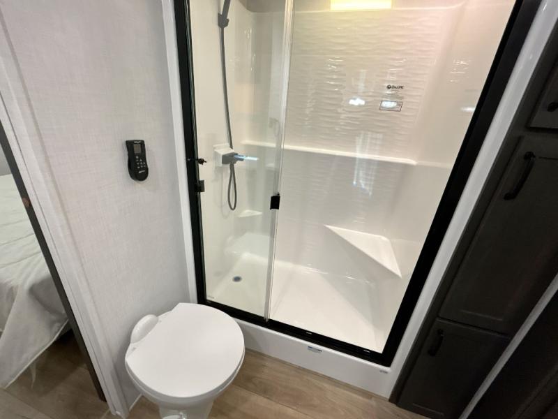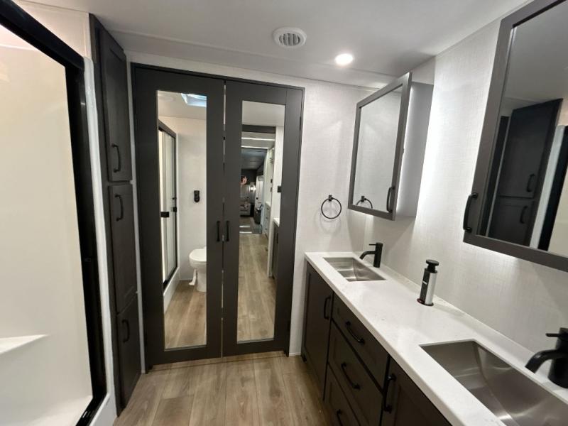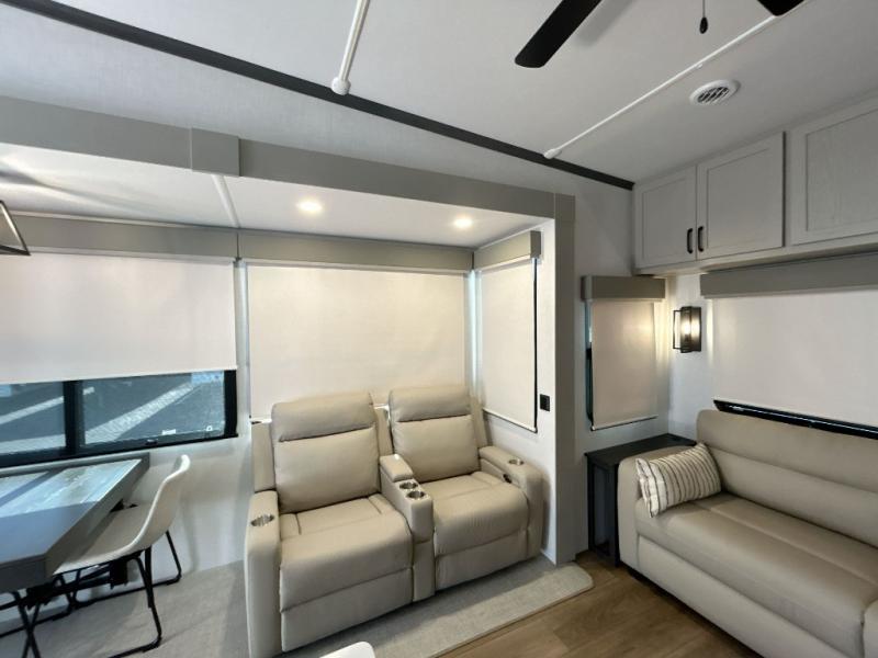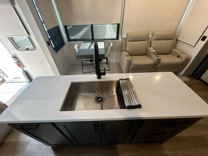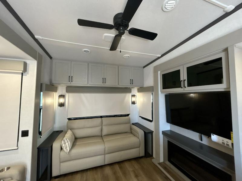 Everyone will stay clean with a bath and a half in this fifth wheel! The kitchen has a pantry big enough for everyone's favorite snacks, a four burner gas cooktop, and a kitchen island to prepare your best meals. You can have game night indoors at the table and chairs or set up a table and chairs underneath the two power awnings. The rear living area offers a comfortable place to watch the big game too with an sofa/sleeper and theater seating directly across from the entertainment center with a 50" Smart TV and fireplace. Two can get ready at once in the front bathroom featuring a vanity with dual sinks.