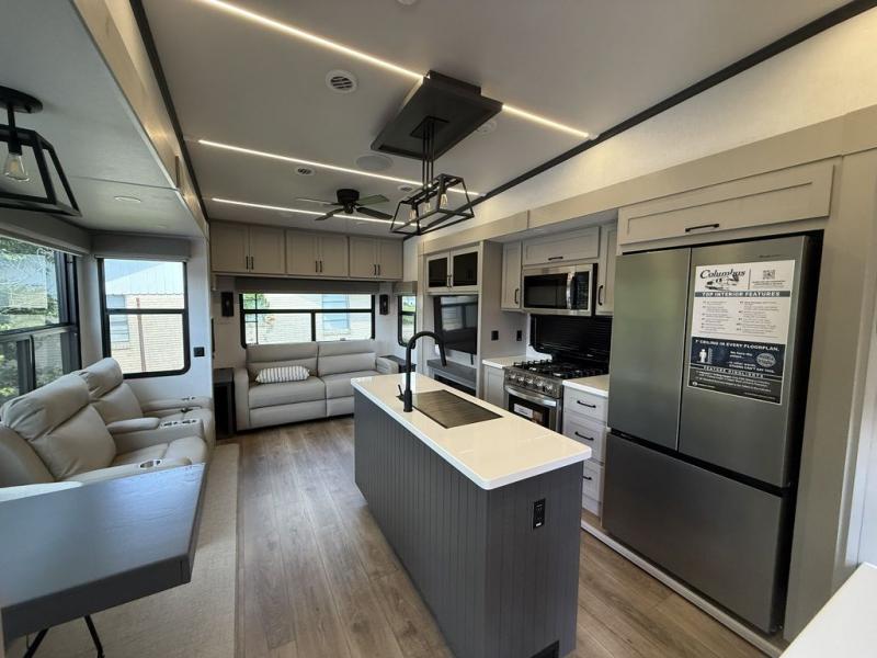 Experience a different camping life with residential furnishings and high end features in each one of these Palomino Columbus fifth wheels! The 101" wide body lets you walk around more throughout and the all-welded aluminum-frame superstructure has a snap-in ceiling molding to hold up through every adventure. Don't leave any of your gear behind either when you can easily store it in the climate controlled drop frame storage area. On the exterior, you'll find a heated utility convenience center, an outside sprayer to keep the dirt outside where it belongs, and magnetic compartment door holds to keep them from falling on you as you grab your items. Plus, there are some modern features that will really seal the deal like the Wi-Fi Booster with 4G LTE capability prep, upgraded true solid-surface countertops, power theater seating with USB charging, and a 260W solar panel for off-grid camping!
