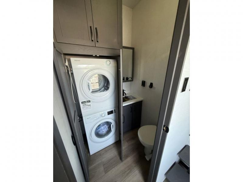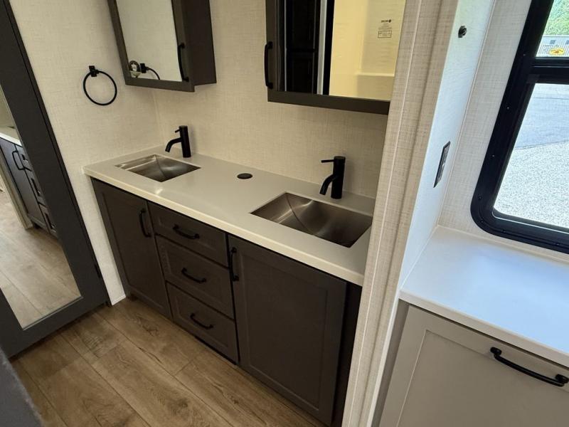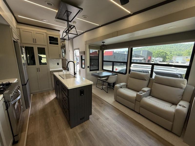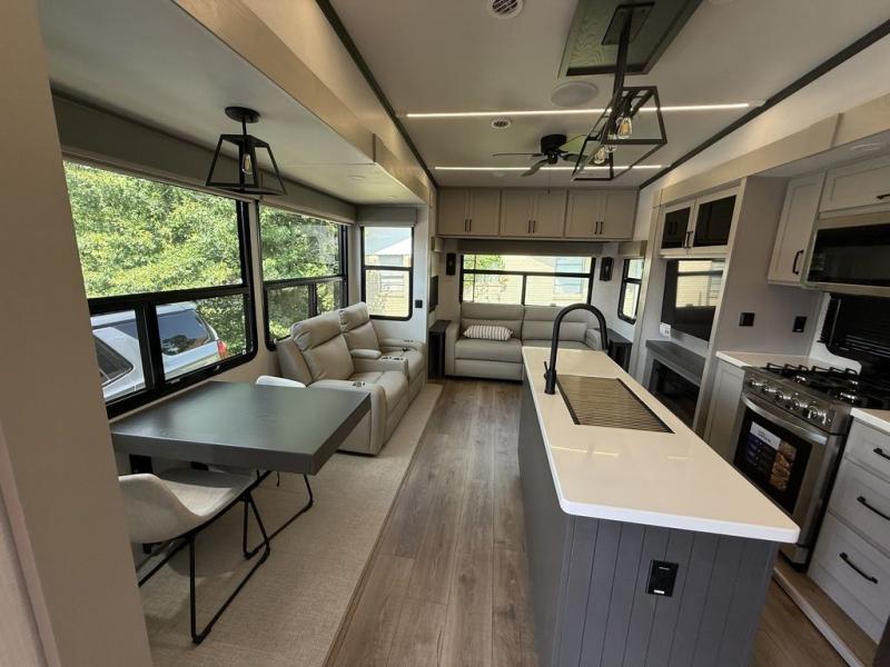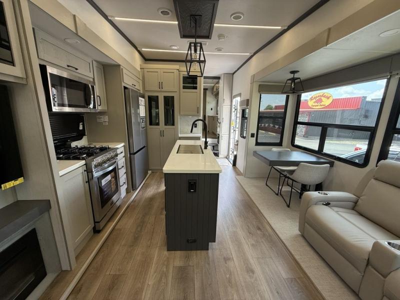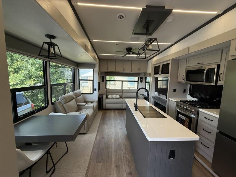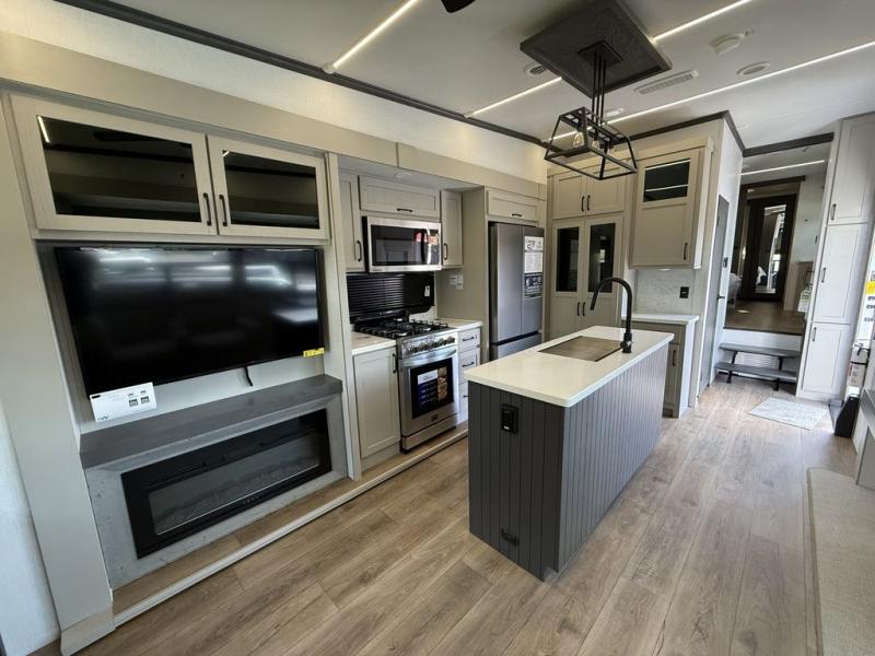 Everyone will stay clean with a bath and a half in this fifth wheel! The kitchen has a pantry big enough for everyone's favorite snacks, a four burner gas cooktop, and a kitchen island to prepare your best meals. You can have game night indoors at the table and chairs or set up a table and chairs underneath the two power awnings. The rear living area offers a comfortable place to watch the big game too with an sofa/sleeper and theater seating directly across from the entertainment center with a 50" Smart TV and fireplace. Two can get ready at once in the front bathroom featuring a vanity with dual sinks, and since there is washer and dryer prep, you have the option to make wash day easier!