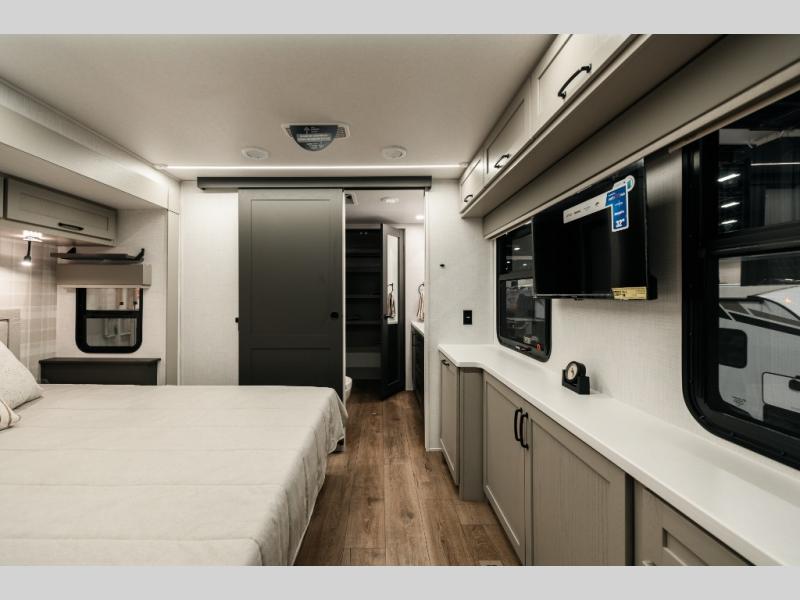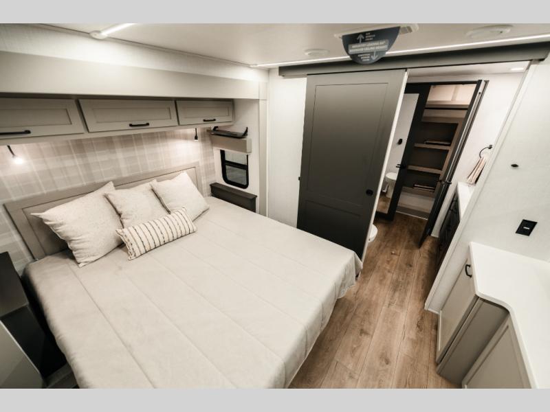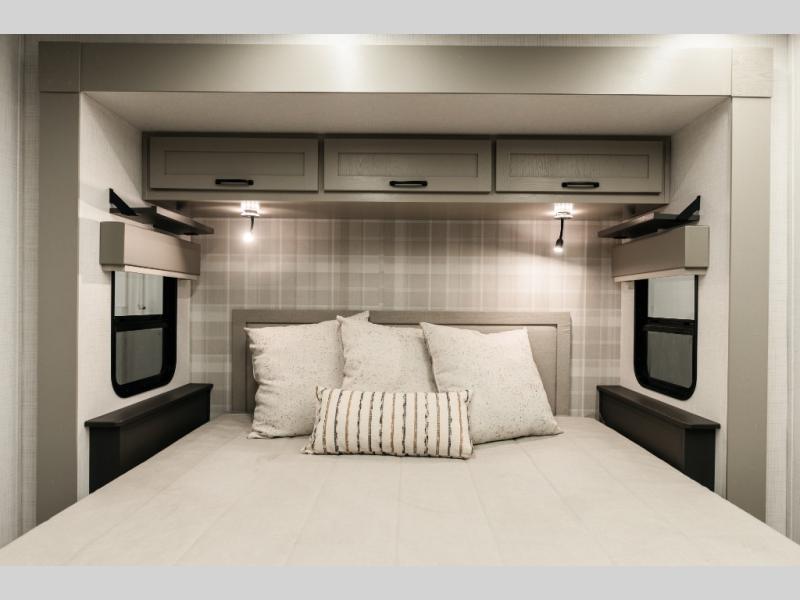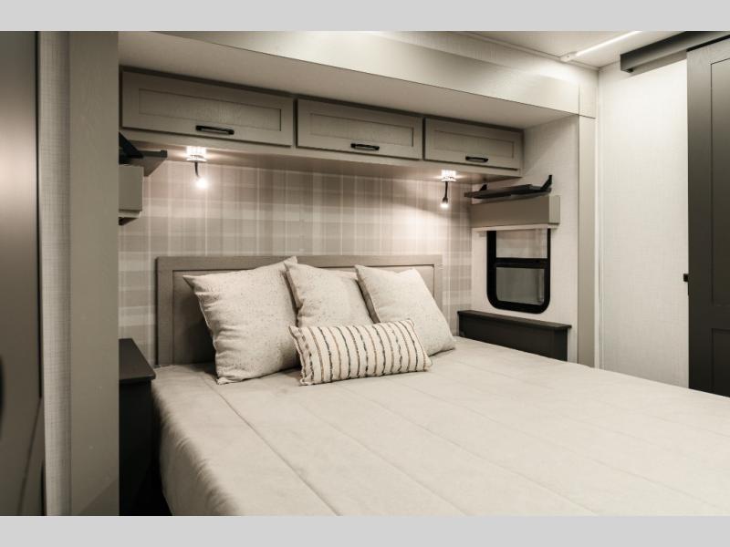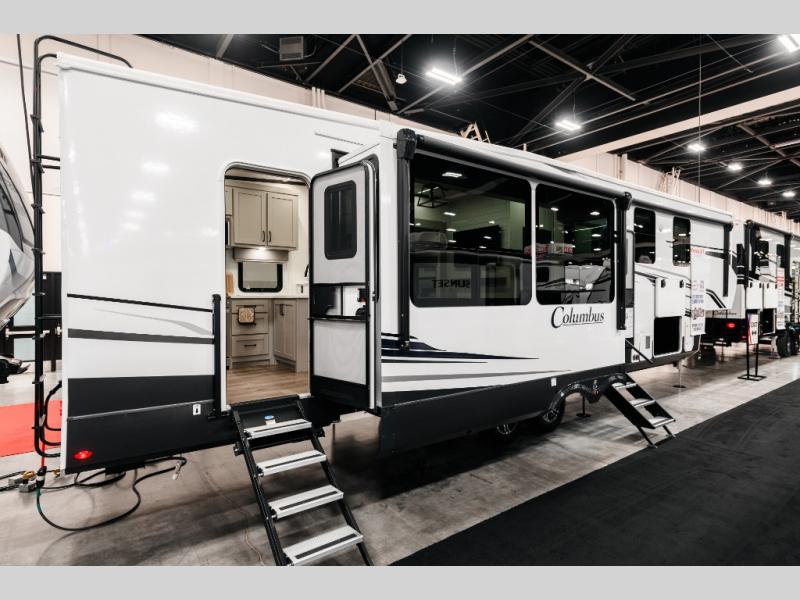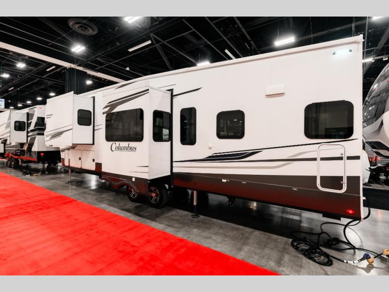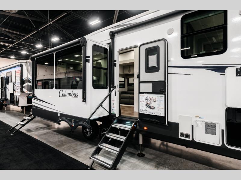 Experience a different camping life with residential furnishings and high end features in each one of these Palomino Columbus fifth wheels! The 101" wide body lets you walk around more throughout and the all-welded aluminum-frame superstructure has a snap-in ceiling molding to hold up through every adventure. Don't leave any of your gear behind either when you can easily store it in the climate controlled drop frame storage area. On the exterior, you'll find a heated utility convenience center, an outside sprayer to keep the dirt outside where it belongs, and magnetic compartment door holds to keep them from falling on you as you grab your items. Plus, there are some modern features that will really seal the deal like the Wi-Fi Booster with 4G LTE capability prep, upgraded true solid-surface countertops, power theater seating with USB charging, and a 260W solar panel for off-grid camping!