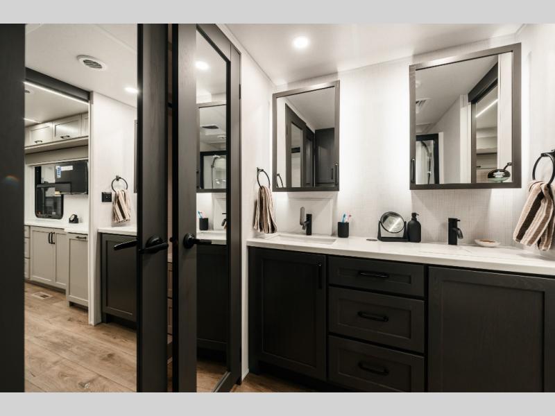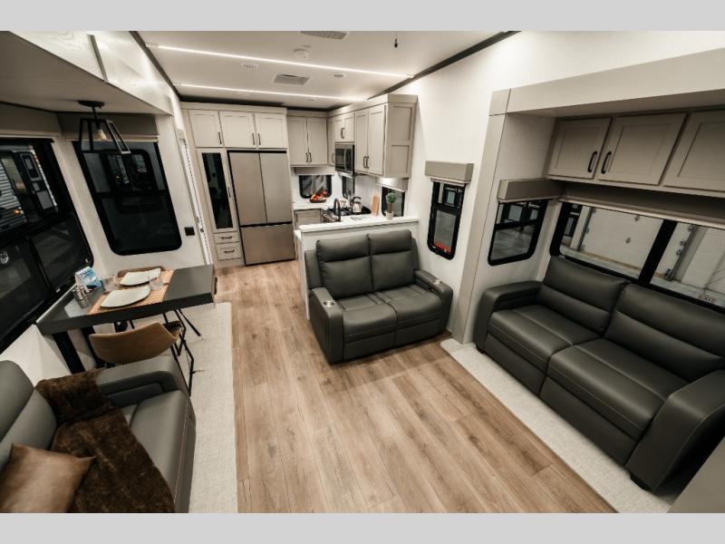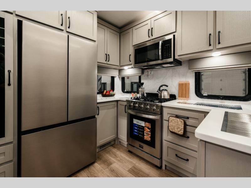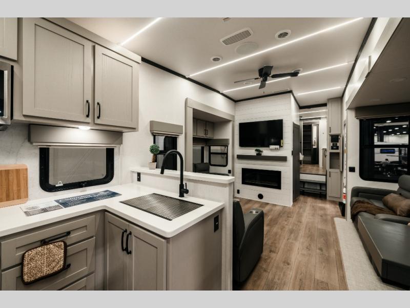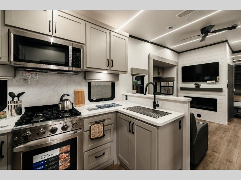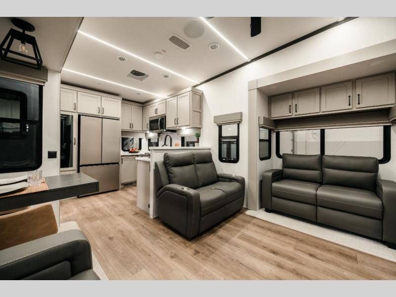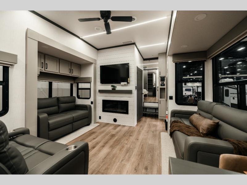 You won't believe all that this fifth wheel has to offer! Starting with the rear kitchen which has plenty of countertop space to prepare your delicious meals, a four burner cooktop with a stainless steel 24" oven to cook them, and a large single bowl stainless steel sink for easy clean up. The living area has opposing sofas and a theater seat with USB charging and storage across from an entertainment center with 50" Smart TV. The half bathroom is close to the living area so you can get back to watching your movie faster. You will feel right at home sleeping in the master suite on a slide out king bed across from a dresser and hamper to keep your space tidy, plus entrance into the front full bathroom. Inside the bathroom, you will find a vanity with dual sinks for two to get ready at once, a spacious shower with a seat, and a walk-in closet for clothes, shoes, and more!
