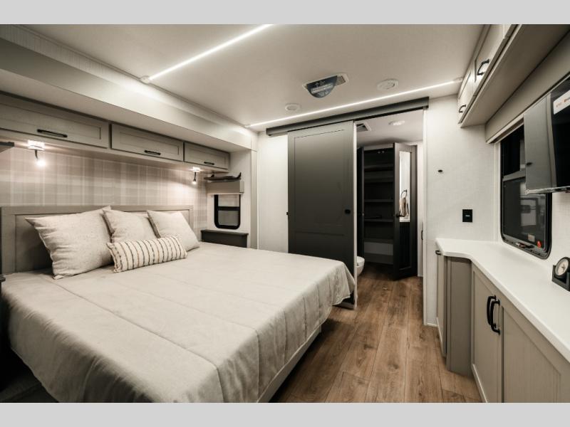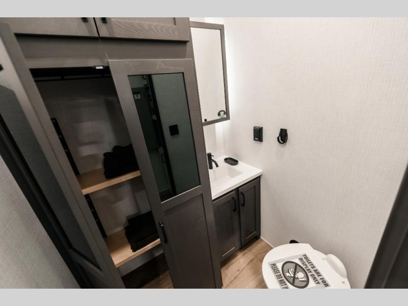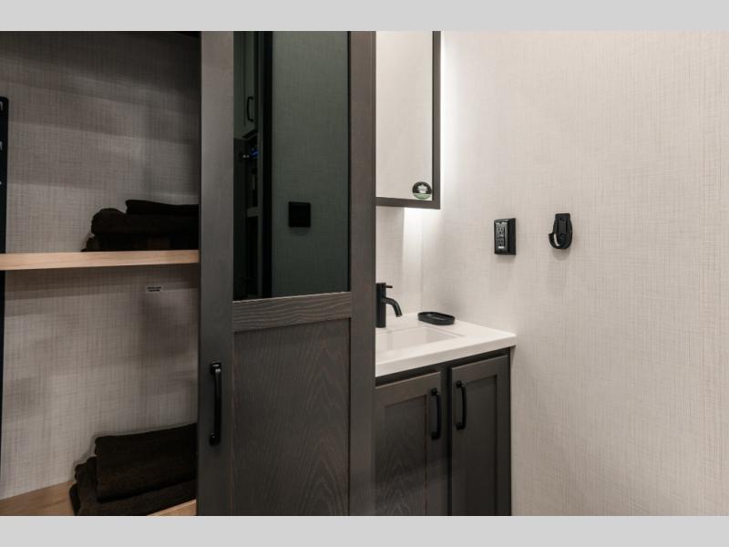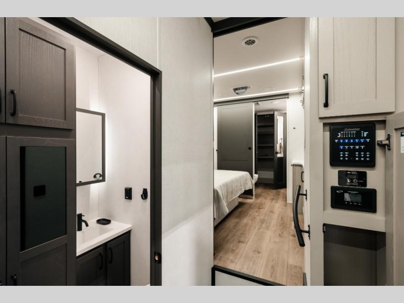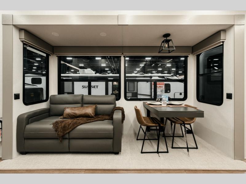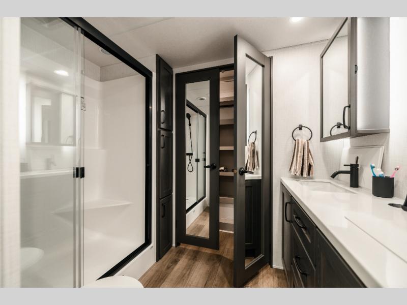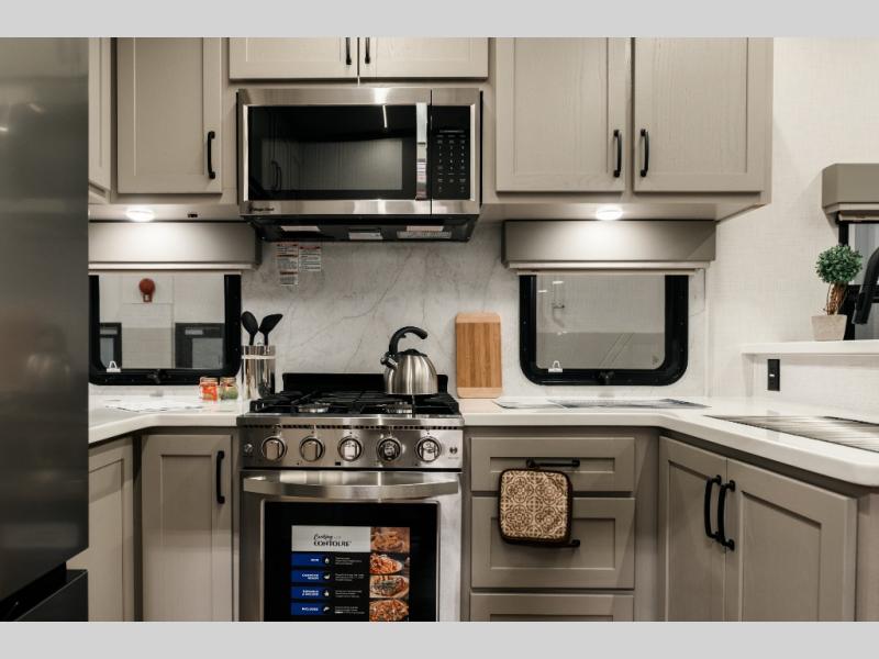 You won't believe all that this fifth wheel has to offer! Starting with the rear kitchen which has plenty of countertop space to prepare your delicious meals, a four burner cooktop with a stainless steel 24" oven to cook them, and a large single bowl stainless steel sink for easy clean up. The living area has opposing sofas and a theater seat with USB charging and storage across from an entertainment center with 50" Smart TV. The half bathroom is close to the living area so you can get back to watching your movie faster. You will feel right at home sleeping in the master suite on a slide out king bed across from a dresser and hamper to keep your space tidy, plus entrance into the front full bathroom. Inside the bathroom, you will find a vanity with dual sinks for two to get ready at once, a spacious shower with a seat, and a walk-in closet for clothes, shoes, and more!