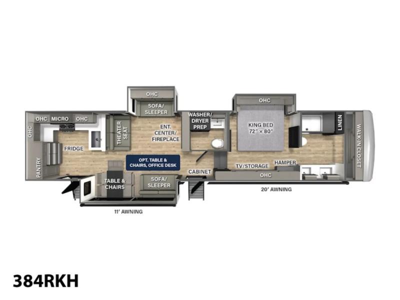 You won't believe all that this fifth wheel has to offer! Starting with the rear kitchen which has plenty of countertop space to prepare your delicious meals, a four burner cooktop with a stainless steel 24" oven to cook them, and a large single bowl stainless steel sink for easy clean up. The living area has opposing sofas and a theater seat with USB charging and storage across from an entertainment center with 50" Smart TV. The half bathroom is close to the living area so you can get back to watching your movie faster. You will feel right at home sleeping in the master suite on a slide out king bed across from a dresser and hamper to keep your space tidy, plus entrance into the front full bathroom. Inside the bathroom, you will find a vanity with dual sinks for two to get ready at once, a spacious shower with a seat, and a walk-in closet for clothes, shoes, and more!