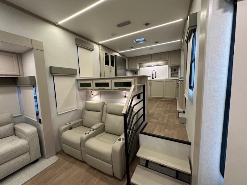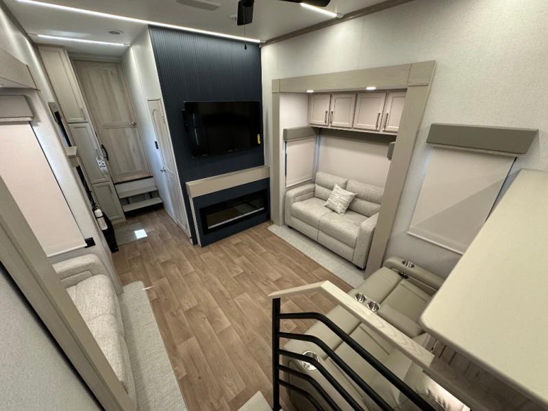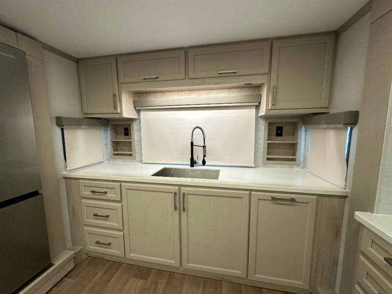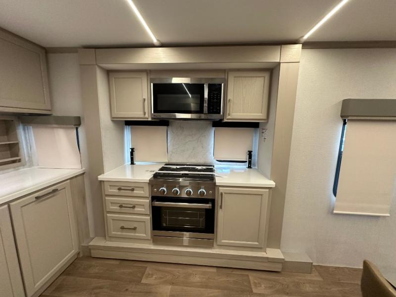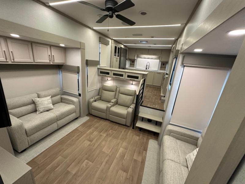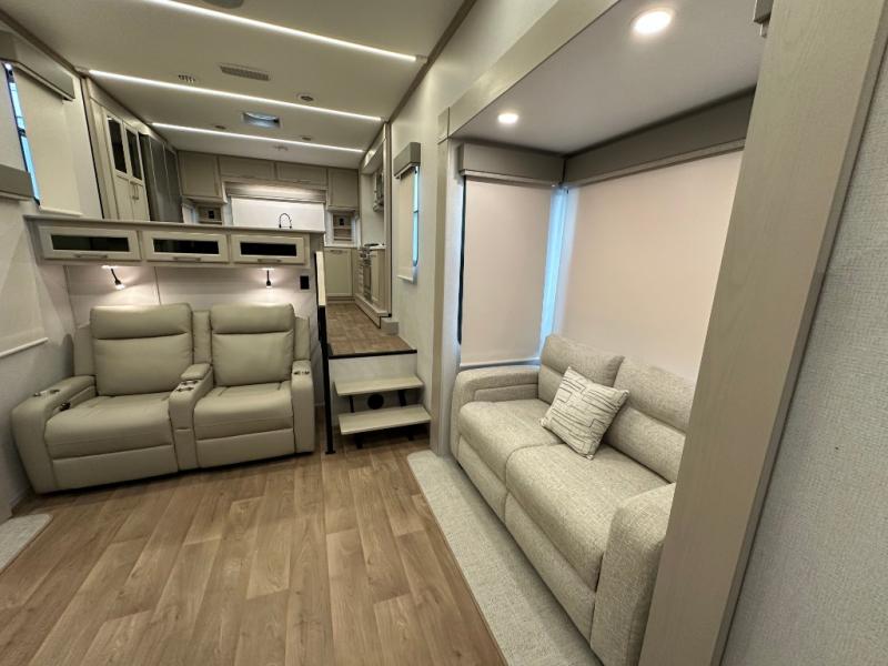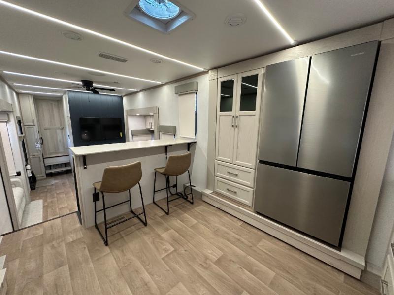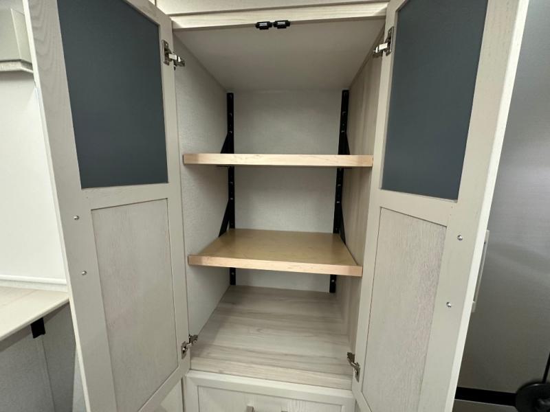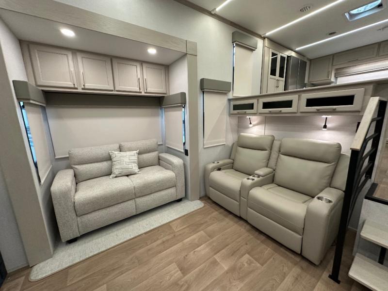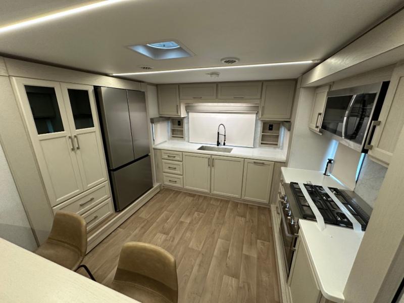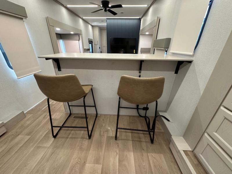 The front kitchen in this fifth wheel is a chef's dream come true while camping! There is generous counter space up front and beside the range, plus a pantry and 12V 18 cu. ft. 3-door refrigerator with ice. There is also a hi-top table with two bar stools that overlooks the living area. Inside the living area there are opposing sofa sleeper slides and power theater seating across from an entertainment center with a 50" Smart TV. A mid-coach half bath is easily accessible, and the full rear bath with dual bath sinks will create a master bedroom you are sure to love. There is a king bed slide out, a wardrobe, hamper, and a TV/storage.