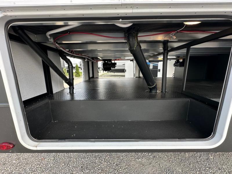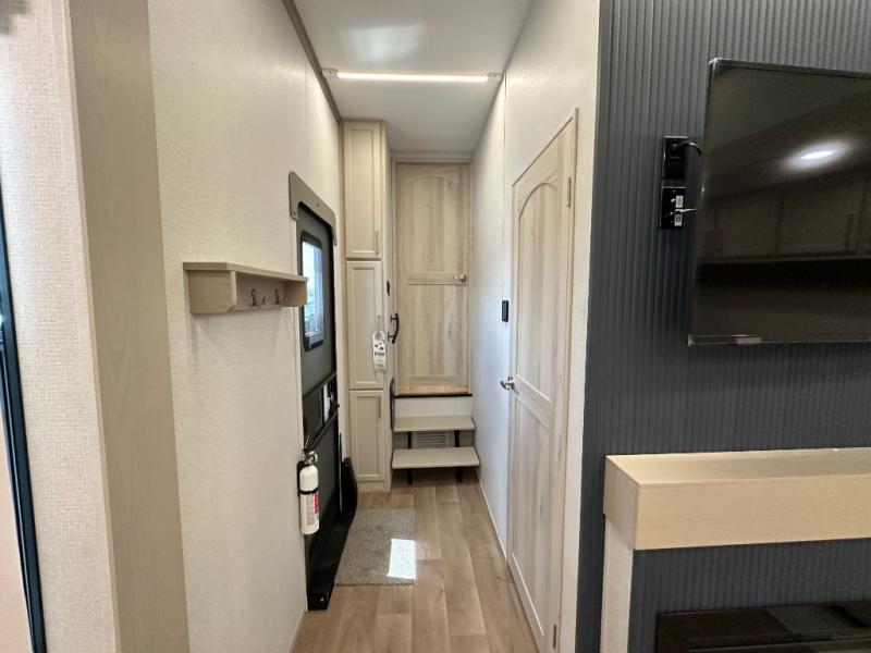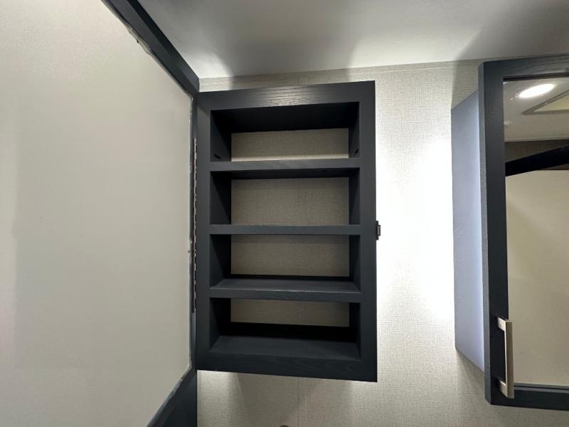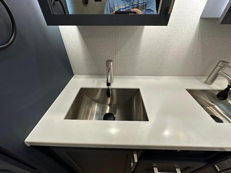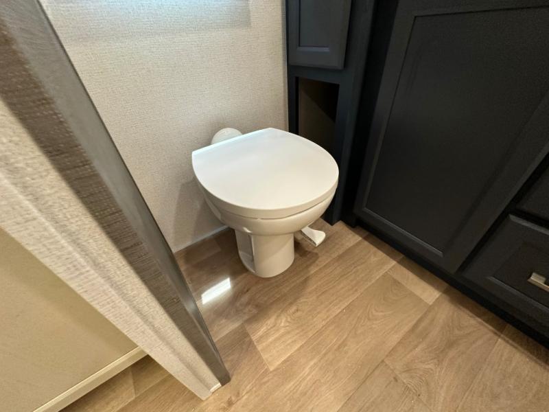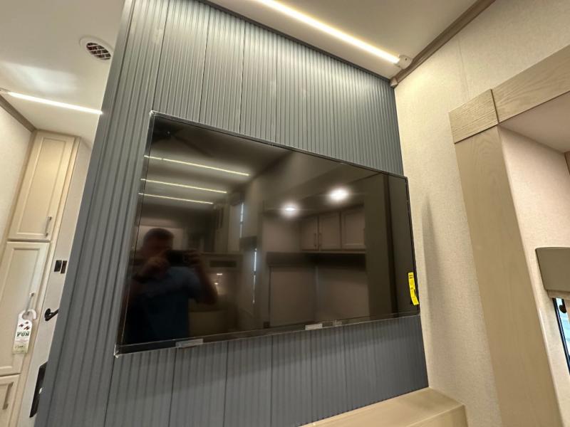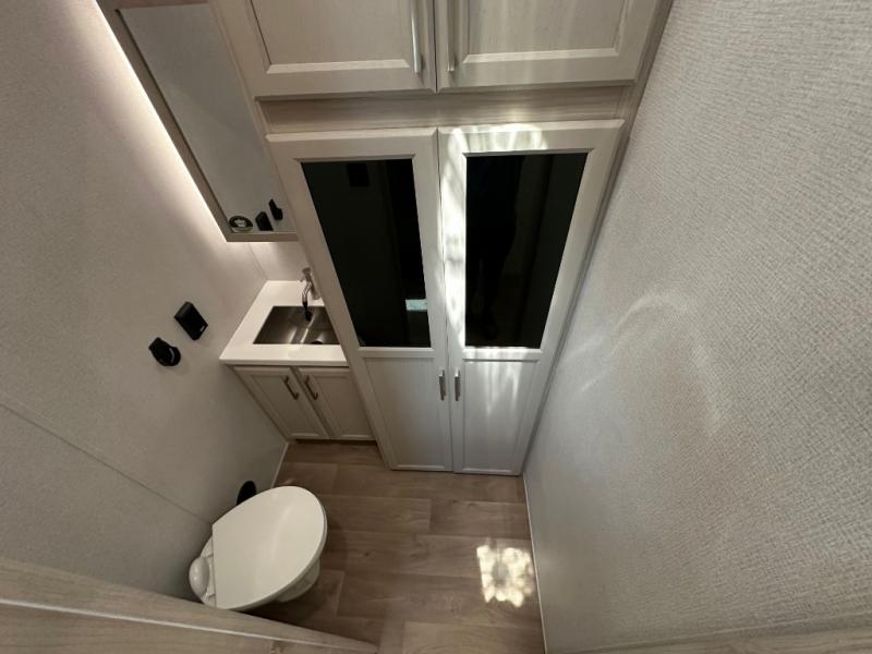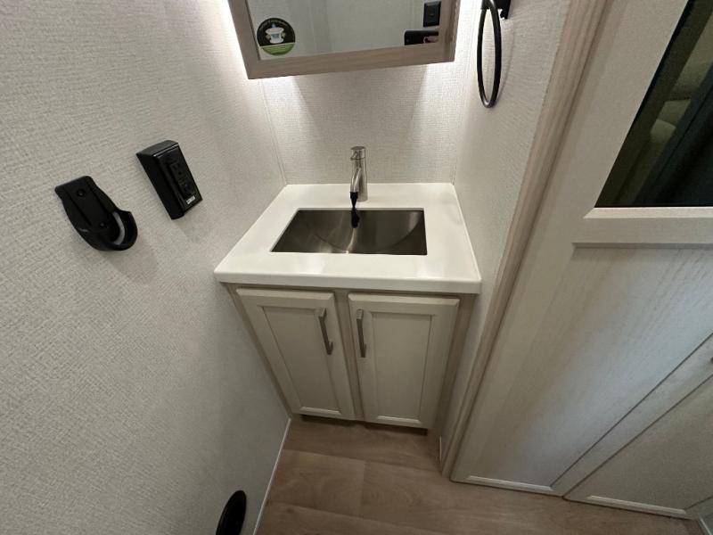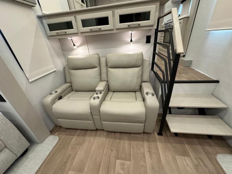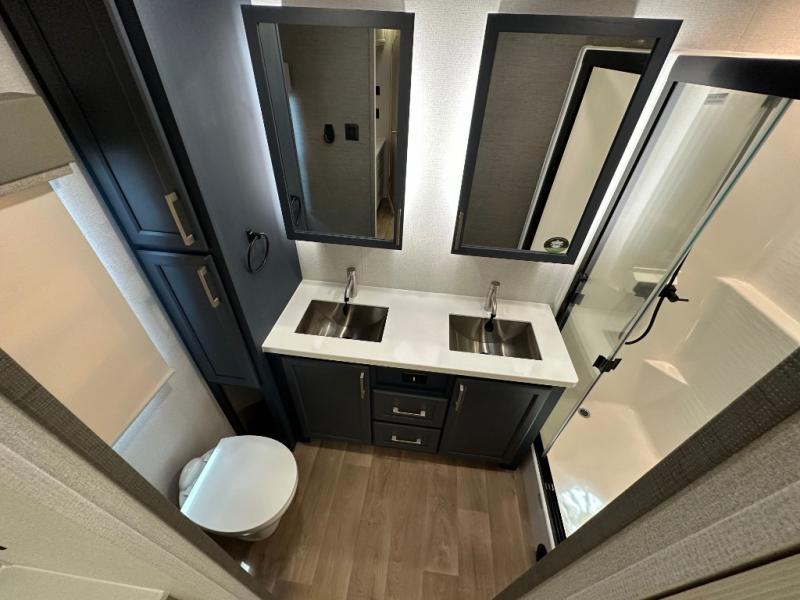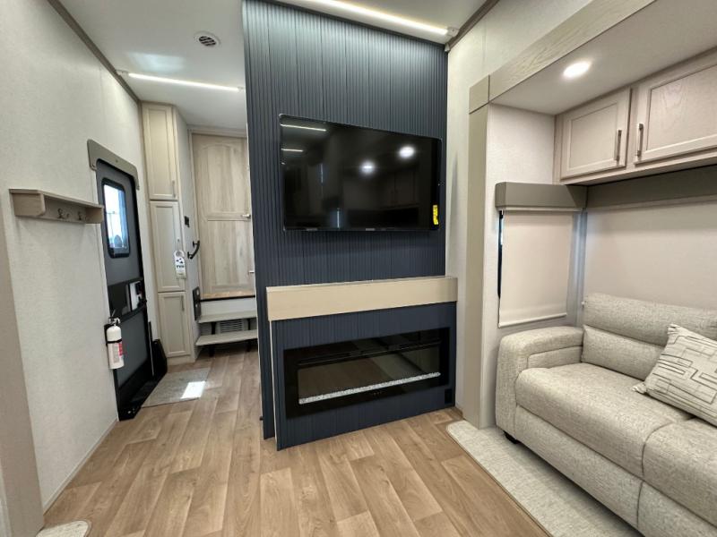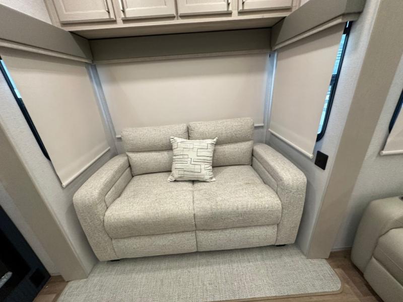 The front kitchen in this fifth wheel is a chef's dream come true while camping! There is generous counter space up front and beside the range, plus a pantry and 12V 18 cu. ft. 3-door refrigerator with ice. There is also a hi-top table with two bar stools that overlooks the living area. Inside the living area there are opposing sofa sleeper slides and power theater seating across from an entertainment center with a 50" Smart TV. A mid-coach half bath is easily accessible, and the full rear bath with dual bath sinks will create a master bedroom you are sure to love. There is a king bed slide out, a wardrobe, hamper, and a TV/storage.
