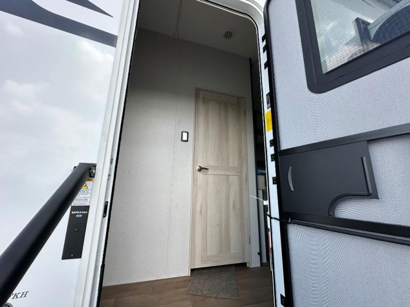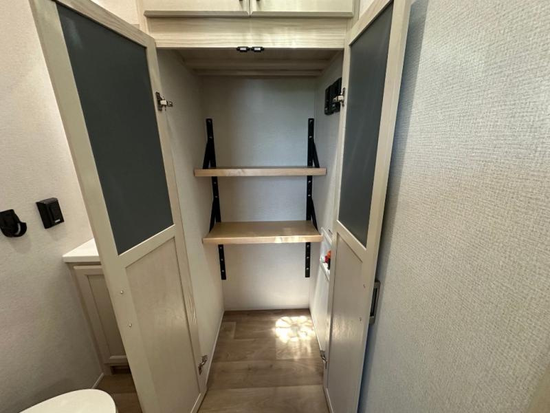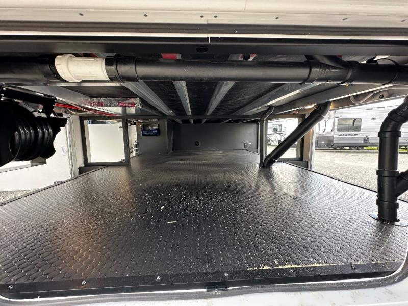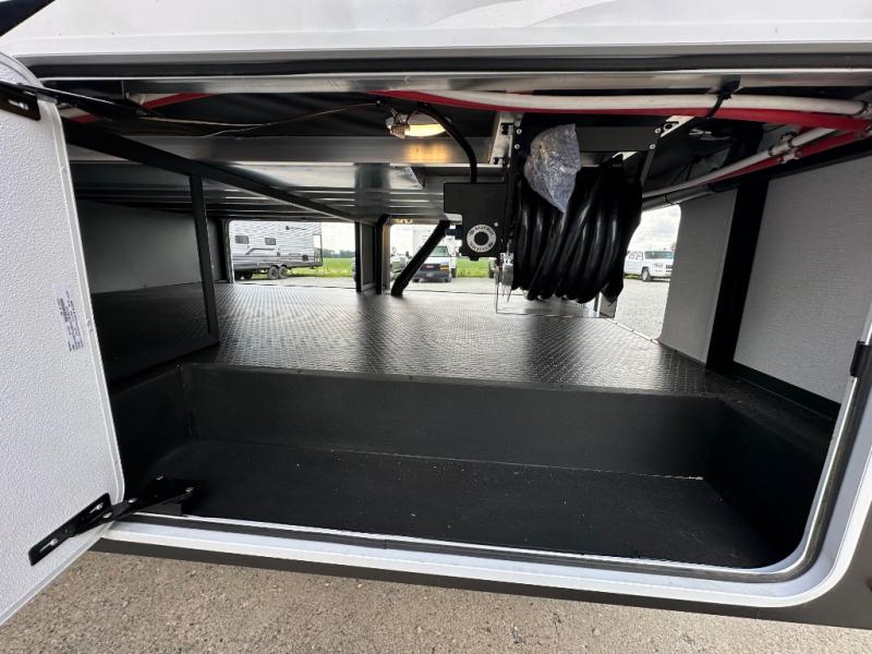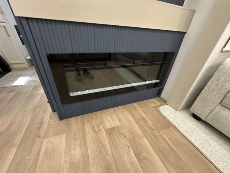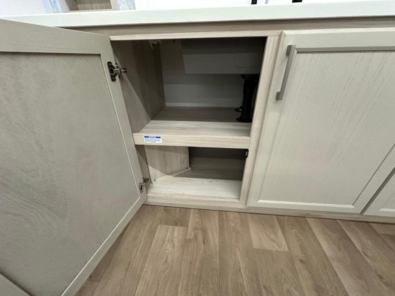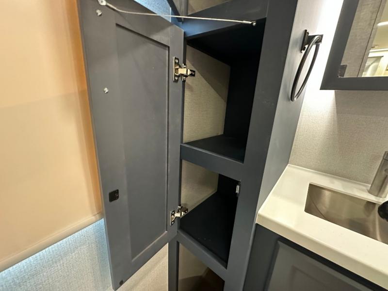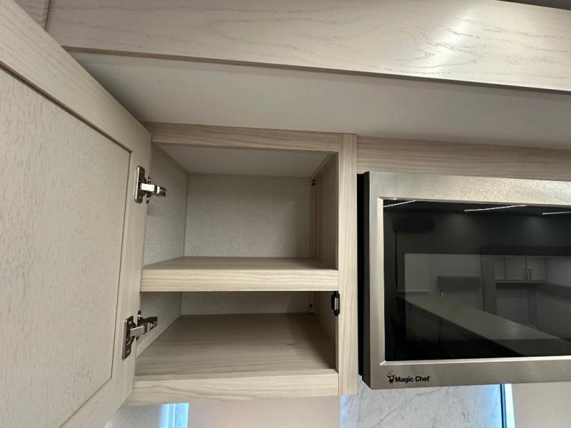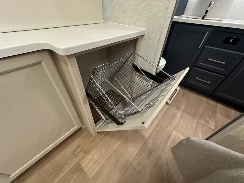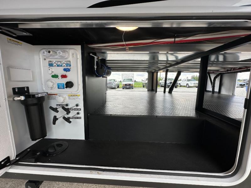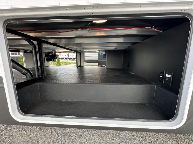 The front kitchen in this fifth wheel is a chef's dream come true while camping! There is generous counter space up front and beside the range, plus a pantry and 12V 18 cu. ft. 3-door refrigerator with ice. There is also a hi-top table with two bar stools that overlooks the living area. Inside the living area there are opposing sofa sleeper slides and power theater seating across from an entertainment center with a 50" Smart TV. A mid-coach half bath is easily accessible, and the full rear bath with dual bath sinks will create a master bedroom you are sure to love. There is a king bed slide out, a wardrobe, hamper, and a TV/storage.