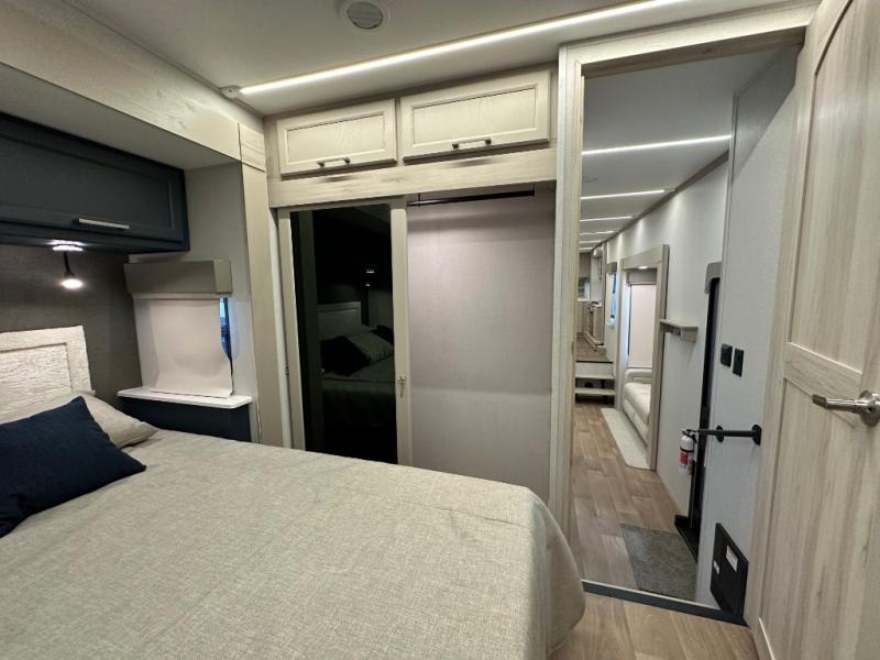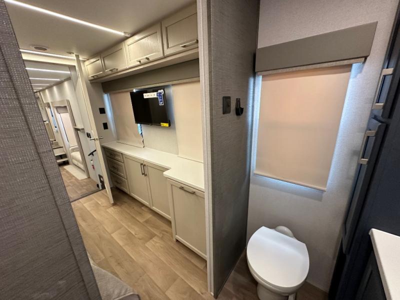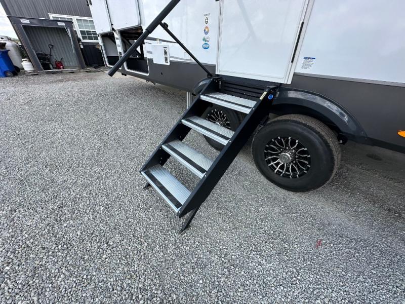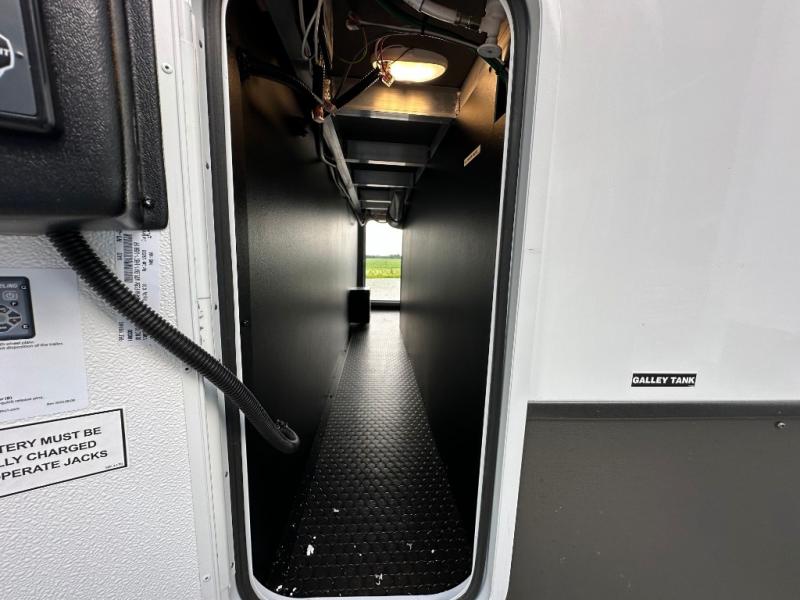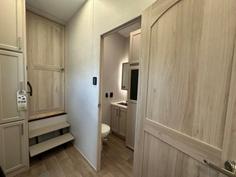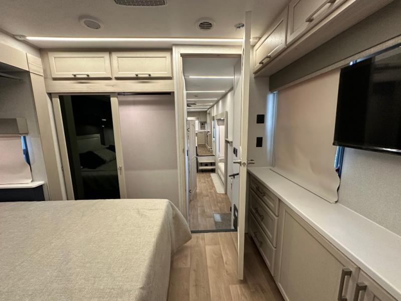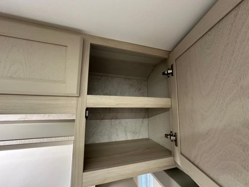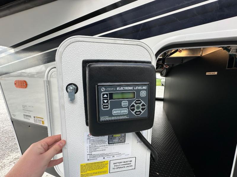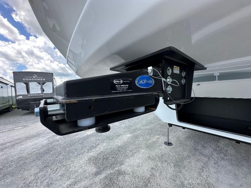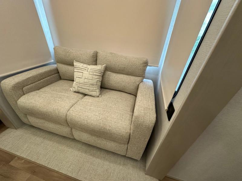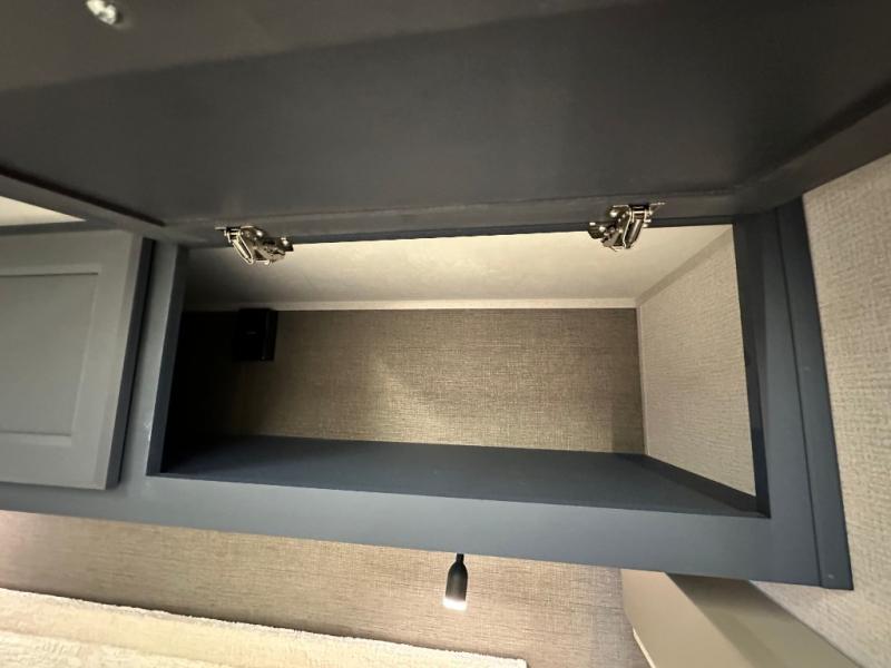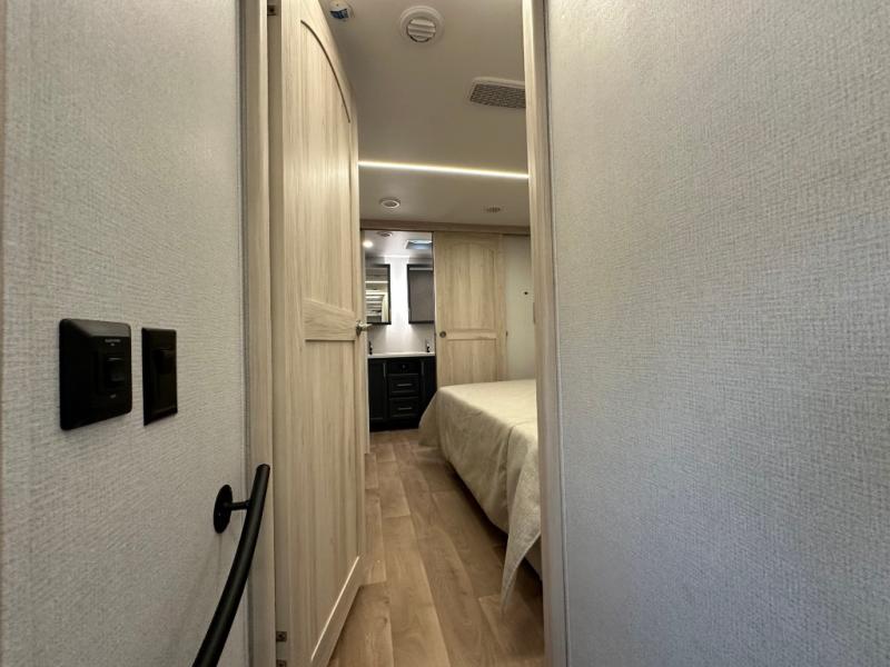 The front kitchen in this fifth wheel is a chef's dream come true while camping! There is generous counter space up front and beside the range, plus a pantry and 12V 18 cu. ft. 3-door refrigerator with ice. There is also a hi-top table with two bar stools that overlooks the living area. Inside the living area there are opposing sofa sleeper slides and power theater seating across from an entertainment center with a 50" Smart TV. A mid-coach half bath is easily accessible, and the full rear bath with dual bath sinks will create a master bedroom you are sure to love. There is a king bed slide out, a wardrobe, hamper, and a TV/storage.