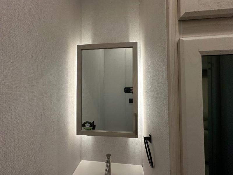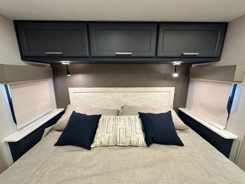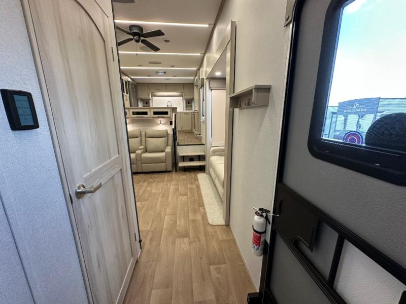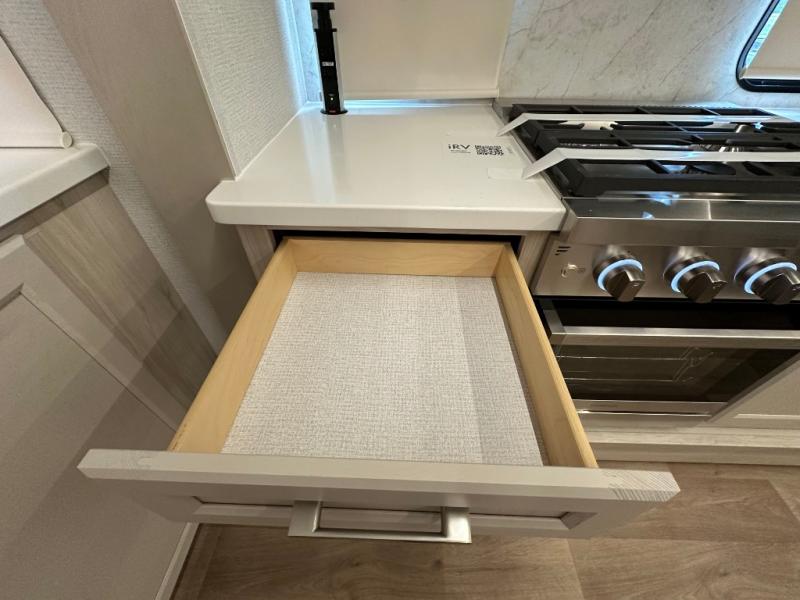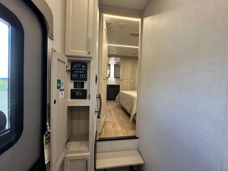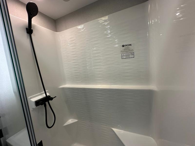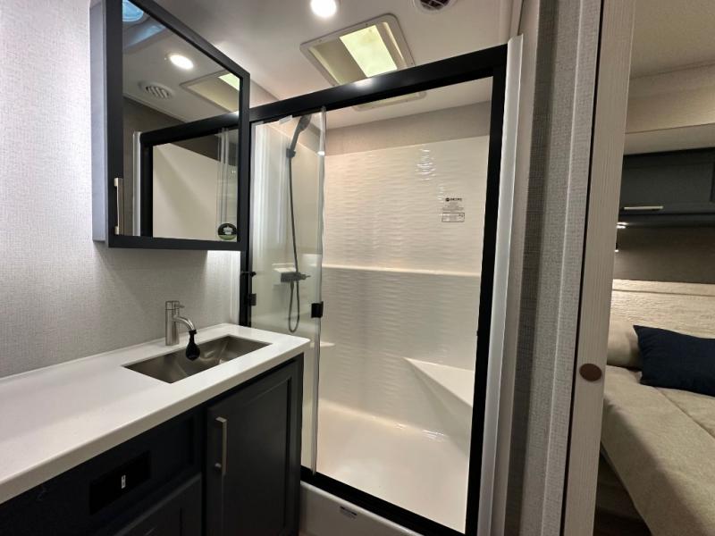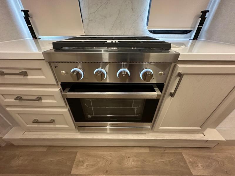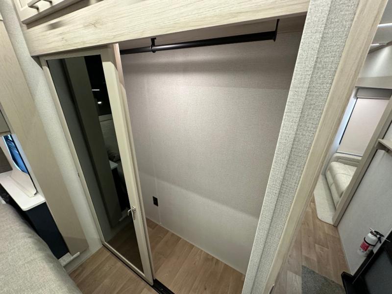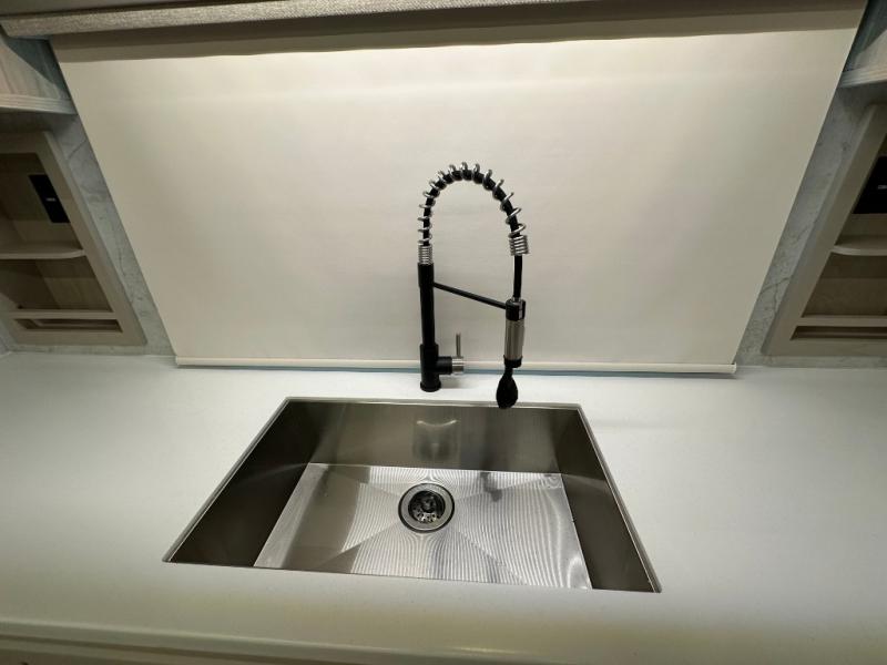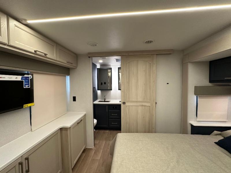 The front kitchen in this fifth wheel is a chef's dream come true while camping! There is generous counter space up front and beside the range, plus a pantry and 12V 18 cu. ft. 3-door refrigerator with ice. There is also a hi-top table with two bar stools that overlooks the living area. Inside the living area there are opposing sofa sleeper slides and power theater seating across from an entertainment center with a 50" Smart TV. A mid-coach half bath is easily accessible, and the full rear bath with dual bath sinks will create a master bedroom you are sure to love. There is a king bed slide out, a wardrobe, hamper, and a TV/storage.