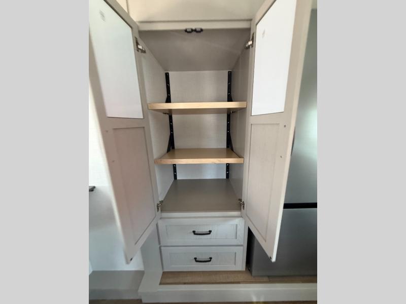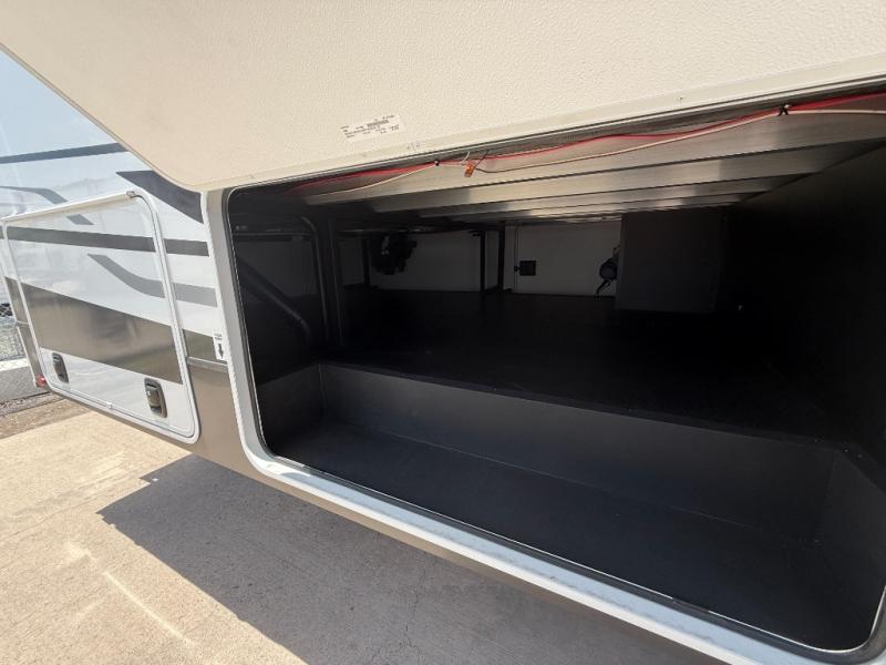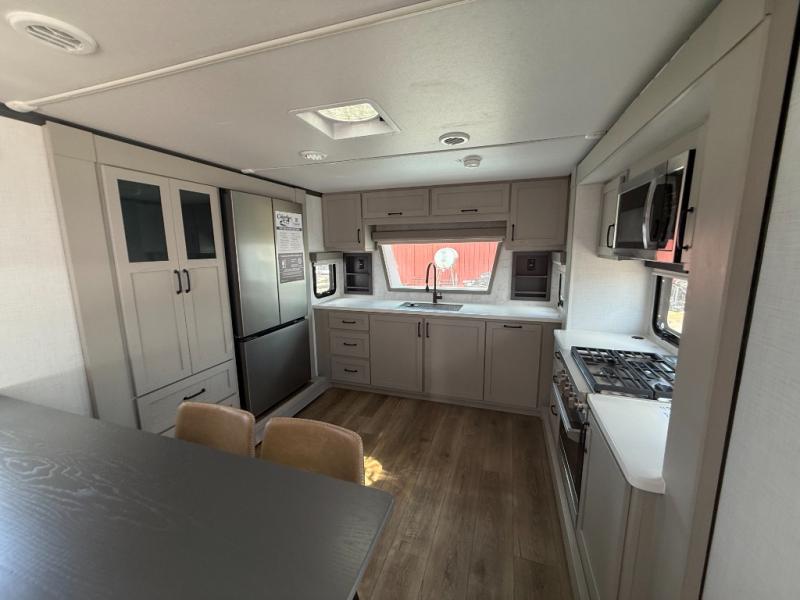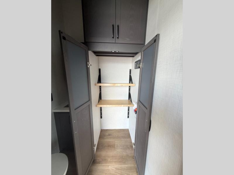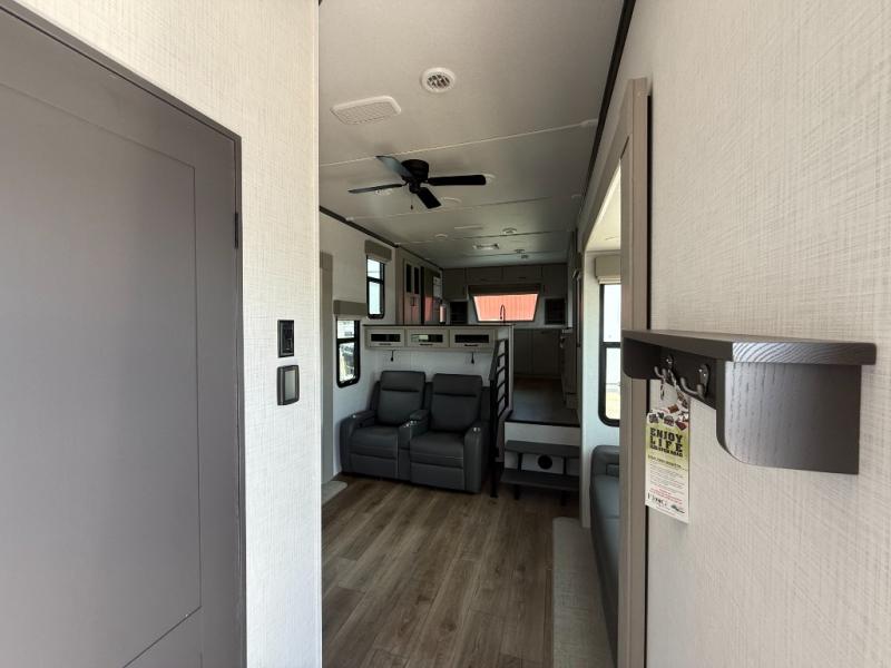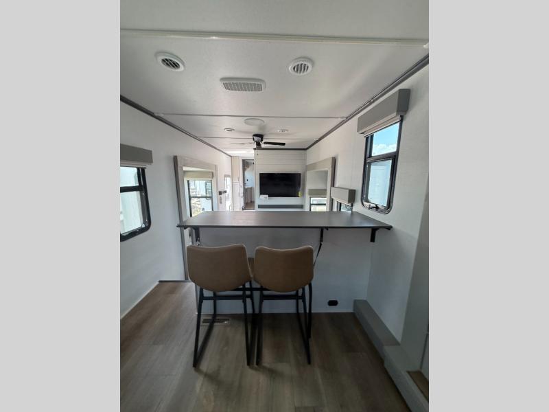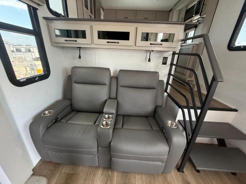 The front kitchen in this fifth wheel is a chef's dream come true while camping! There is generous counter space up front and beside the range, plus a pantry and 12V 18 cu. ft. 3-door refrigerator with ice. There is also a hi-top table with two bar stools that overlooks the living area. Inside the living area there are opposing sofa sleeper slides and power theater seating across from an entertainment center with a 50" Smart TV. A mid-coach half bath is easily accessible, and the full rear bath with dual bath sinks will create a master bedroom you are sure to love. There is a king bed slide out, a wardrobe, hamper, and a TV/storage.