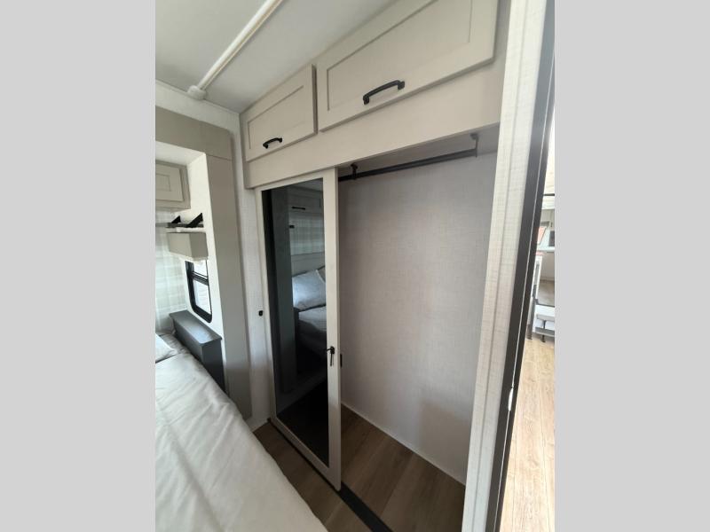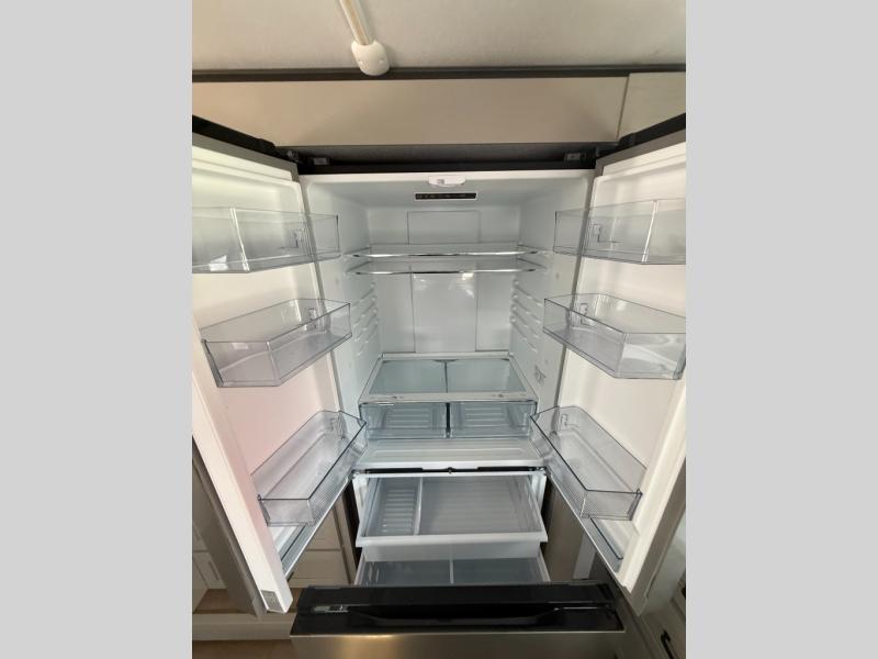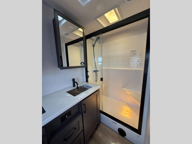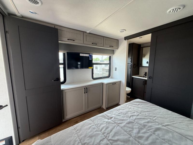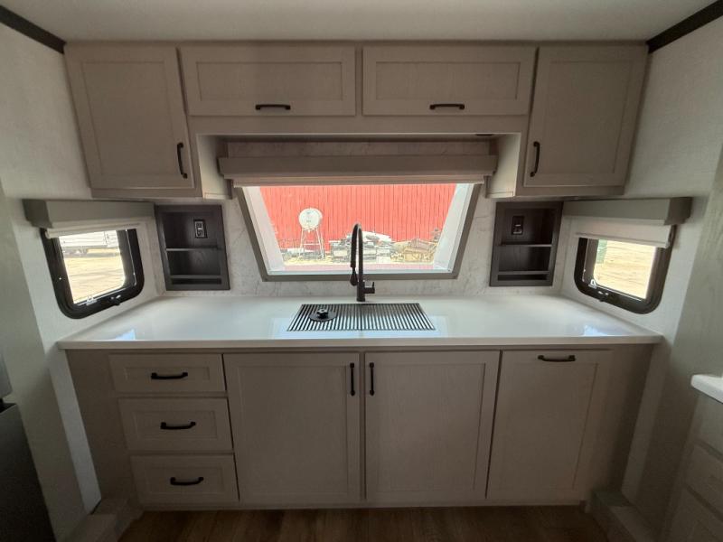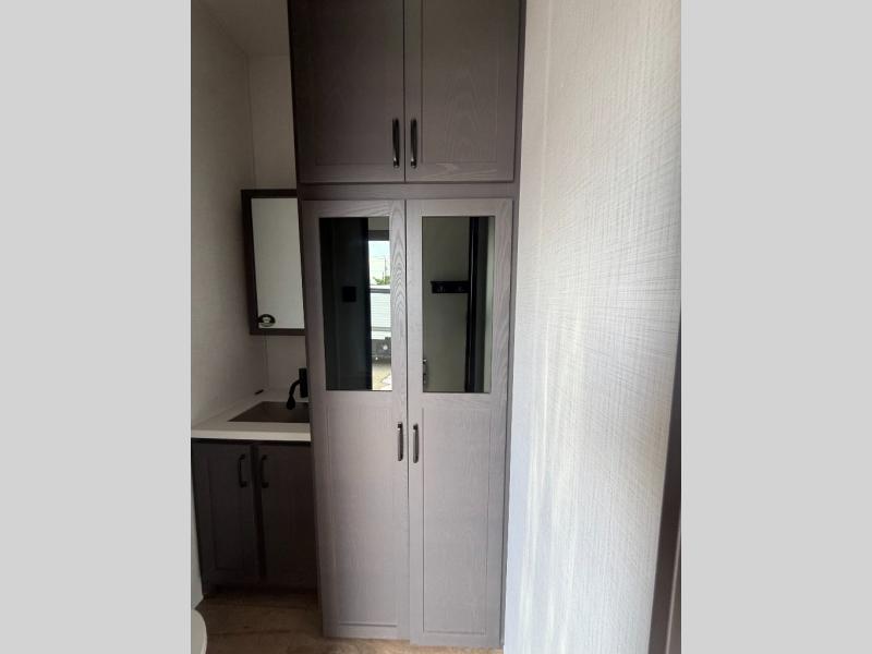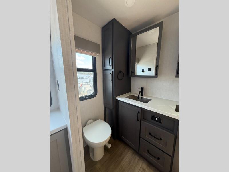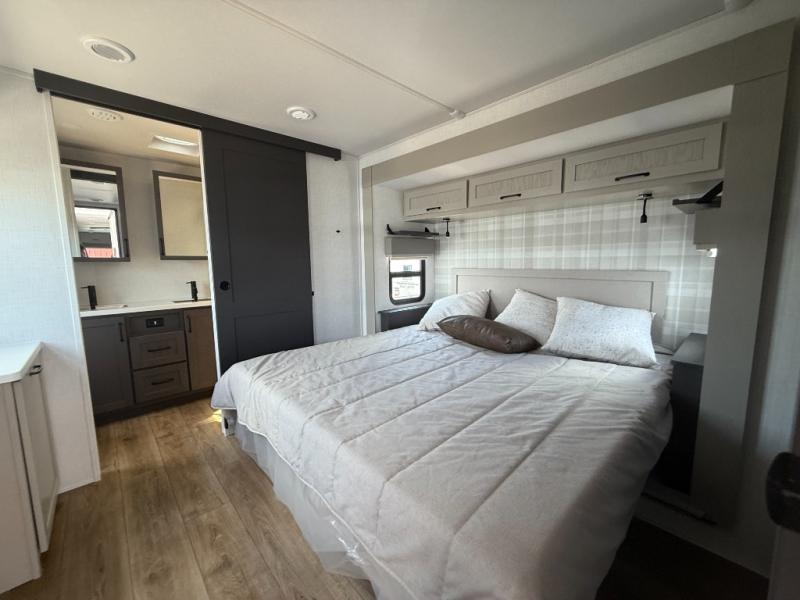 The front kitchen in this fifth wheel is a chef's dream come true while camping! There is generous counter space up front and beside the range, plus a pantry and 12V 18 cu. ft. 3-door refrigerator with ice. There is also a hi-top table with two bar stools that overlooks the living area. Inside the living area there are opposing sofa sleeper slides and power theater seating across from an entertainment center with a 50" Smart TV. A mid-coach half bath is easily accessible, and the full rear bath with dual bath sinks will create a master bedroom you are sure to love. There is a king bed slide out, a wardrobe, hamper, and a TV/storage.