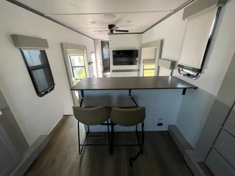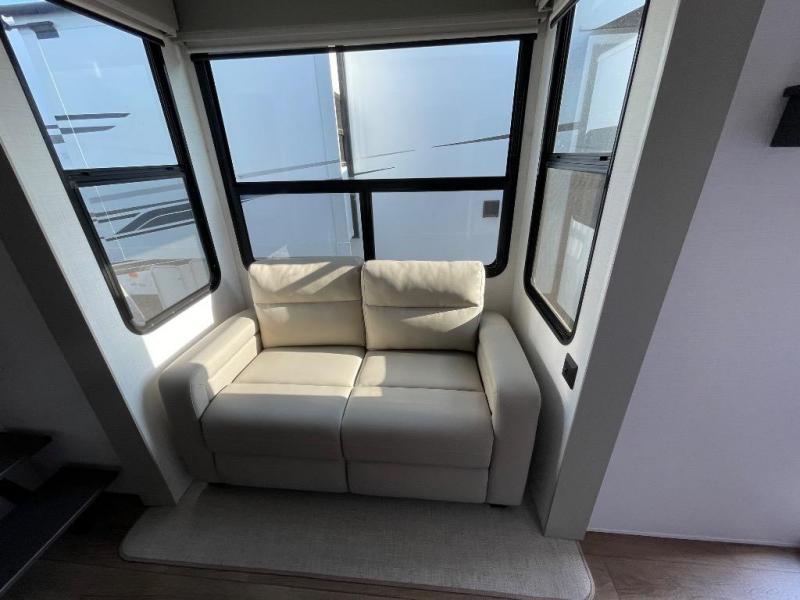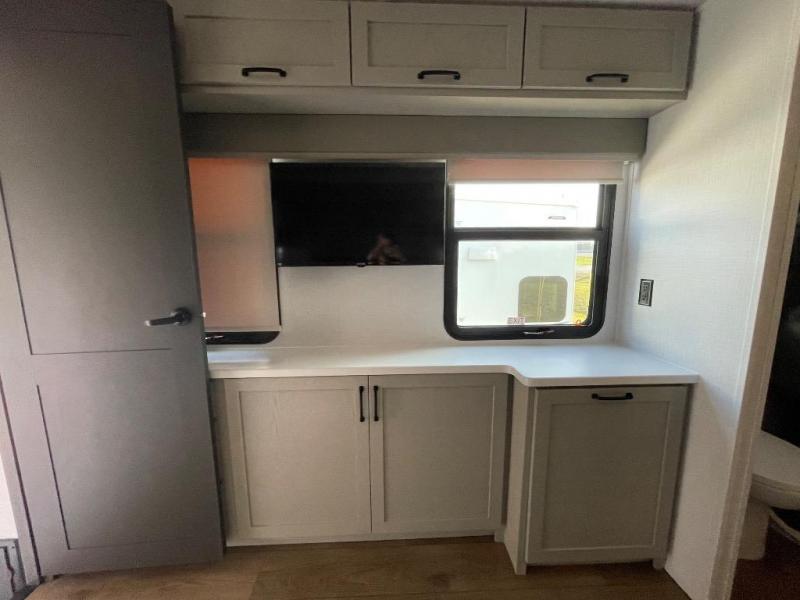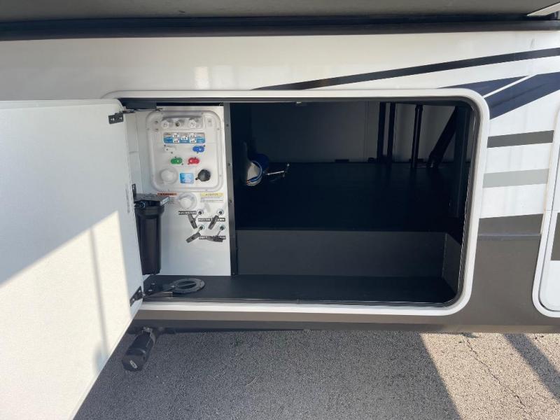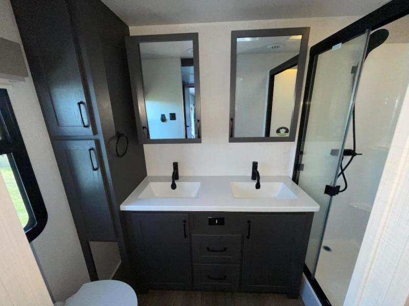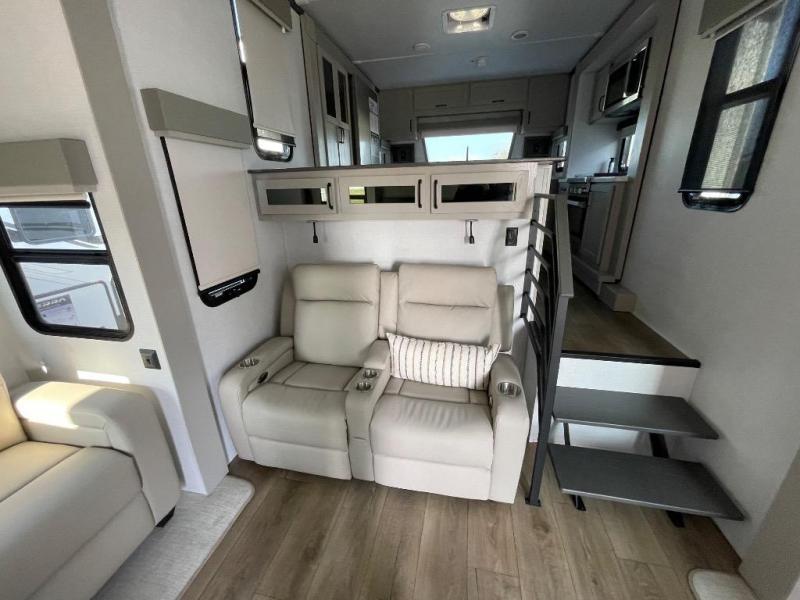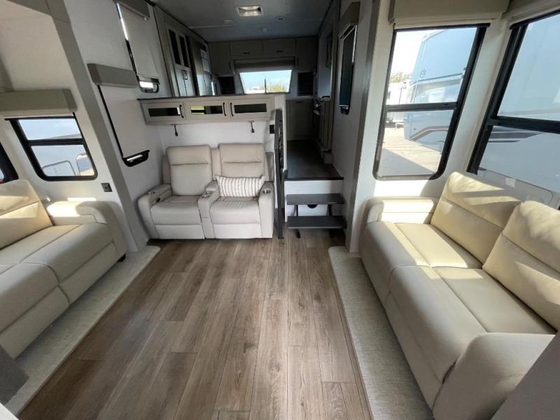 The front kitchen in this fifth wheel is a chef's dream come true while camping! There is generous counter space up front and beside the range, plus a pantry and 12V 18 cu. ft. 3-door refrigerator with ice. There is also a hi-top table with two bar stools that overlooks the living area. Inside the living area there are opposing sofa sleeper slides and power theater seating across from an entertainment center with a 50" Smart TV. A mid-coach half bath is easily accessible, and the full rear bath with dual bath sinks will create a master bedroom you are sure to love. There is a king bed slide out, a wardrobe, hamper, and a TV/storage.