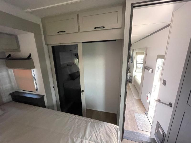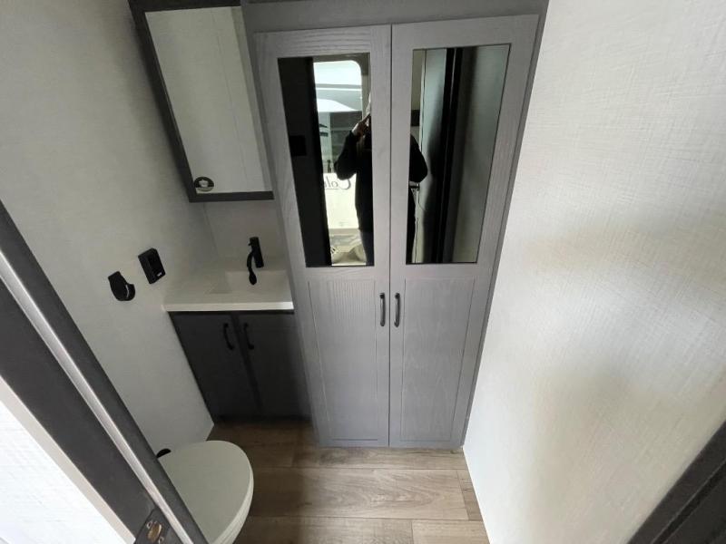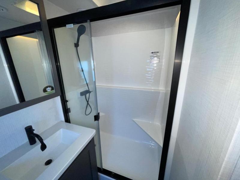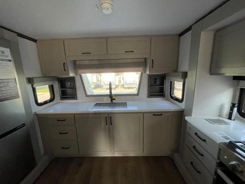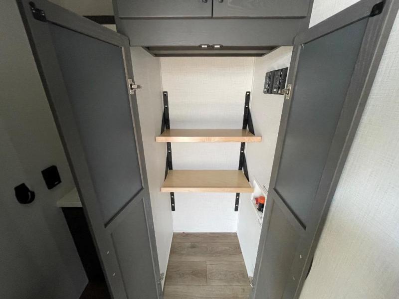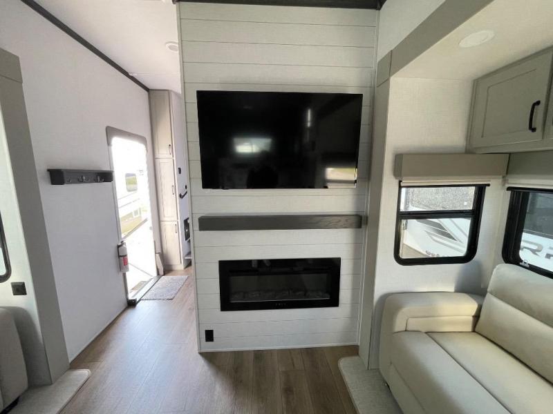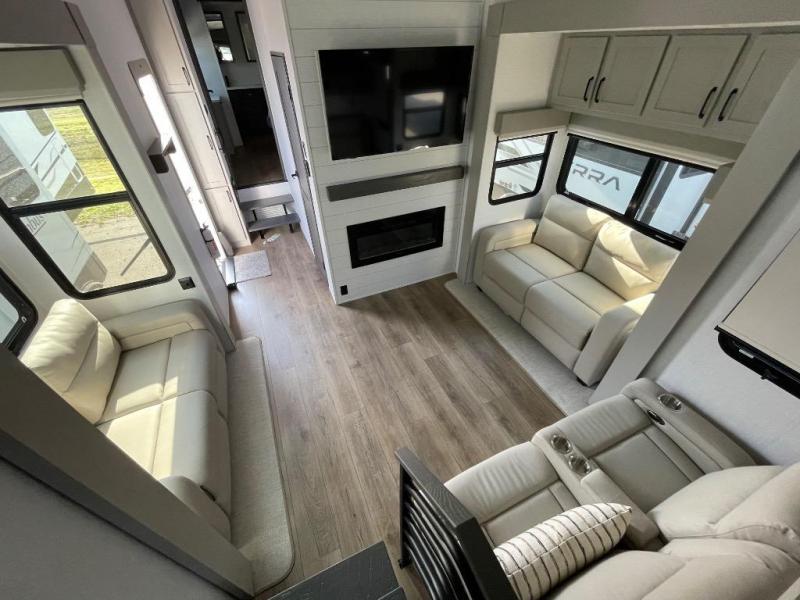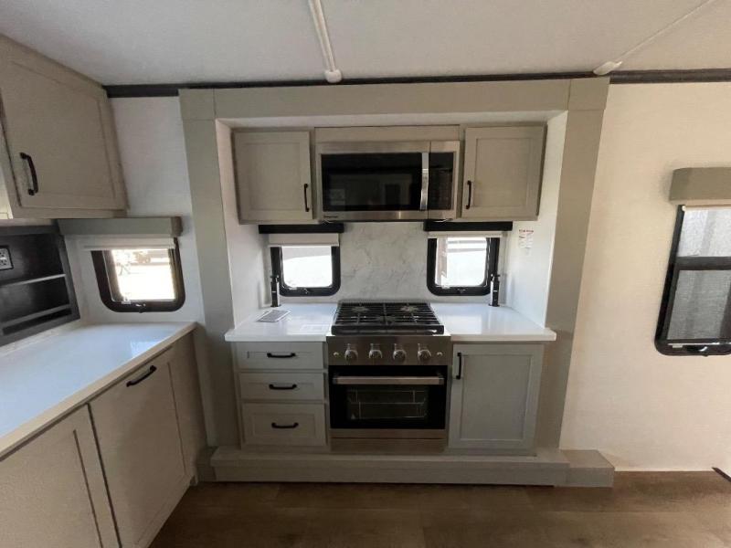 The front kitchen in this fifth wheel is a chef's dream come true while camping! There is generous counter space up front and beside the range, plus a pantry and 12V 18 cu. ft. 3-door refrigerator with ice. There is also a hi-top table with two bar stools that overlooks the living area. Inside the living area there are opposing sofa sleeper slides and power theater seating across from an entertainment center with a 50" Smart TV. A mid-coach half bath is easily accessible, and the full rear bath with dual bath sinks will create a master bedroom you are sure to love. There is a king bed slide out, a wardrobe, hamper, and a TV/storage.