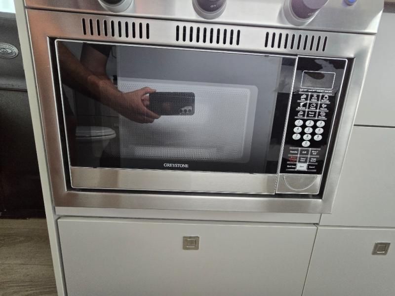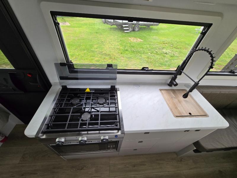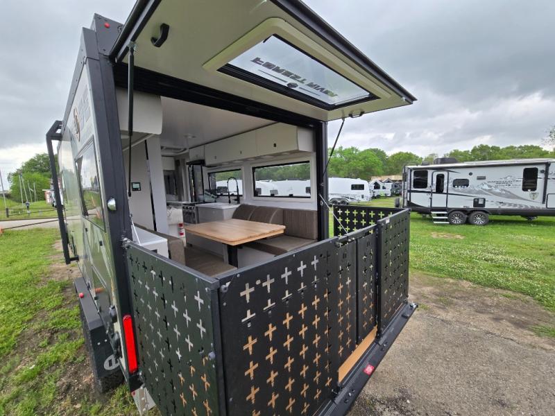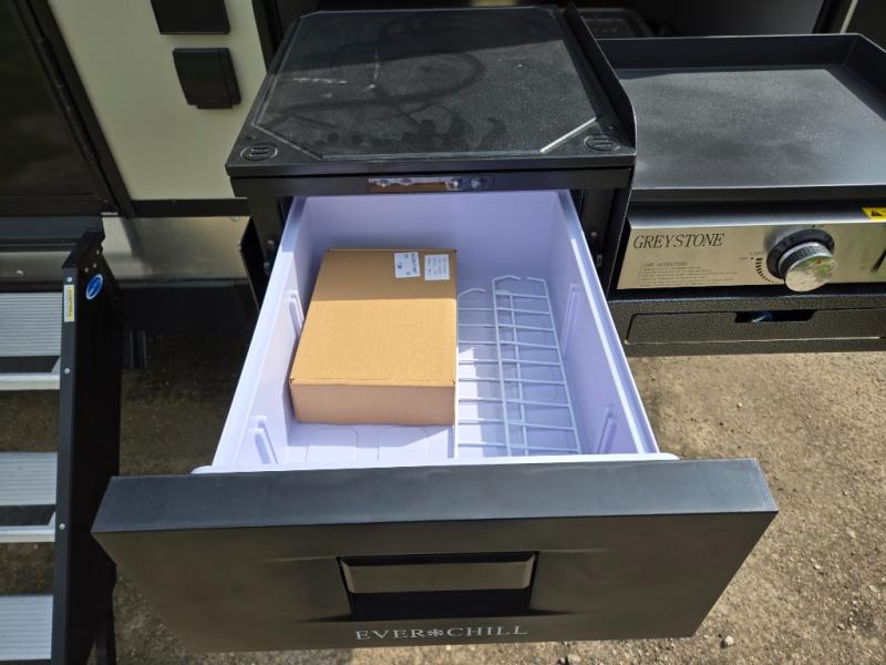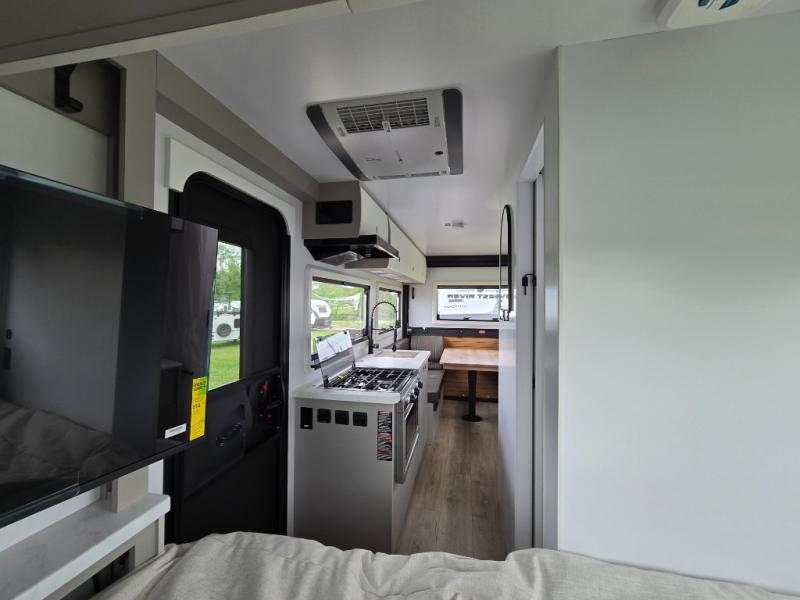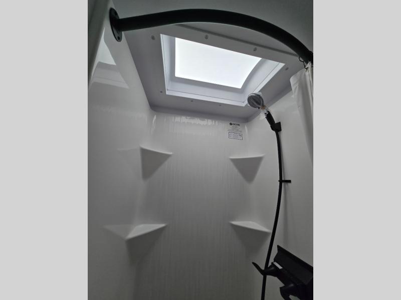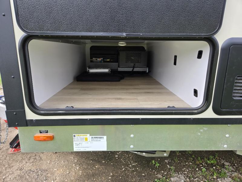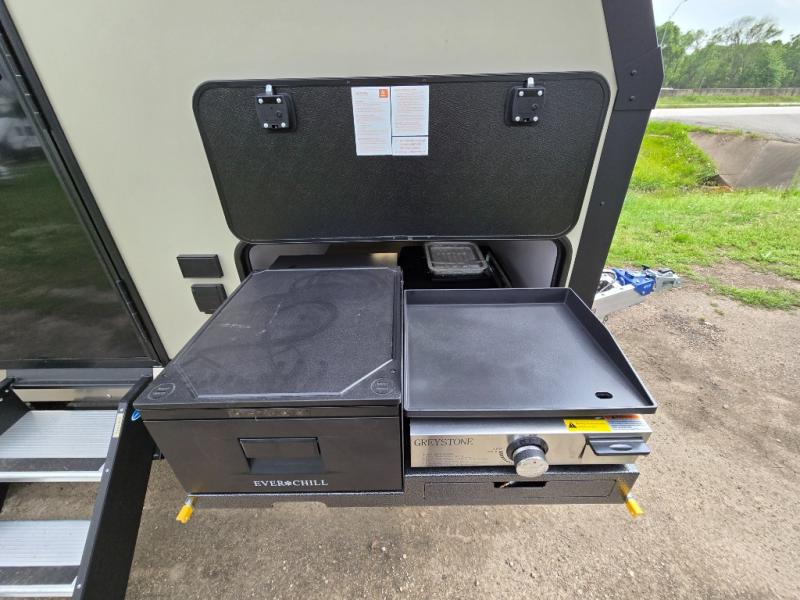 Plan to do and see it all in this travel trailer for four! There is a front queen bed with a 39" Smart TV at the foot of the bed so you can watch movies at night. The full bath will let you freshen up after a day outdoors, and the full kitchen includes a three burner cooktop with a built-in convection microwave to make meal time easier than ever. The dual opposing sofas in the back provide seating and additional sleeping space, and there is a large overhead cabinet to keep personal belongings tucked out of the way. The best feature on this unit is probably the rear fold-down deck where you can let fresh air in and visit with campground neighbors!