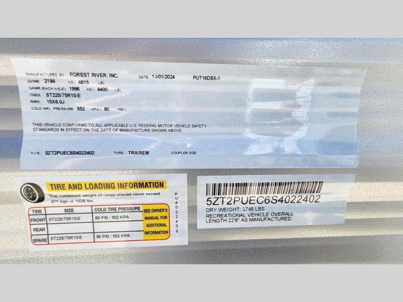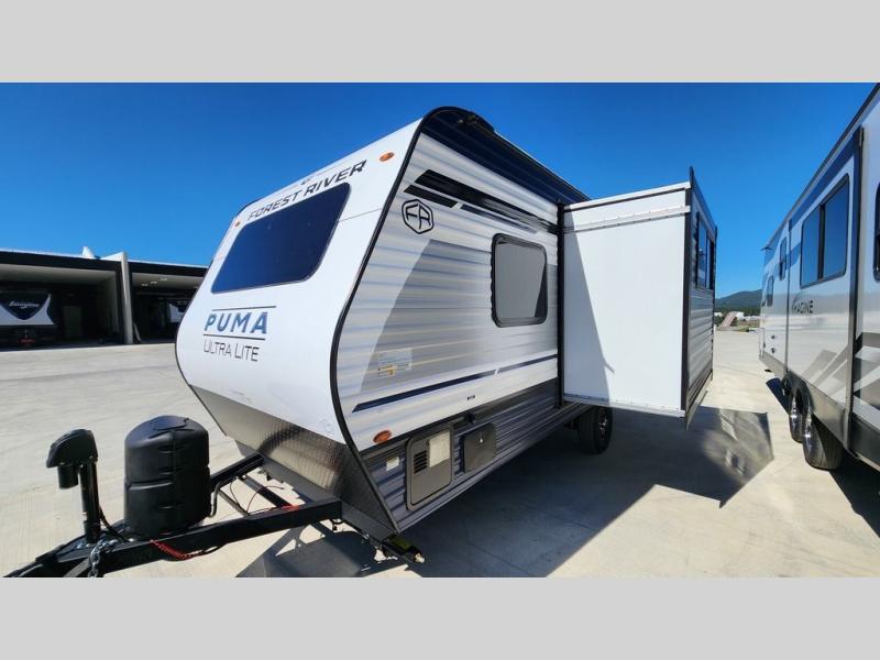 With any Puma Ultra Lite travel trailer by Palomino, you will experience a lighter weight RV that is eco-friendly and offers great fuel efficiency with maximum towability. The exterior offers front diamond plate, a power tongue jack, back-up camera prep, and an electric awning with an LED light strip. There is also a 30 Amp converter, two exterior speakers, and a spare tire and carrier for added convenience. You'll love the interior with its Congoleum linoleum, LED lighting, bath skylight, and a bedspread with shams for a more at-home feel!