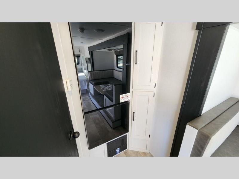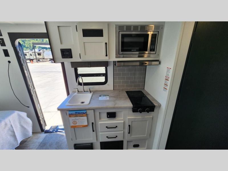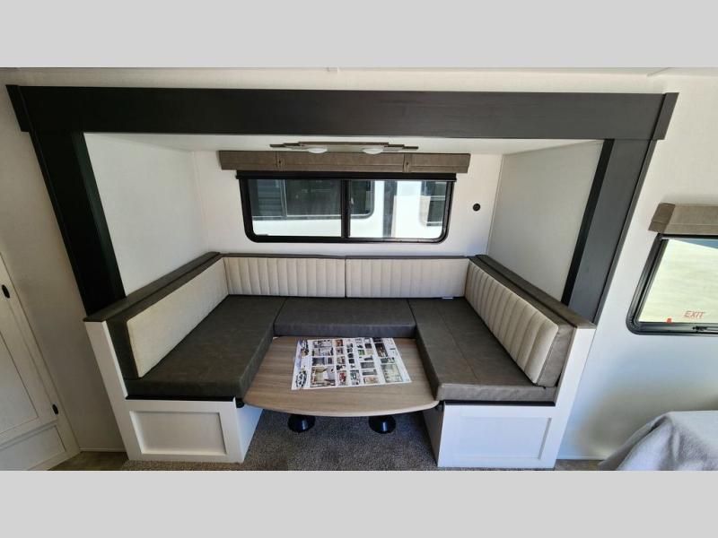 Wherever you decide to camp, this travel trailer is sure to bring comfort! The U-shaped dinette slide offers a window, dining for four, plus a great place to play games, relax and even sleep two when needed. The extra floor space gives you access to the walk-around RV queen bed with shirt closets on each side, the kitchen with a stainless steel microwave and cooktop, plus the pantry next to the 12V refrigerator. And you can change clothes and get cleaned up in the bathroom with a tub/shower.