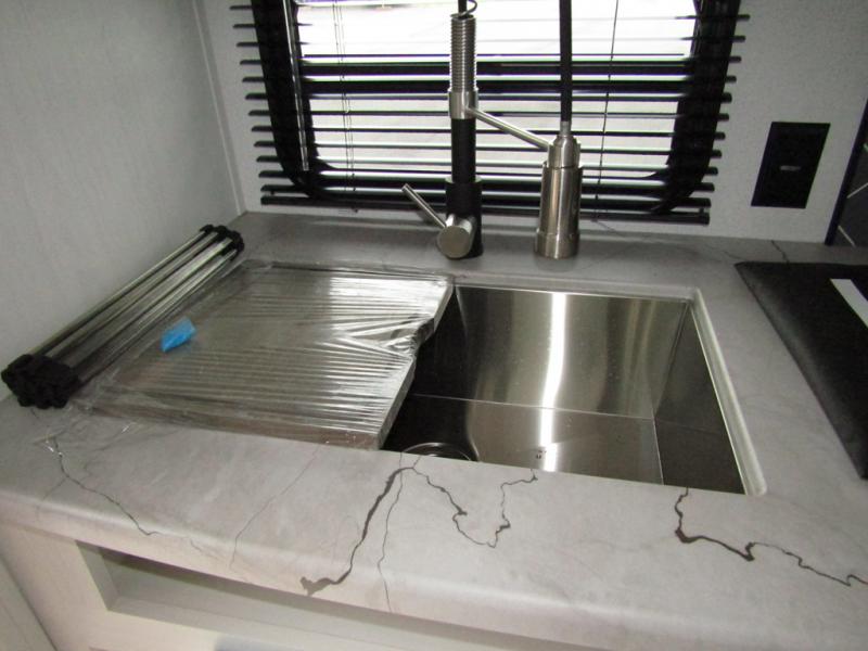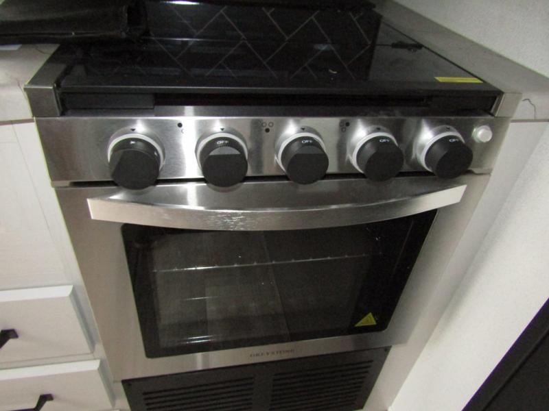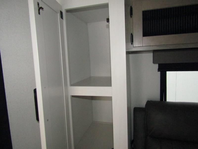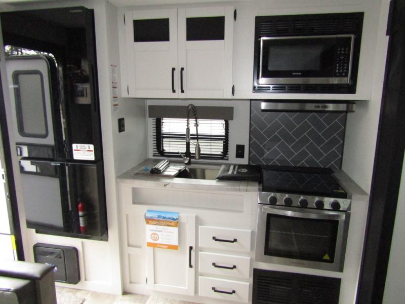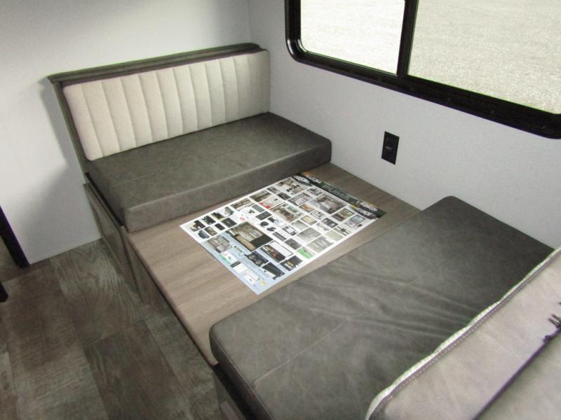 This rear kitchen travel trailer will be perfect for camping trips to the lake or woods! Once you've made breakfast on the stainless steel oven and range, you can dine at the booth dinette or take your plate outdoors to sit under the 18' electric awning. There is also a sofa slide out inside for a comfy place to relax. The walk-thru bath features a shower with a seat for added comfort, and you'll love having your own space in the front master bedroom. Here, you'll find a queen bed plus dual bedside closets to keep your things organized!