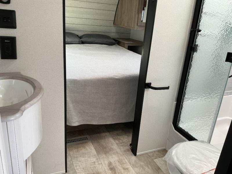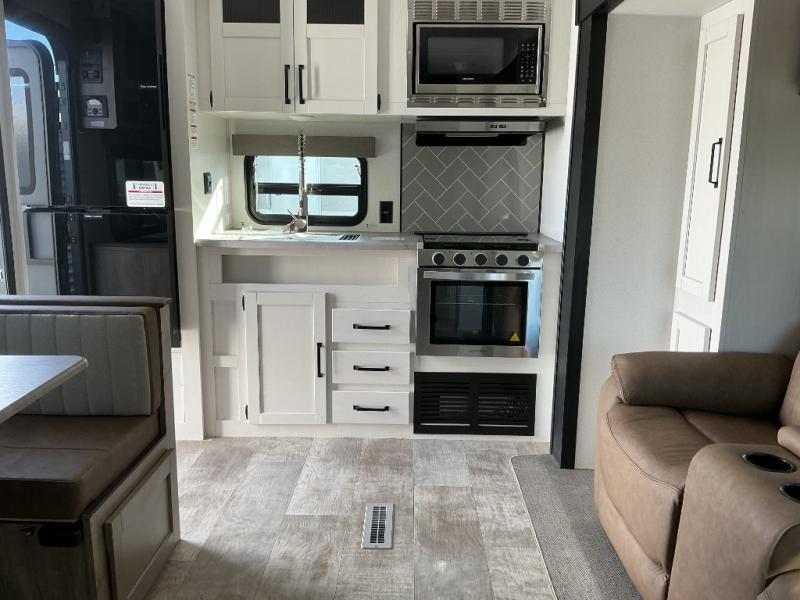 This rear kitchen travel trailer will be perfect for camping trips to the lake or woods! Once you've made breakfast on the stainless steel oven and range, you can dine at the booth dinette or take your plate outdoors to sit under the 18' electric awning. There is also a sofa slide out inside for a comfy place to relax. The walk-thru bath features a shower with a seat for added comfort, and you'll love having your own space in the front master bedroom. Here, you'll find a queen bed plus dual bedside closets to keep your things organized!