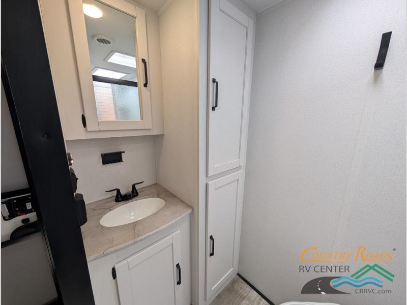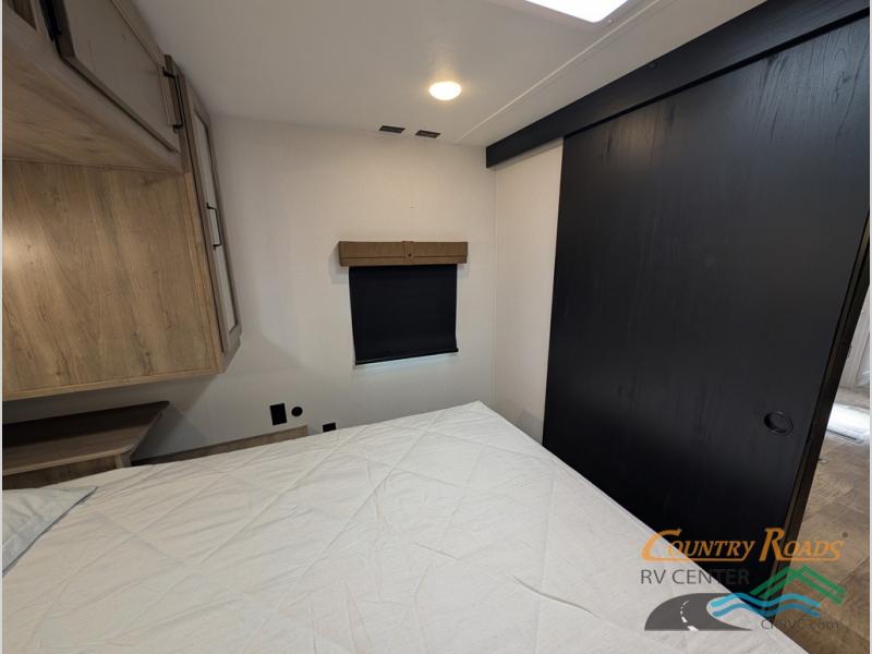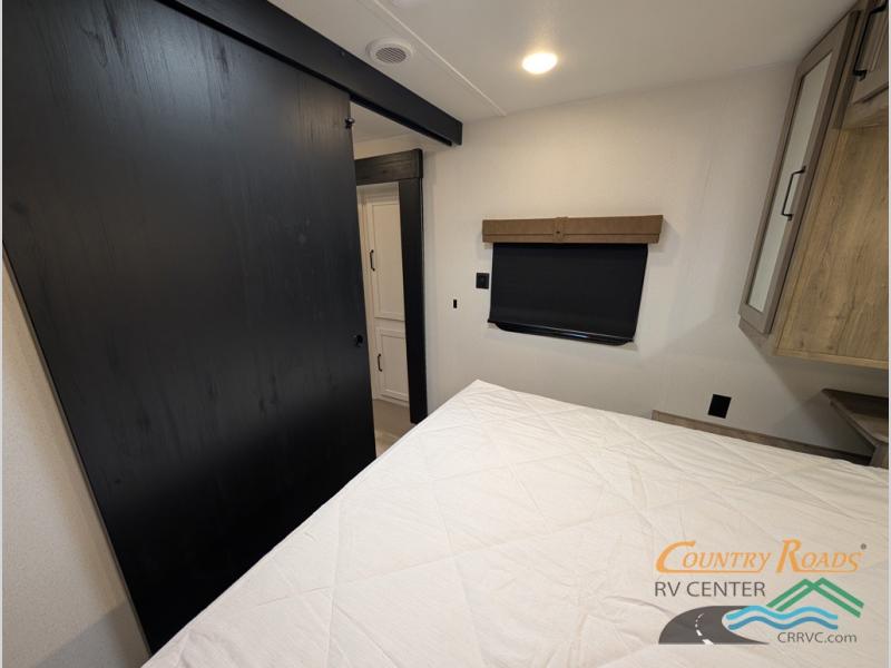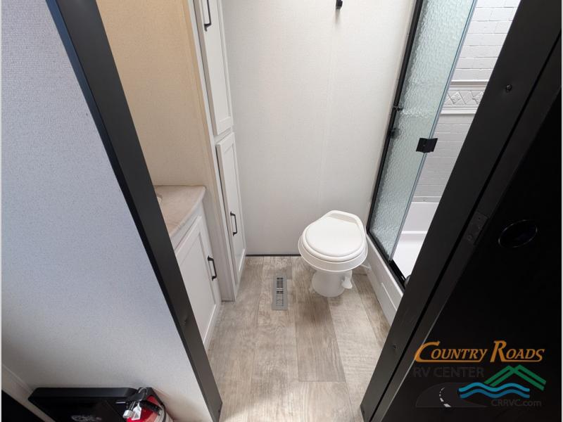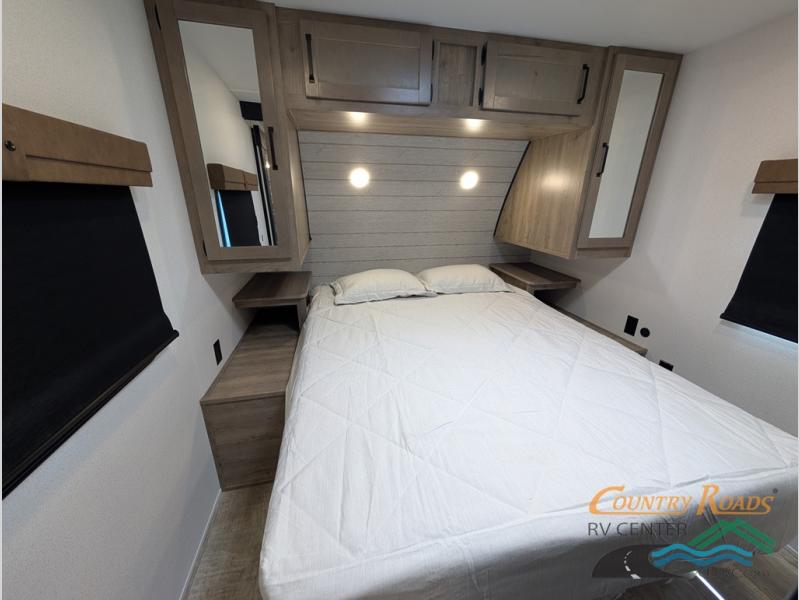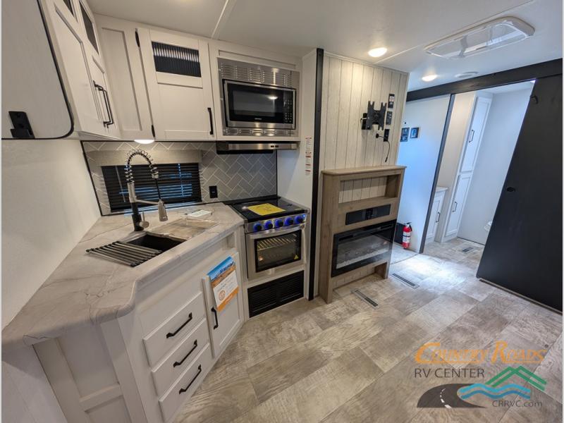 This travel trailer is inviting and spacious thanks to the large slide out, which houses the sofa, 12V refrigerator and second pantry! There is a fireplace across from the sofa for added comfort, and the full rear bath will be easy to get to. A full kitchen inside includes a stainless steel oven and range plus a stainless steel microwave to cook meals, and you can choose to add the optional micro kitchen with a griddle if you enjoy cooking outdoors! When you're ready to call it a night, the queen bed in the front private bedroom will be calling your name!