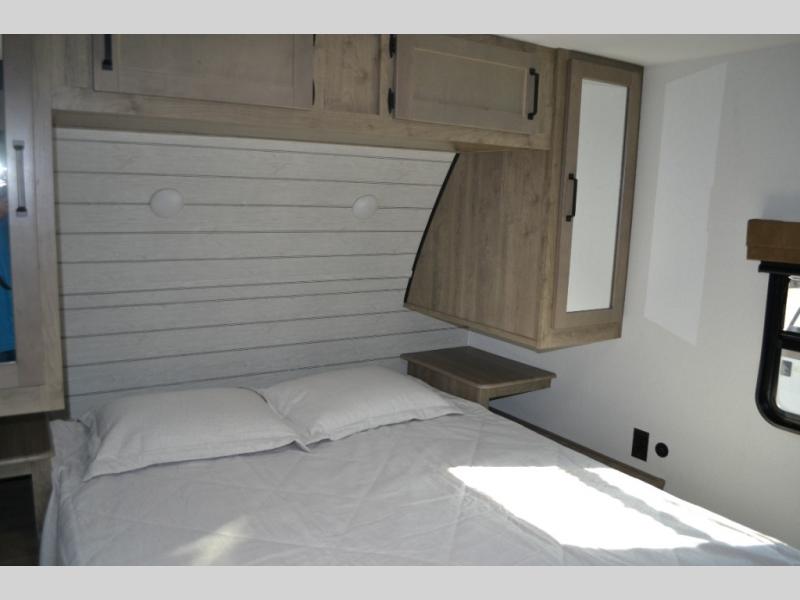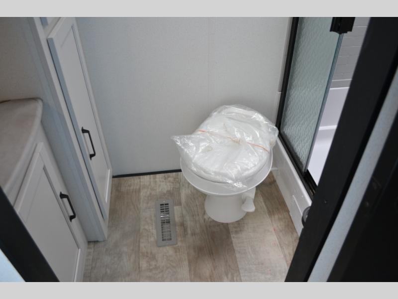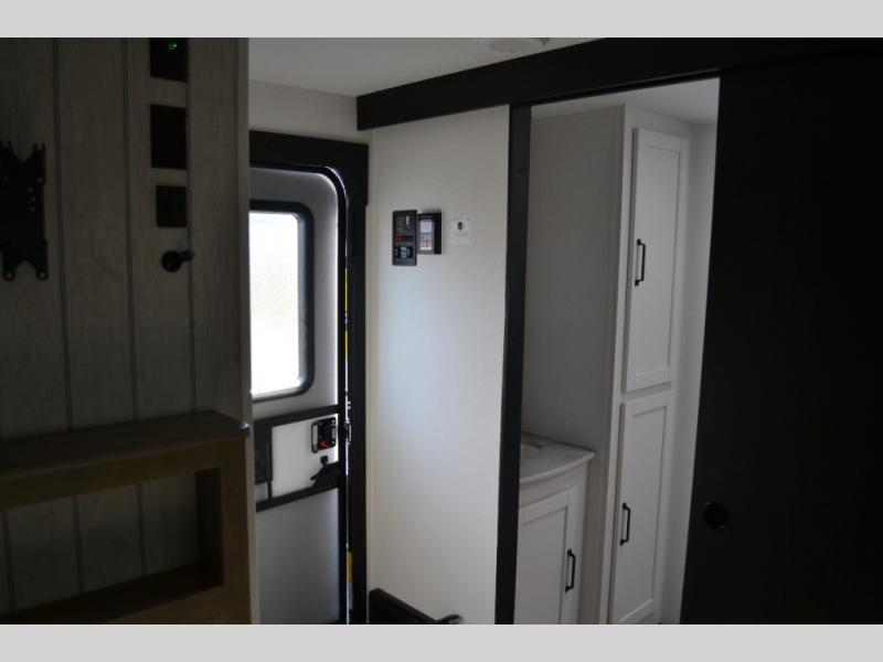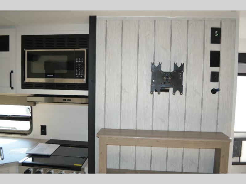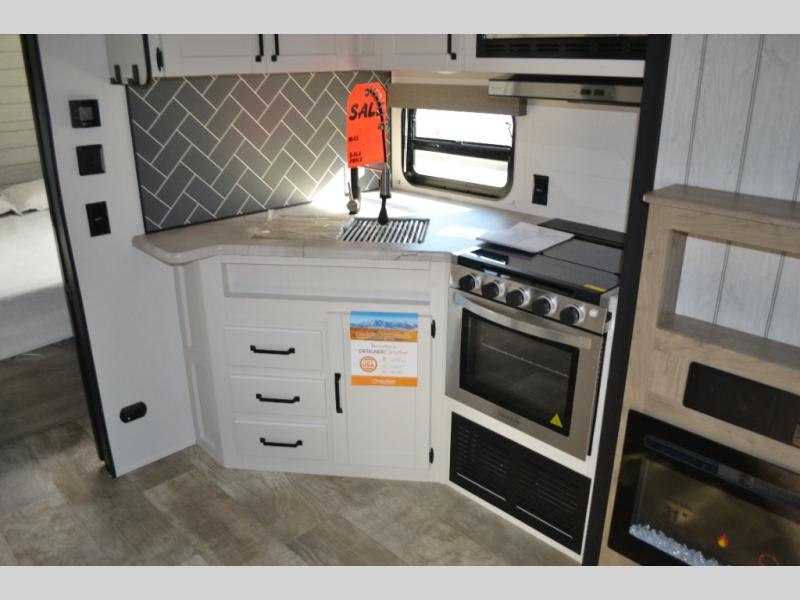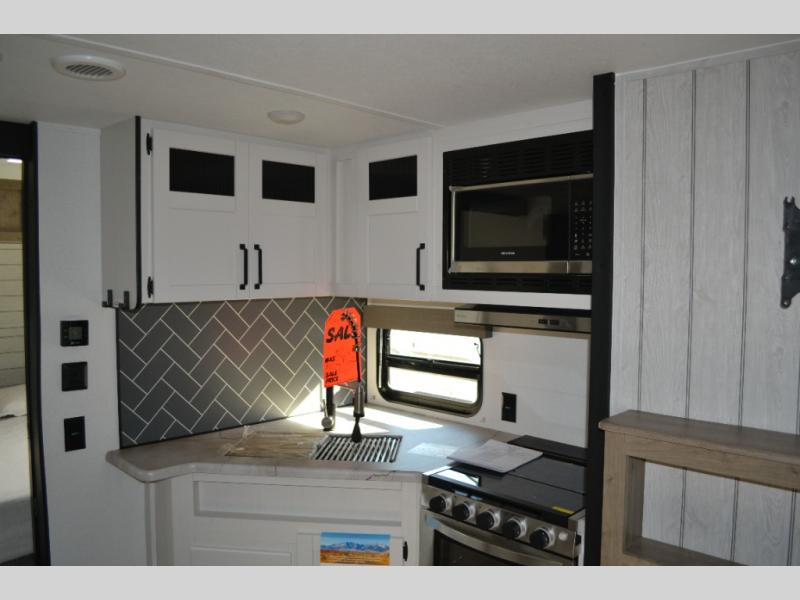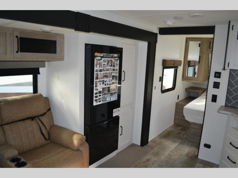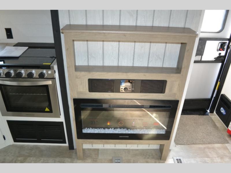 This travel trailer is inviting and spacious thanks to the large slide out, which houses the sofa, 12V refrigerator and second pantry! There is a fireplace across from the sofa for added comfort, and the full rear bath will be easy to get to. A full kitchen inside includes a stainless steel oven and range plus a stainless steel microwave to cook meals, and you can choose to add the optional micro kitchen with a griddle if you enjoy cooking outdoors! When you're ready to call it a night, the queen bed in the front private bedroom will be calling your name!