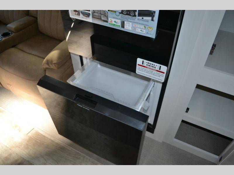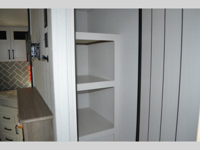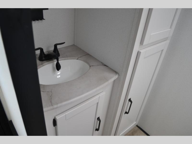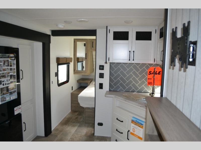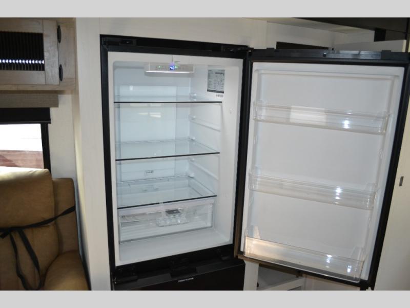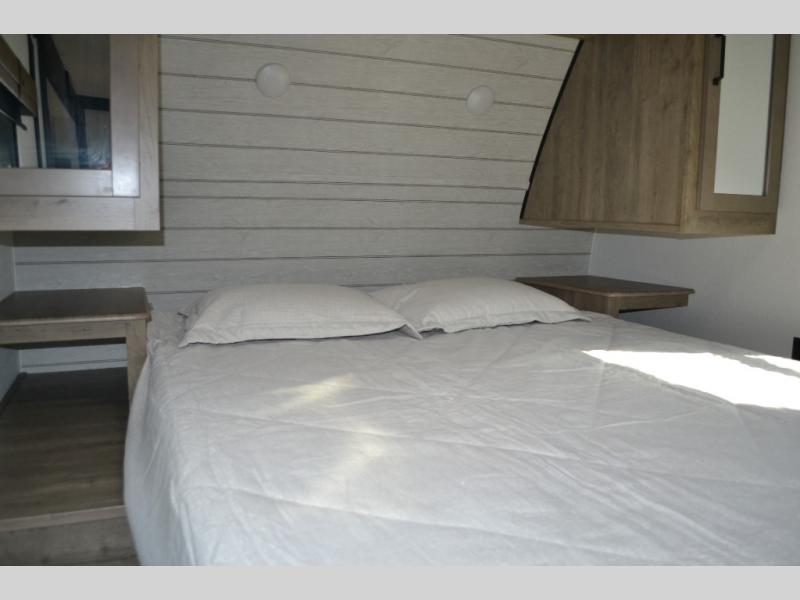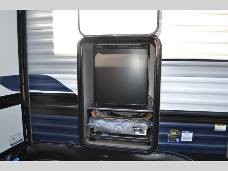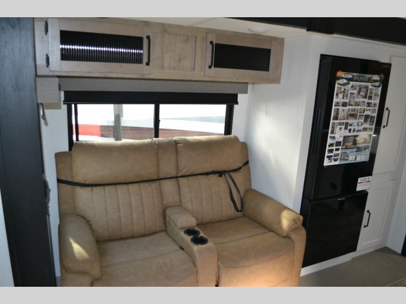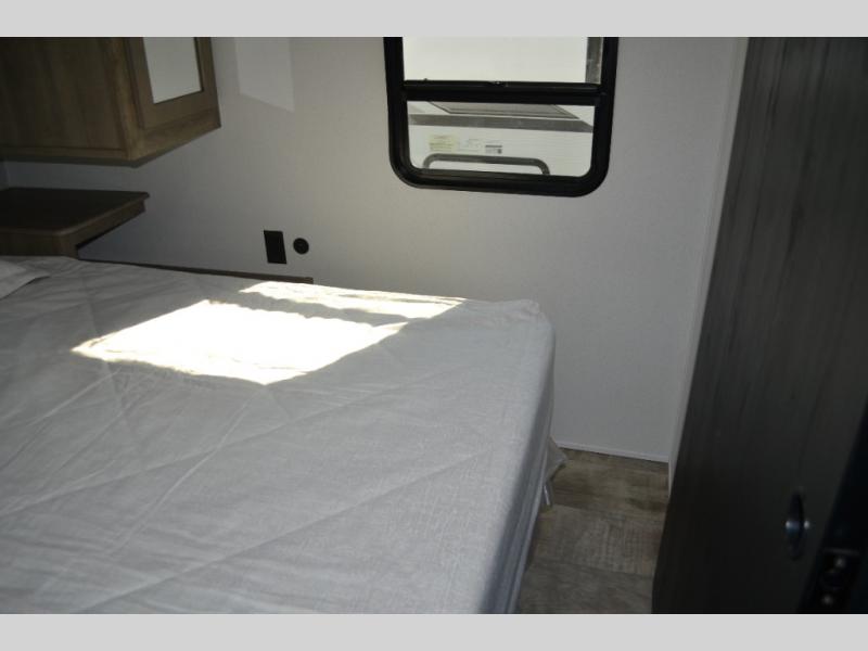 This travel trailer is inviting and spacious thanks to the large slide out, which houses the sofa, 12V refrigerator and second pantry! There is a fireplace across from the sofa for added comfort, and the full rear bath will be easy to get to. A full kitchen inside includes a stainless steel oven and range plus a stainless steel microwave to cook meals, and you can choose to add the optional micro kitchen with a griddle if you enjoy cooking outdoors! When you're ready to call it a night, the queen bed in the front private bedroom will be calling your name!