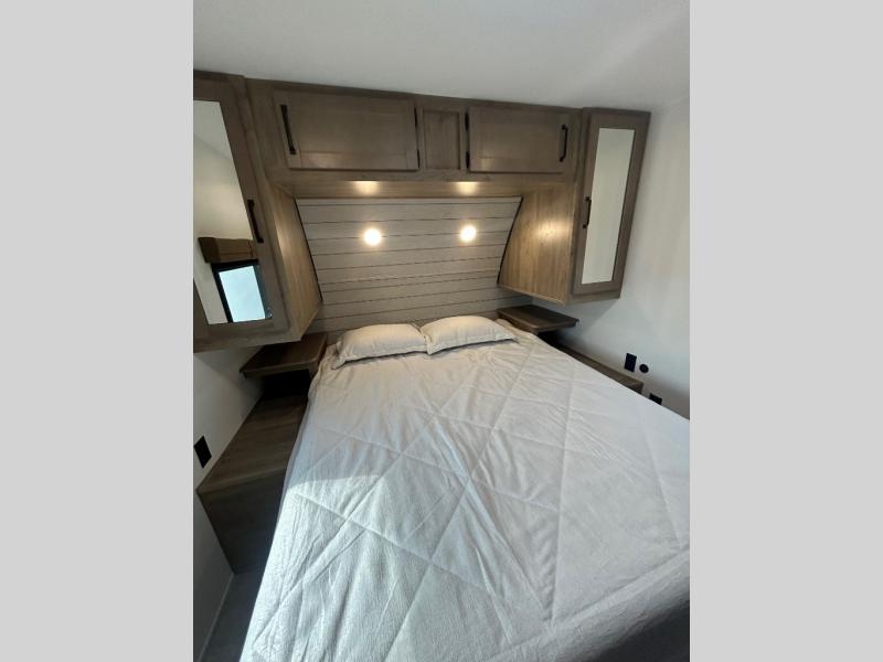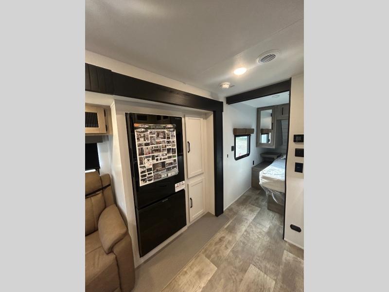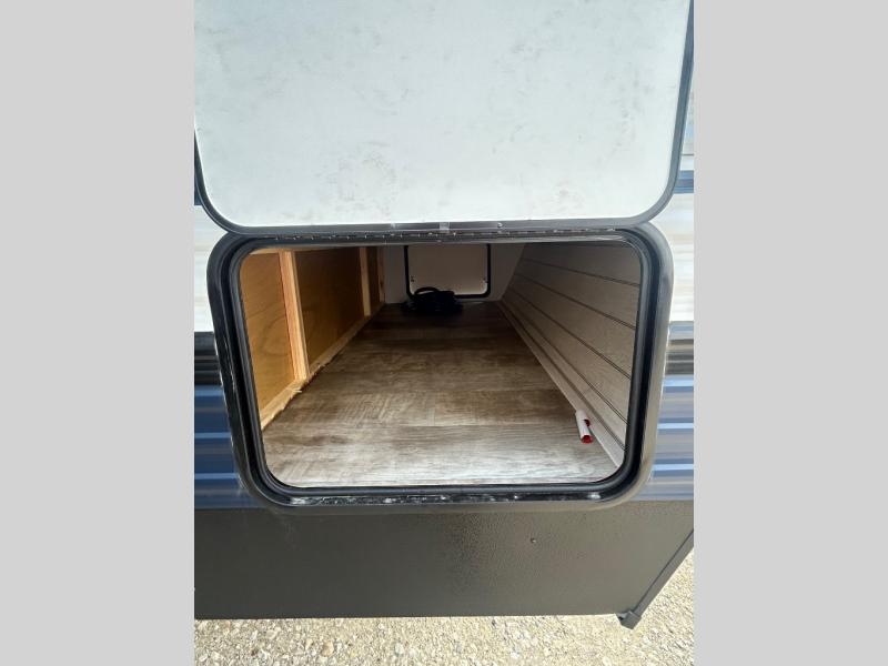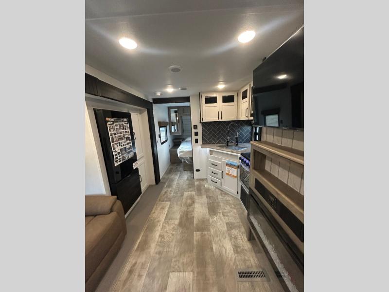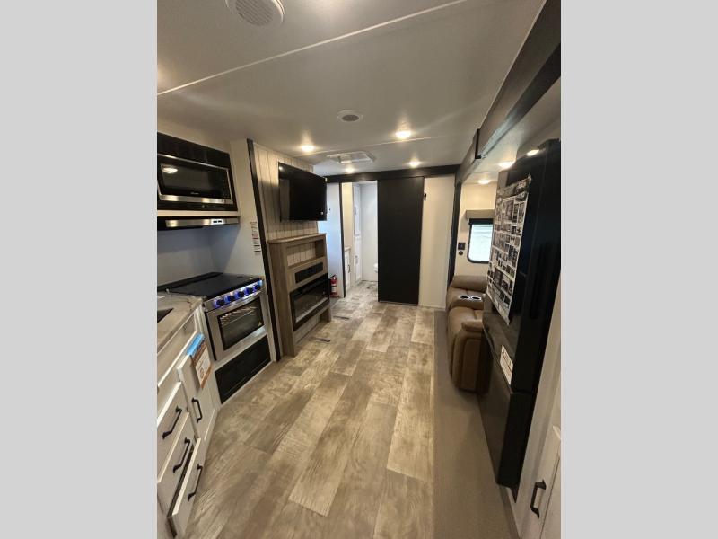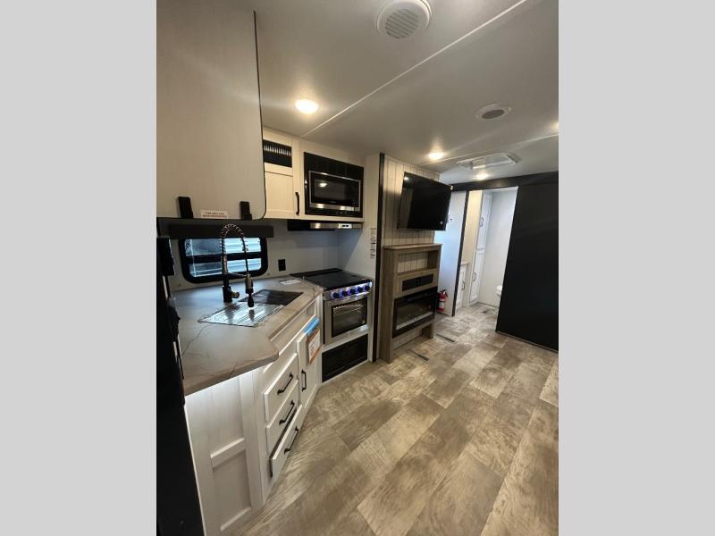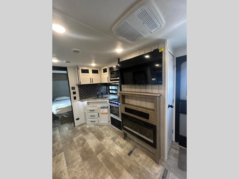 This travel trailer is inviting and spacious thanks to the large slide out, which houses the sofa, 12V refrigerator and second pantry! There is a fireplace across from the sofa for added comfort, and the full rear bath will be easy to get to. A full kitchen inside includes a stainless steel oven and range plus a stainless steel microwave to cook meals, and you can choose to add the optional micro kitchen with a griddle if you enjoy cooking outdoors! When you're ready to call it a night, the queen bed in the front private bedroom will be calling your name!
