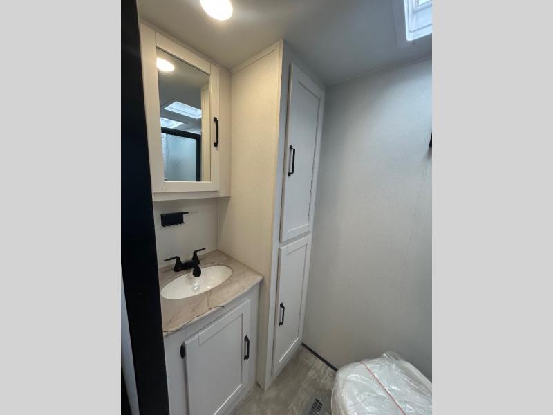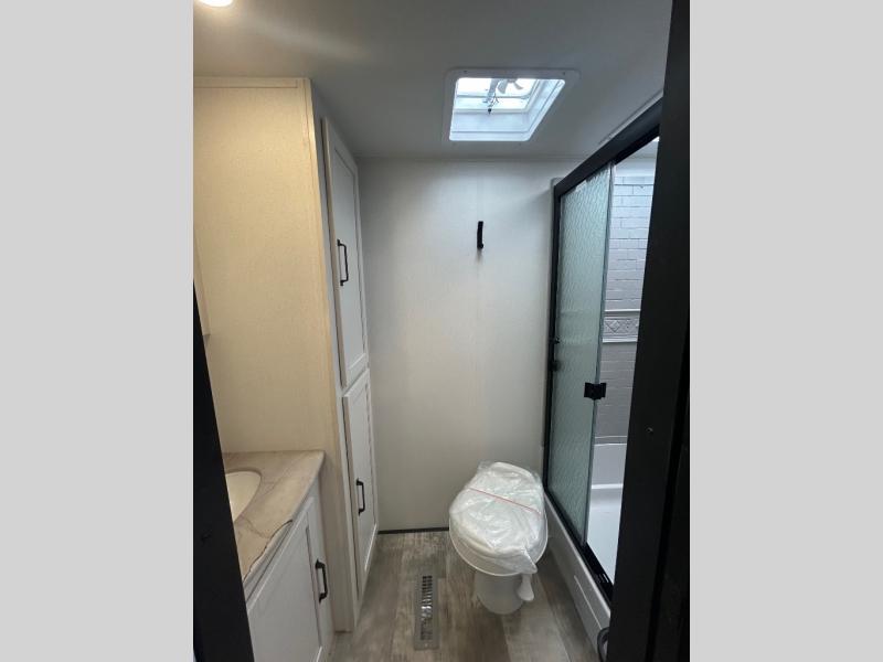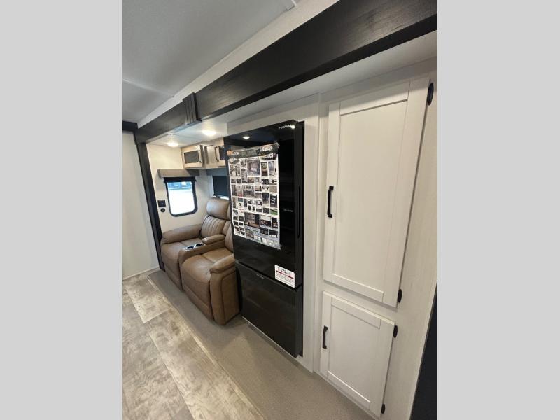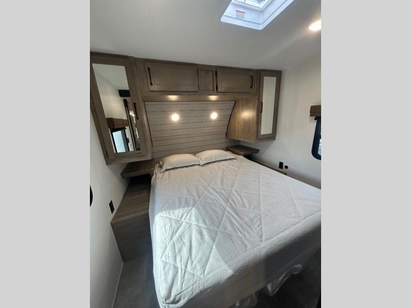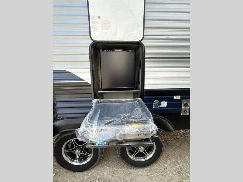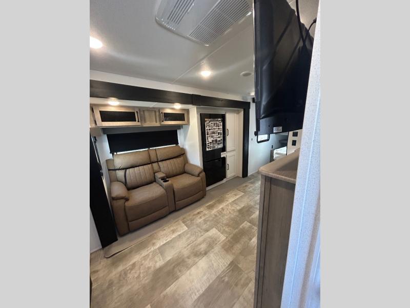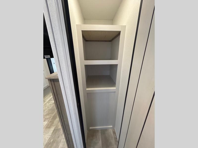 This travel trailer is inviting and spacious thanks to the large slide out, which houses the sofa, 12V refrigerator and second pantry! There is a fireplace across from the sofa for added comfort, and the full rear bath will be easy to get to. A full kitchen inside includes a stainless steel oven and range plus a stainless steel microwave to cook meals, and you can choose to add the optional micro kitchen with a griddle if you enjoy cooking outdoors! When you're ready to call it a night, the queen bed in the front private bedroom will be calling your name!
