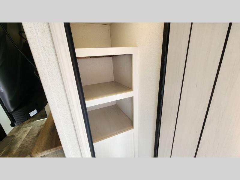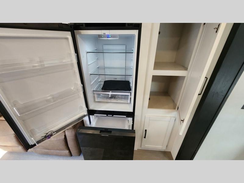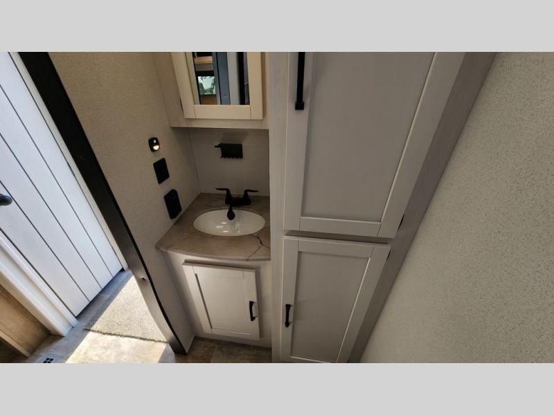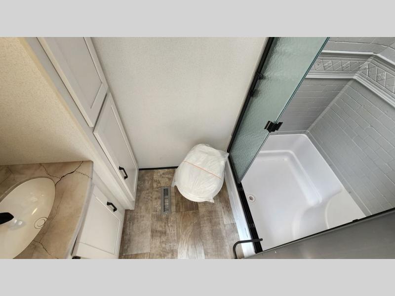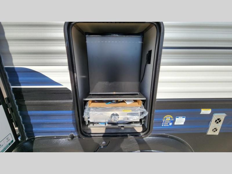 This travel trailer is inviting and spacious thanks to the large slide out, which houses the sofa, 12V refrigerator and second pantry! There is a fireplace across from the sofa for added comfort, and the full rear bath will be easy to get to. A full kitchen inside includes a stainless steel oven and range plus a stainless steel microwave to cook meals, and you can choose to add the optional micro kitchen with a griddle if you enjoy cooking outdoors! When you're ready to call it a night, the queen bed in the front private bedroom will be calling your name!
