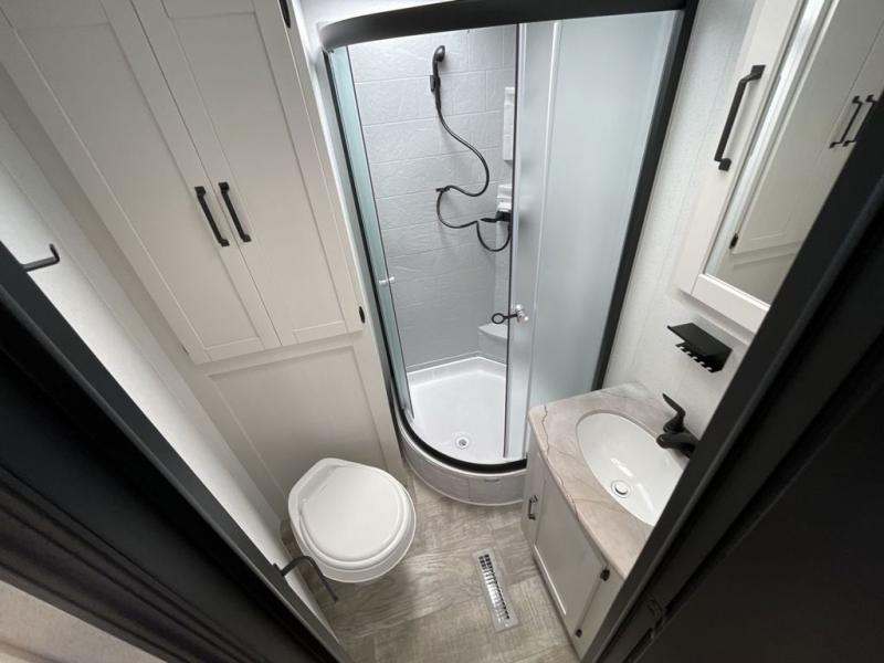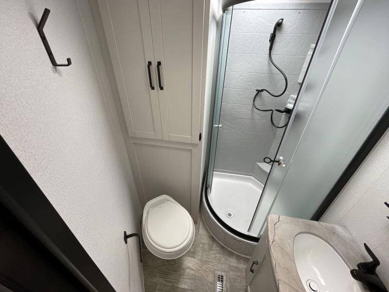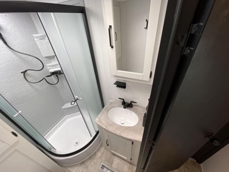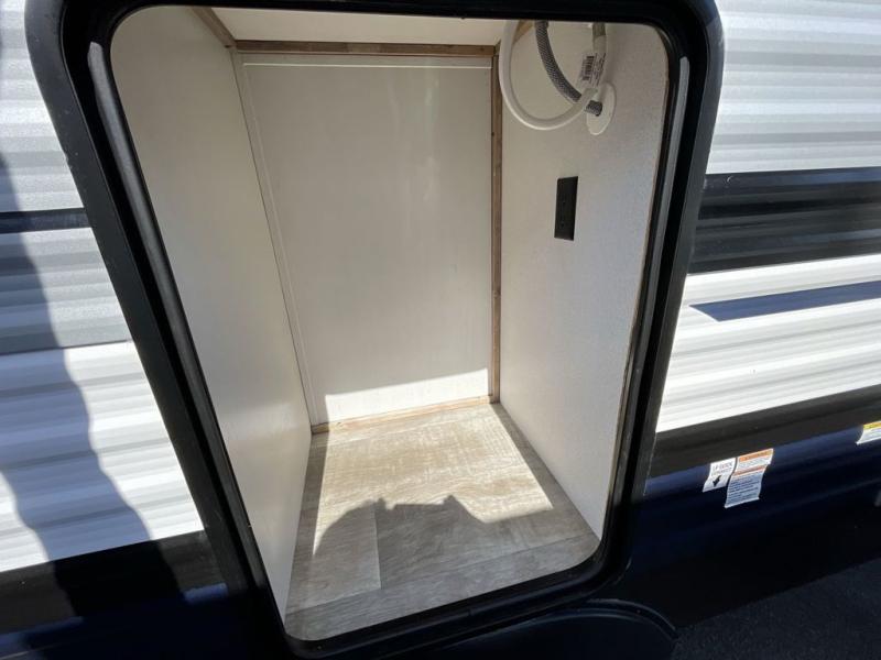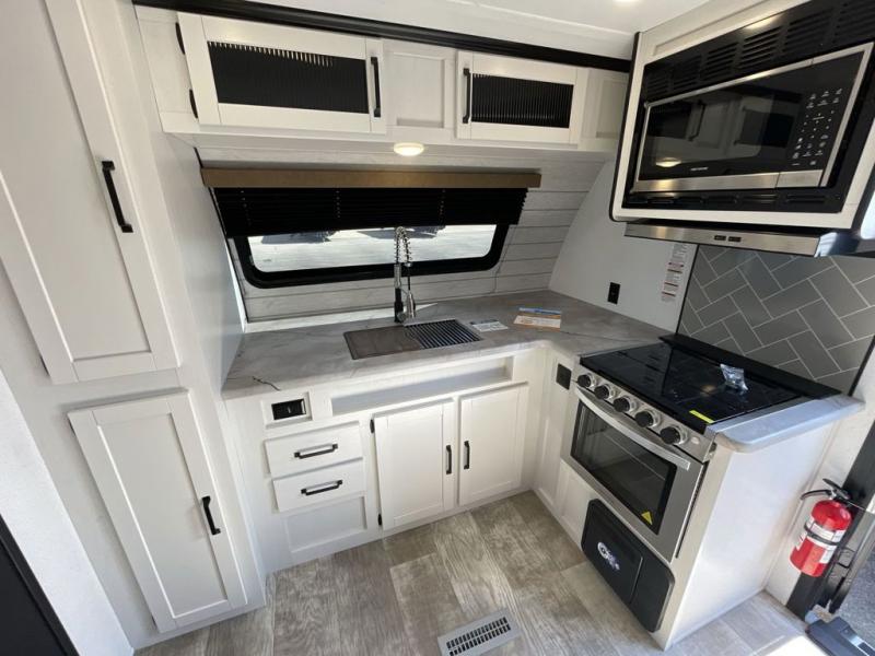 The chef will love cooking in the front kitchen of this travel trailer! They will have plenty of countertop space for meal prepping and a stainless steel oven and range to cook it all. Enjoy your meals at the sofa with table slide. After a fun day outdoors, head to the full bathroom and clean up in the 34" x 34" radius shower then change into your pajamas in the rear private bedroom and enjoy a good night's rest on the 60" x 80" queen bed! This unit also features an abundance of exterior storage for all of your outdoor camping items, along with an optional micro kitchen with a griddle.