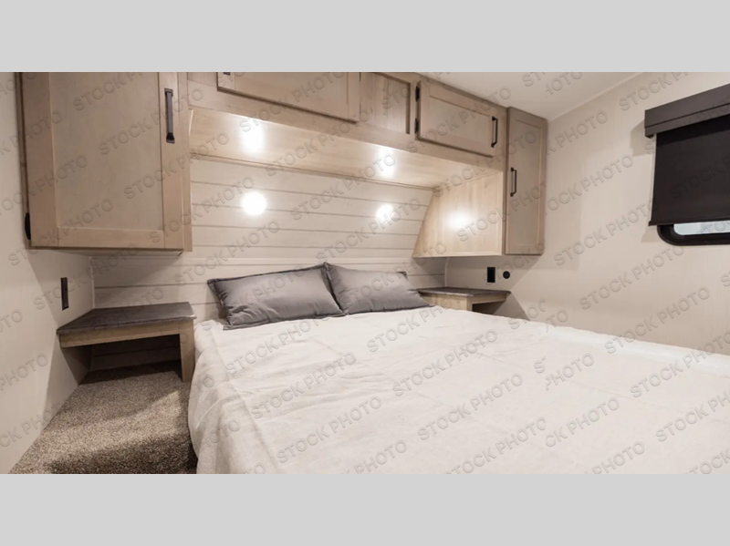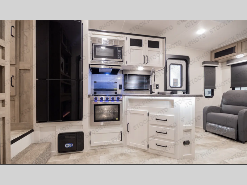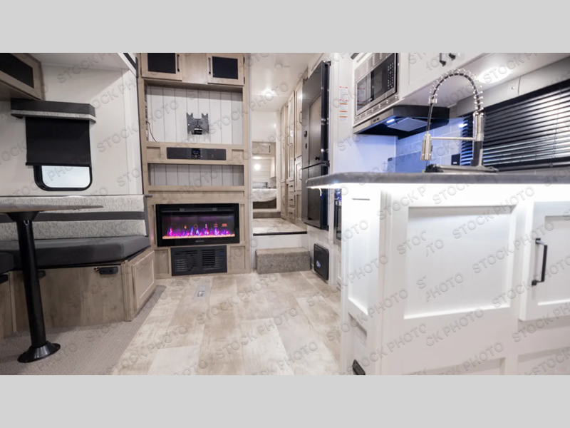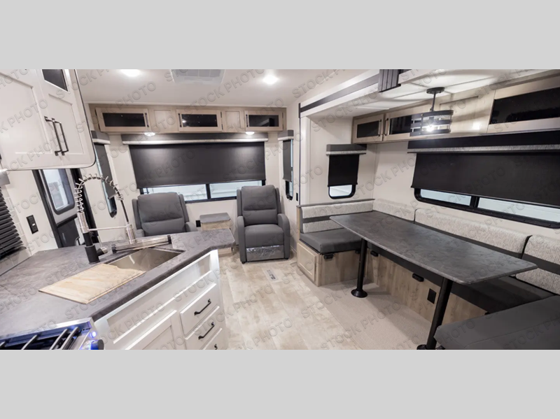 Pack your bags and hitch up this fifth wheel for a fun adventure! It comes with comfortable standard features but many optional features to fit your needs better like the optional recliner chairs in place of the rear sofa and the optional table and chairs in place of the U-shaped dinette. The inside kitchen has everything you need to prepare your best home cooked meals, and there is an entertainment center with a fireplace here to make your space more cozy. There is a 32" x 32" radius shower in the full bathroom to freshen up after a fun day at the beach, and the front private bedroom has a privacy curtain to draw when you're ready to lay down on the queen bed with shirt closets on either side!