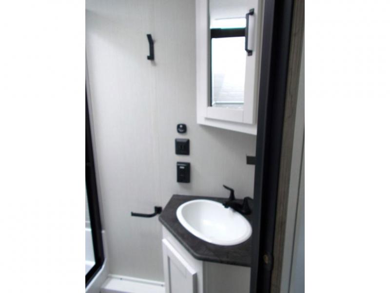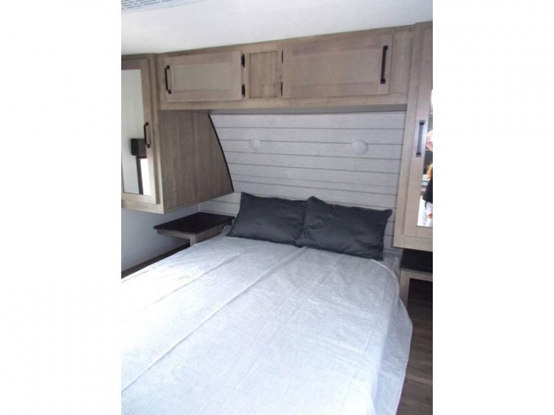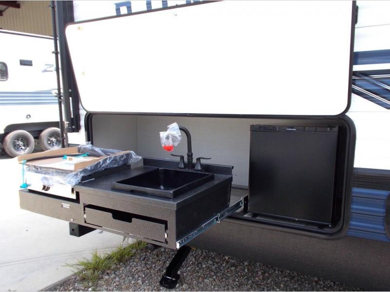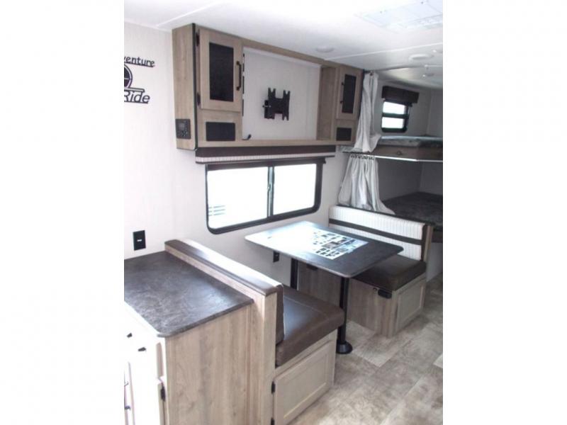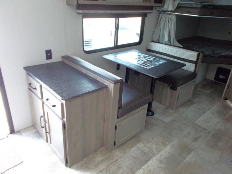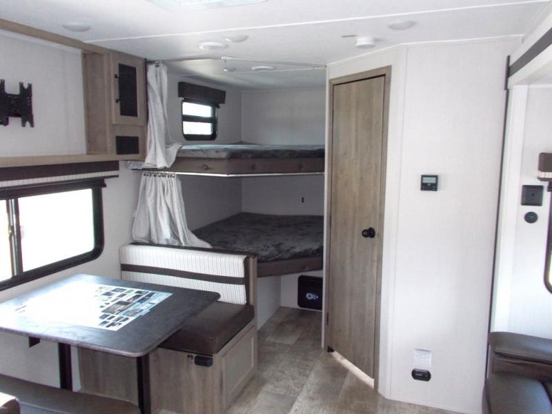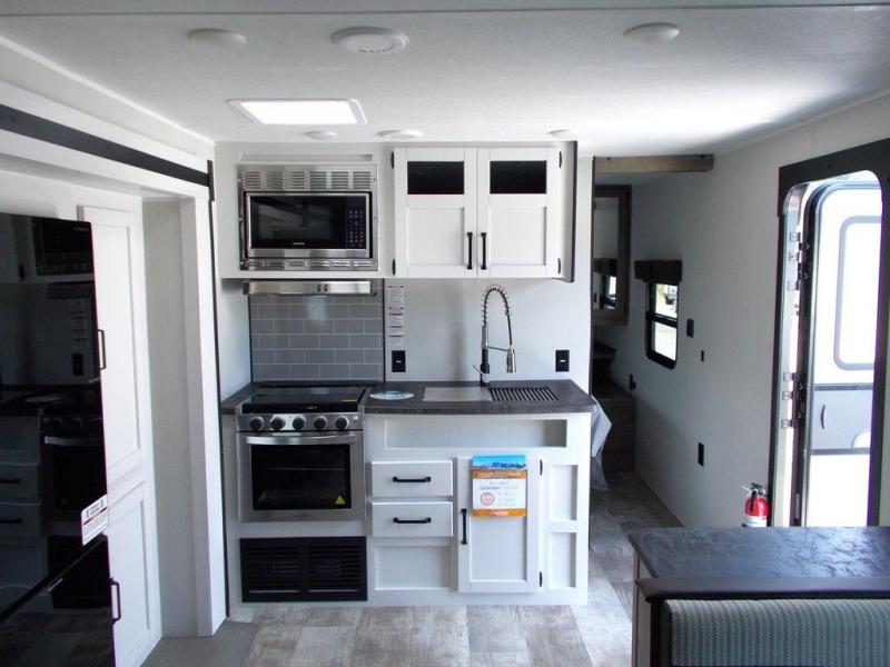 There's room for the whole family in this travel trailer! You will enjoy your own privacy with the front private bedroom which features a 60" x 80" queen bed with shirt closets on either side to hang your clothes, and a shelf above for your books or alarm clock. The kiddos can sleep on the set of 48" x 76" double-size bunk beds. They can even invite a friend or two to join in on the fun and sleep on either the sofa or booth dinette once converted. Everyone can freshen up in the rear corner bathroom with a 32" x 40" shower with a seat, and keep their bellies full with the stainless steel oven and range. You could even choose to add the optional outside mini kitchen if you enjoy cooking outdoors!