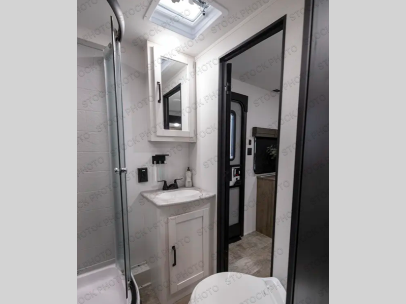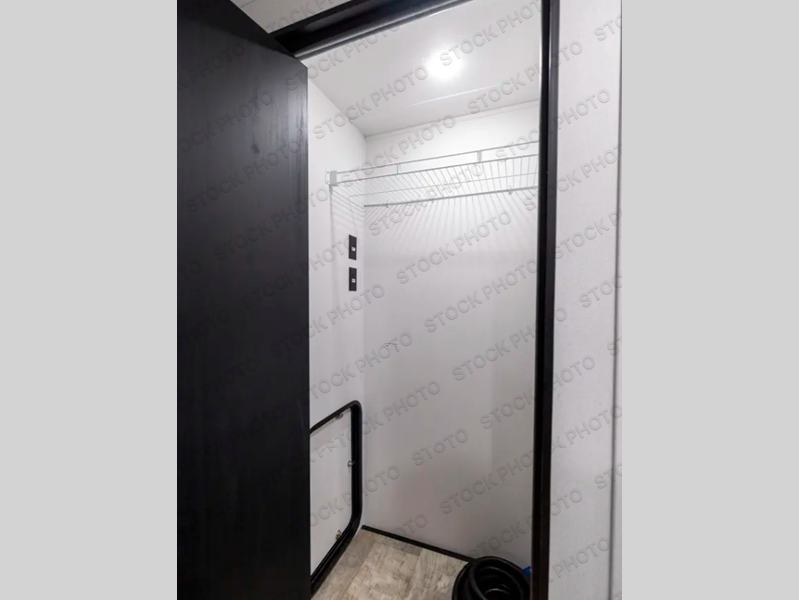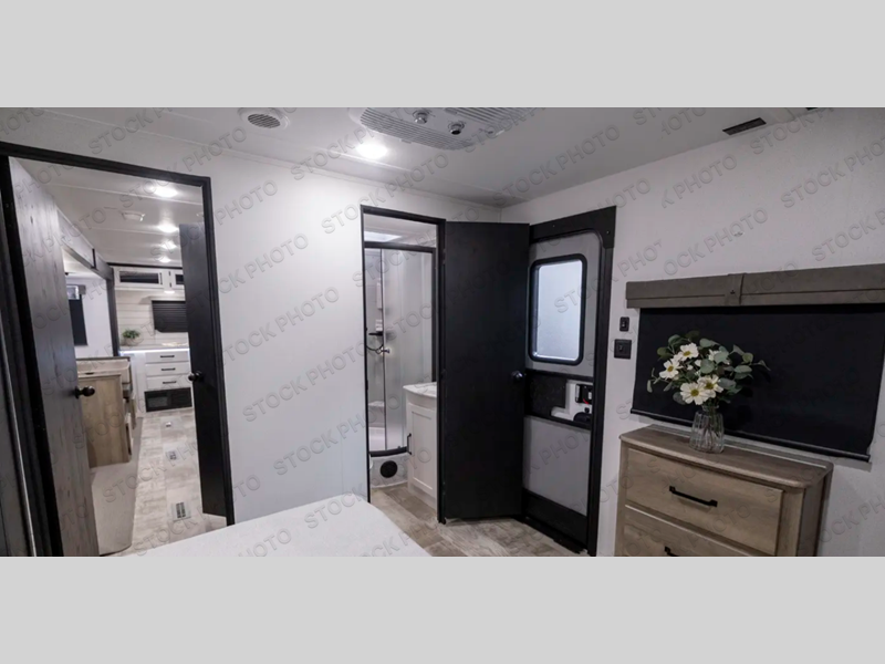 Walk into this travel trailer with one of the dual entry doors for a great camping trip! One entrance enters directly into the rear private bedroom which has a queen bed slide, a walk-in closet with washer and dryer prep, a wardrobe, and even an entrance into the dual entry bathroom. Grab a snack from the walk-in pantry then relax on the sofa while you watch a movie with the entertainment center or play a game at the booth dinette. The front kitchen has everything you will need to prepare your best home cooked meals including lots of countertop space, a stainless steel oven and range, and a stainless steel microwave!