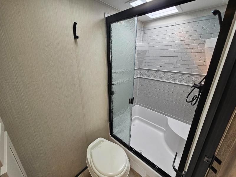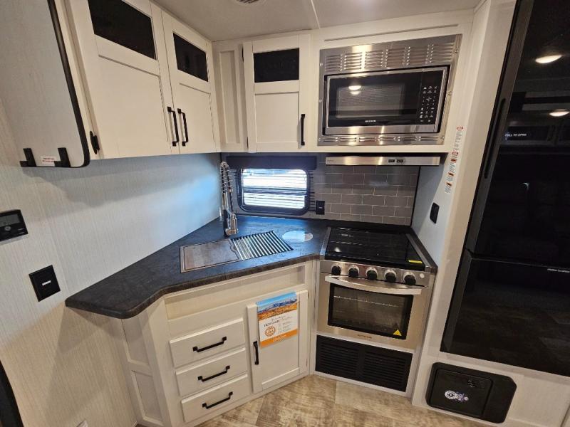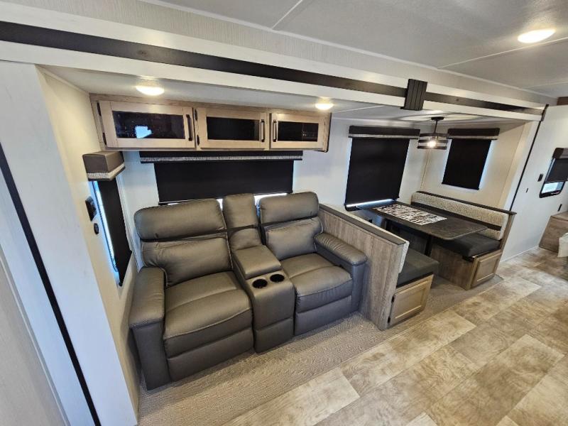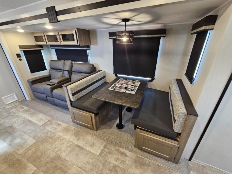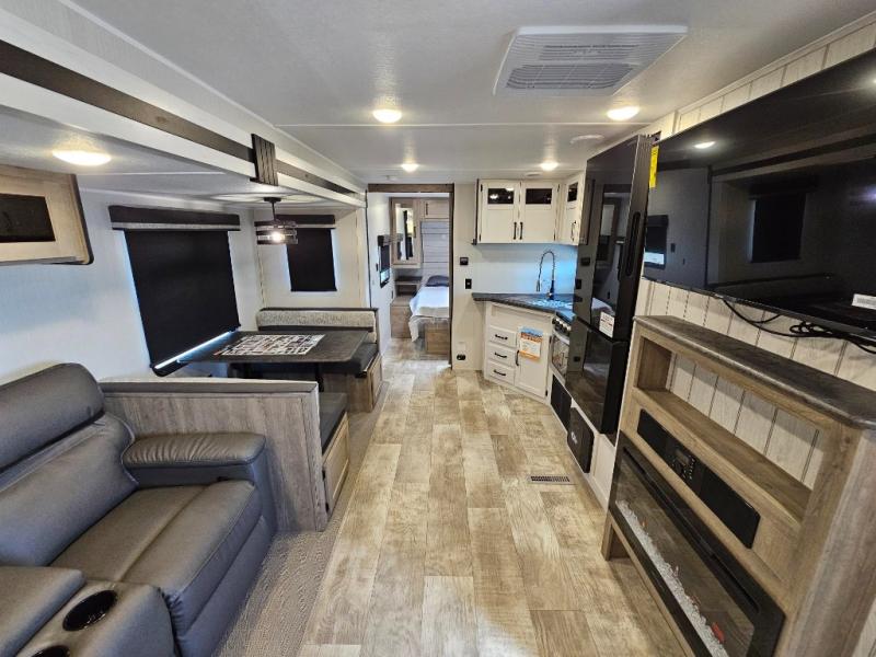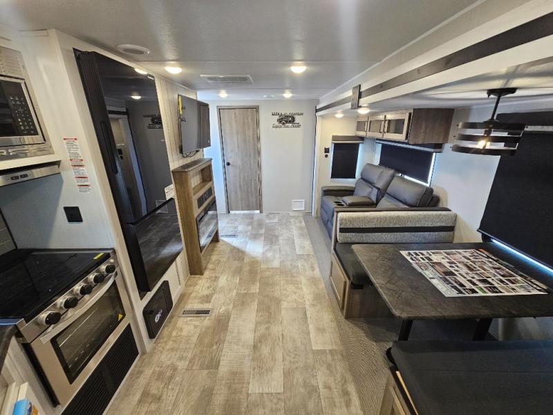 Pack your bags and hitch up this travel trailer for a great adventure! The full rear bathroom has a 32" x 40" shower with a seat and a closet for you to start each morning feeling clean and fresh. Now that you're ready for the day, grab some eggs from the 11 cu. ft. stainless steel refrigerator to fry on the three burner cooktop and enjoy at the booth dinette. If mother nature is raining on your parade then you can relax on the sofa and watch your favorite movies with the entertainment center which has a closet/pantry behind it.