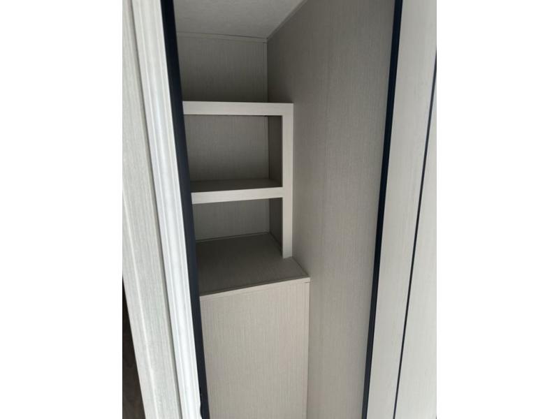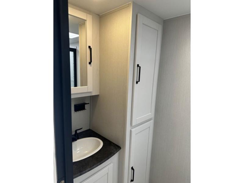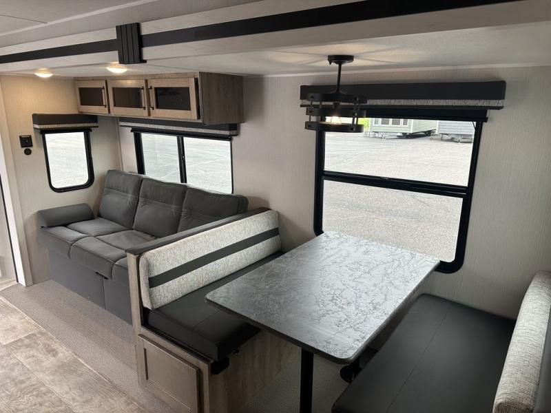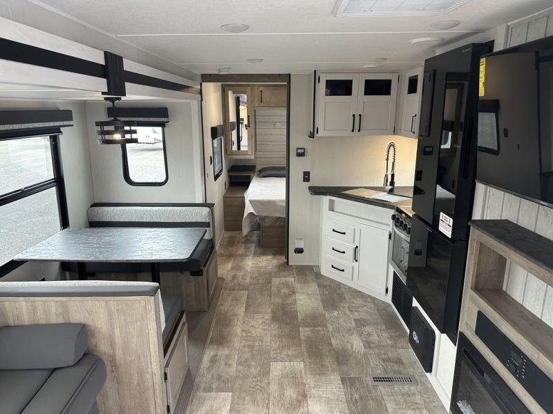 Pack your bags and hitch up this travel trailer for a great adventure! The full rear bathroom has a 32" x 40" shower with a seat and a closet for you to start each morning feeling clean and fresh. Now that you're ready for the day, grab some eggs from the 11 cu. ft. stainless steel refrigerator to fry on the three burner cooktop and enjoy at the booth dinette. If mother nature is raining on your parade then you can relax on the sofa and watch your favorite movies with the entertainment center which has a closet/pantry behind it.