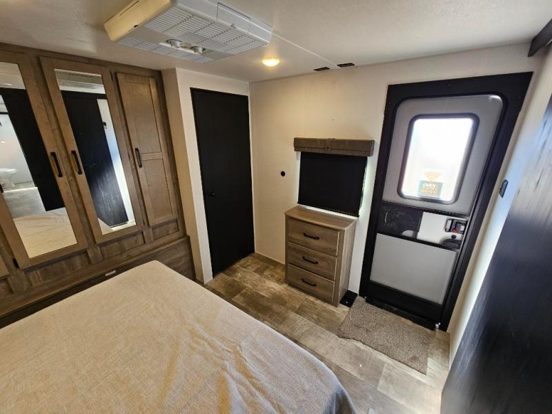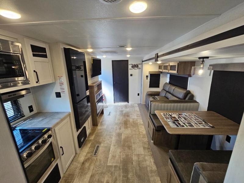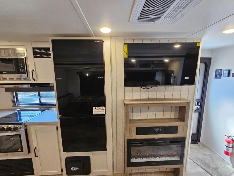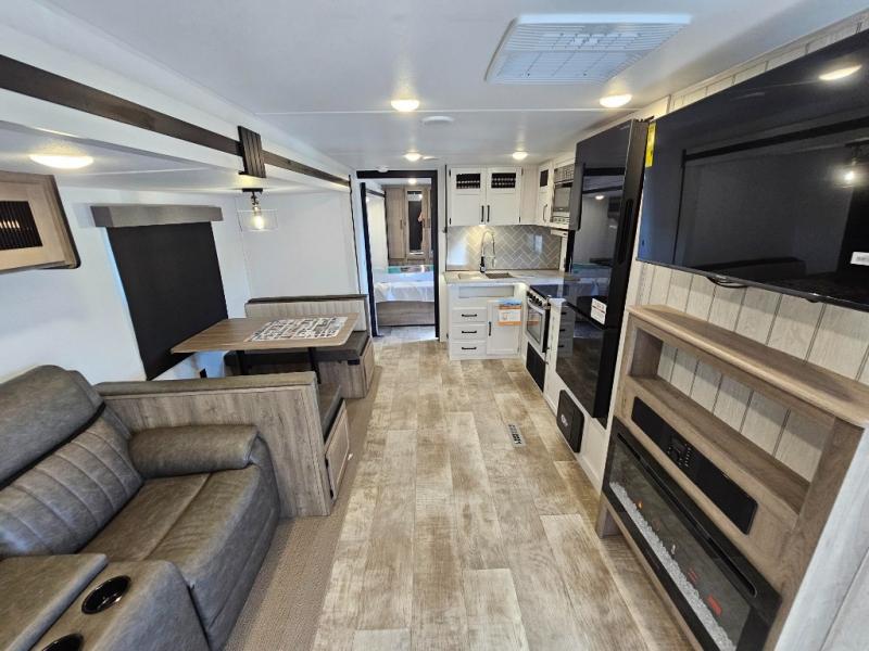 Head to the lake in this double slide out travel trailer that can sleep five each night. You will love having the front private bedroom all to yourselves that includes a queen bed slide out, a front wardrobe, a closet with washer and dryer prep, plus your own exterior entry door. Your guests can sleep on the sofa and booth dinette within the second slide out, and the full rear bath is tucked away for privacy. This model also includes an entryway closet/pantry for food storage and jackets, and the fireplace across from the sofa makes your space more cozy. An optional outside micro kitchen is available also if you like to cook outdoors!