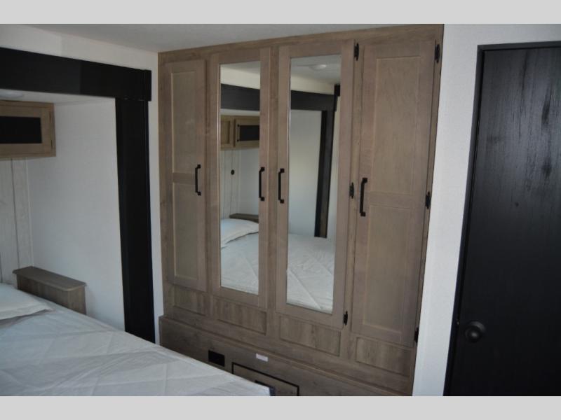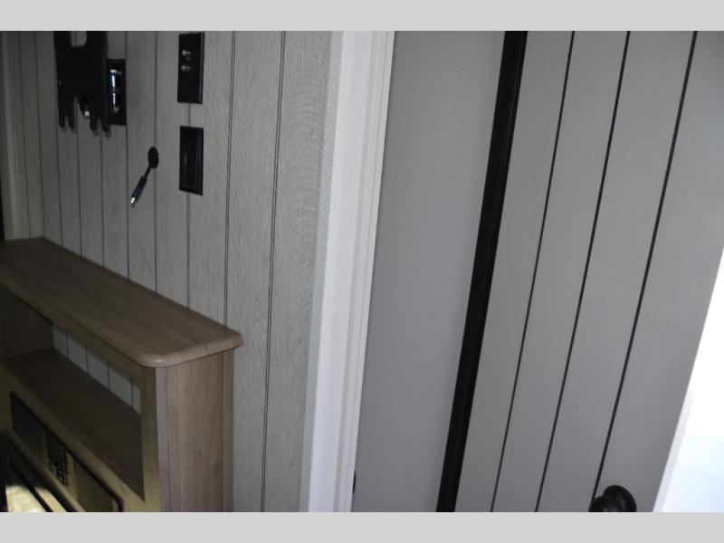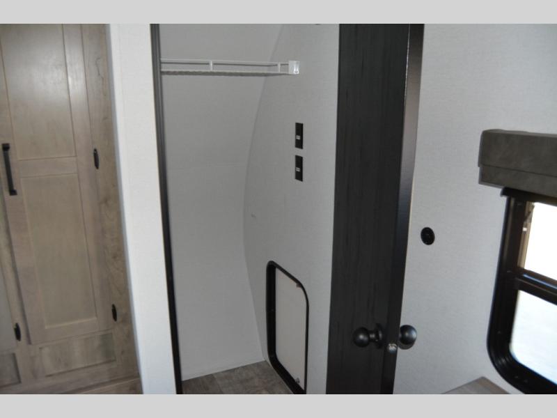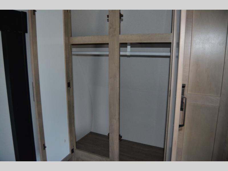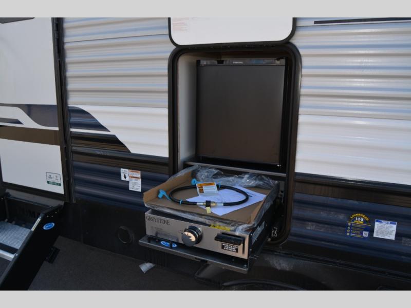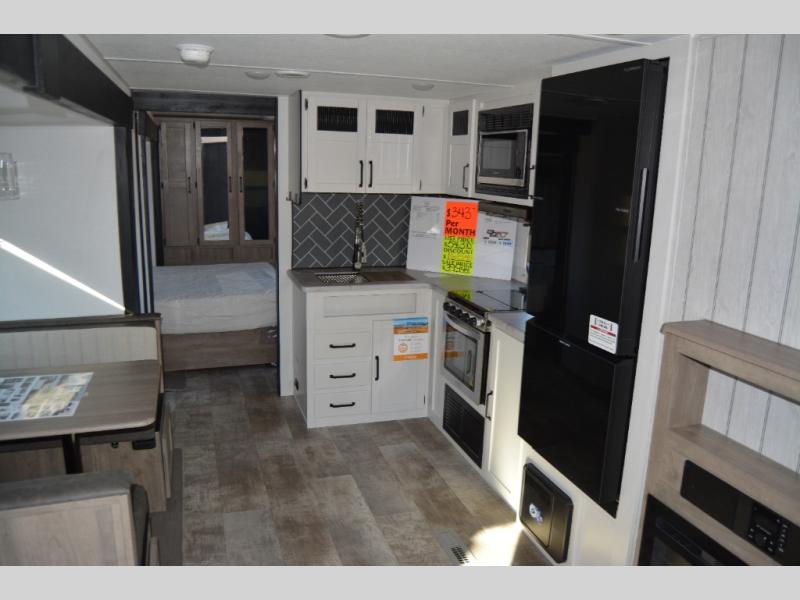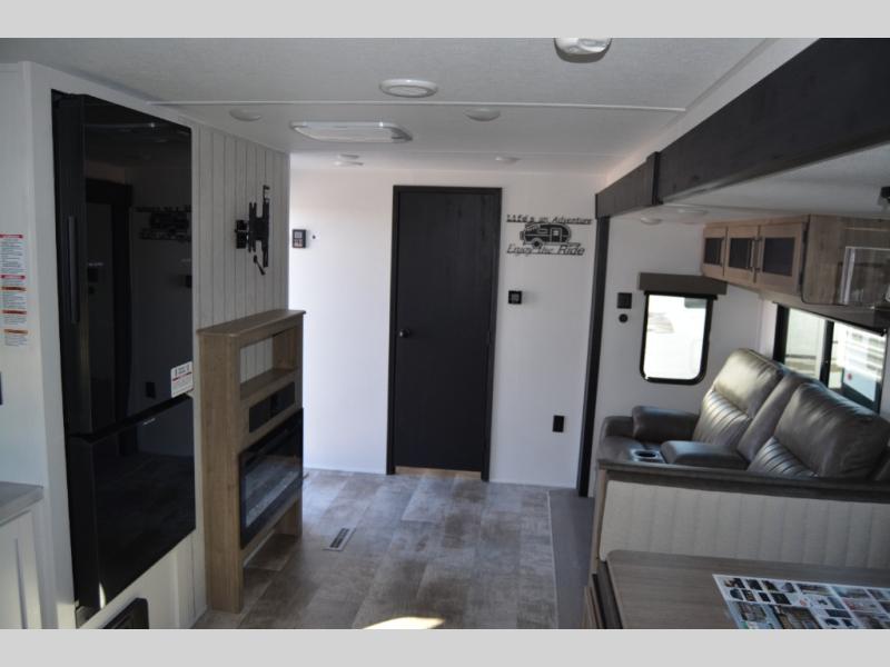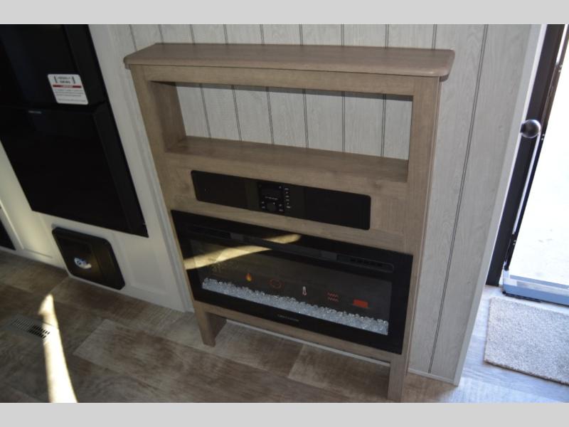 Head to the lake in this double slide out travel trailer that can sleep four to five each night. You will love having the front private bedroom all to yourselves that includes a queen bed slide out, a front wardrobe, a closet with washer and dryer prep, plus your own exterior entry door. Your guests can sleep on the sofa and booth dinette within the second slide out, and the full rear bath is tucked away for privacy. This model also includes an entryway closet/pantry for food storage and jackets, and the fireplace across from the sofa makes your space more cozy. An optional outside micro kitchen is available also if you like to cook outdoors!