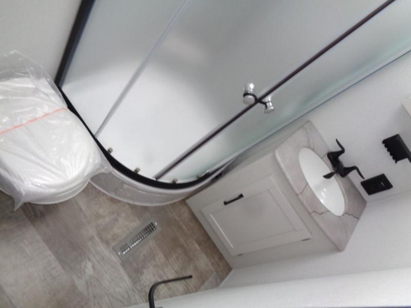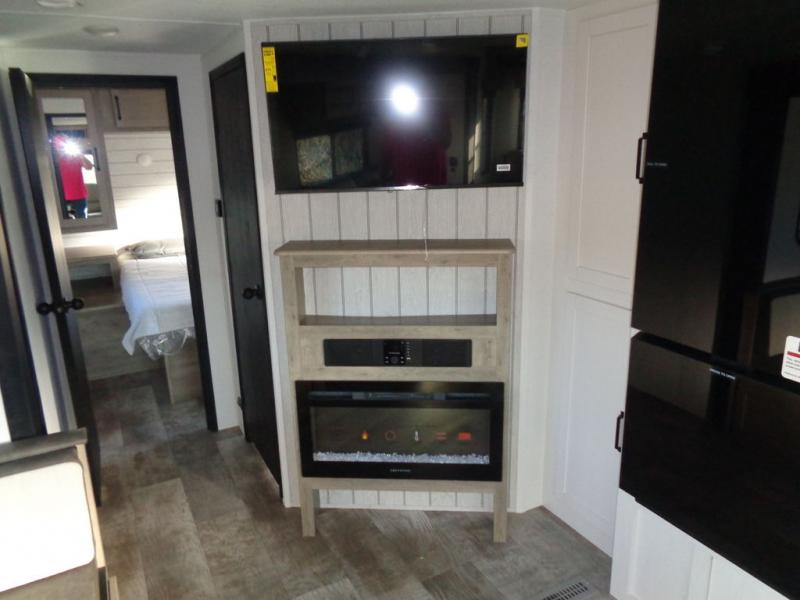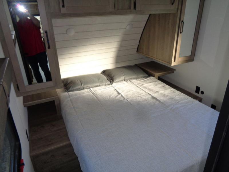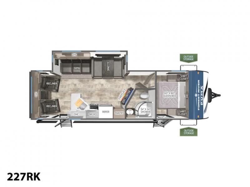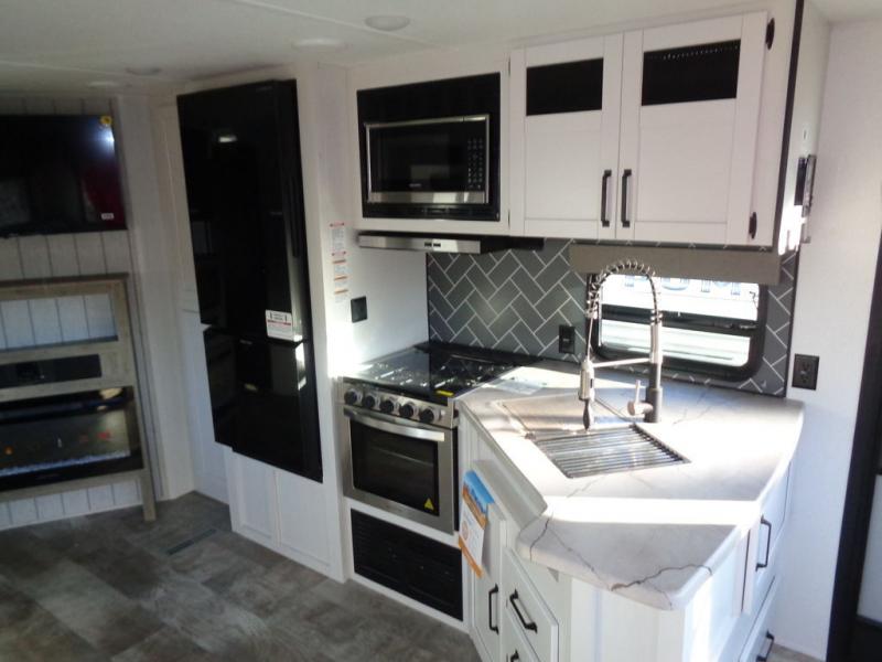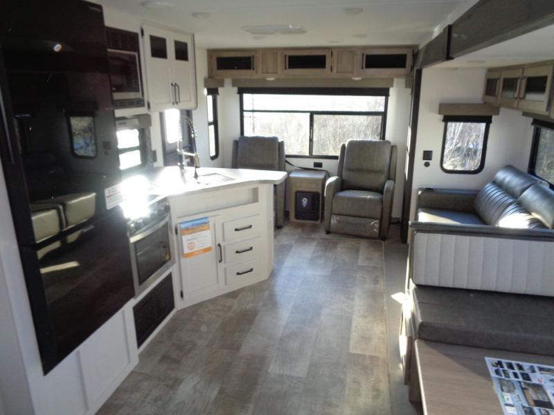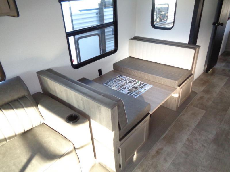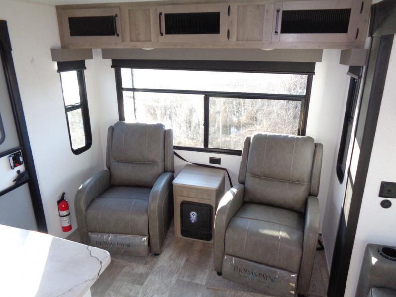 Comfort and convenience is found throughout this travel trailer! The set of rear recliners have an end table in between to set your cup of coffee as you read the newspaper, and the sofa is a great place to take an afternoon nap. After you have prepared your best home cooked meal with the stainless steel oven and 12V refrigerator, you can head to the booth dinette then play a card game or two. The full bathroom has a 34" x 34" radius shower to freshen up in before heading to the front private bedroom to enjoy a good night's rest on the queen bed which has shirt closets and nightstands on either side of it.