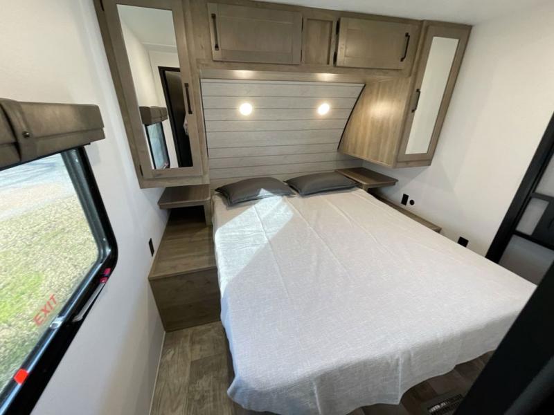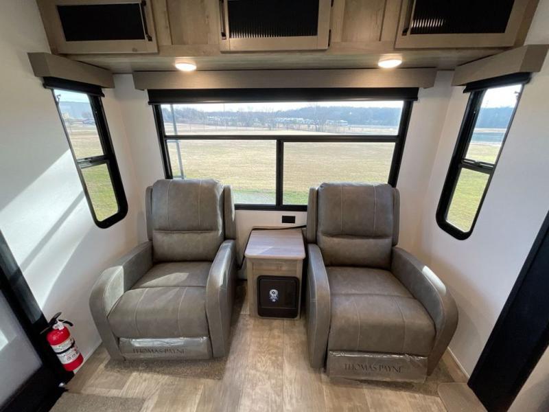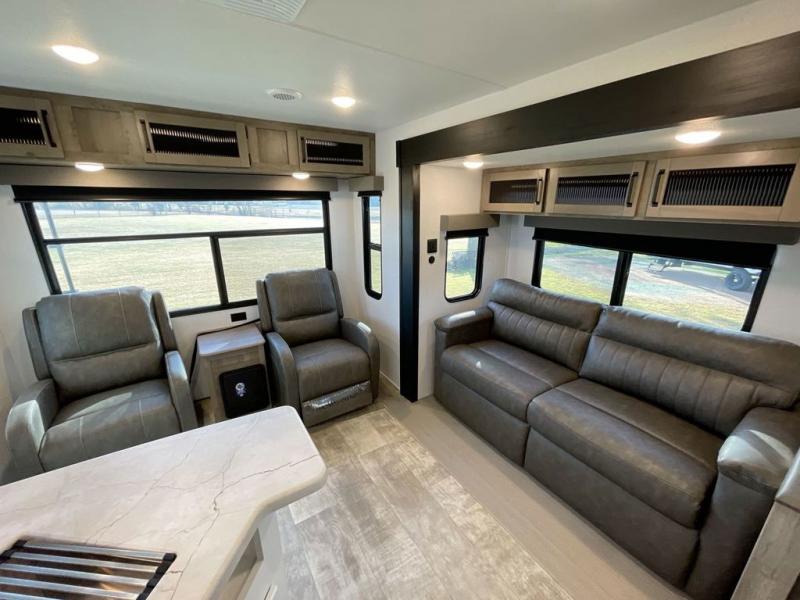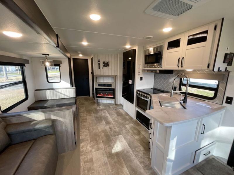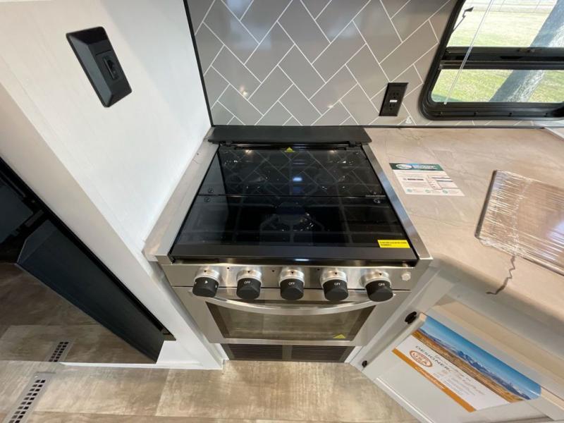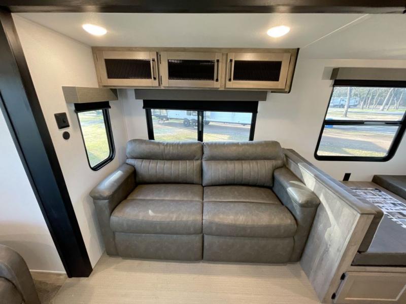 Comfort and convenience is found throughout this travel trailer! The set of rear recliners have an end table in between to set your cup of coffee as you read the newspaper, and the sofa is a great place to take an afternoon nap. After you have prepared your best home cooked meal with the stainless steel oven and 12V refrigerator, you can head to the booth dinette then play a card game or two. The full bathroom has a 34" x 34" radius shower to freshen up in before heading to the front private bedroom to enjoy a good night's rest on the queen bed which has shirt closets and nightstands on either side of it.
