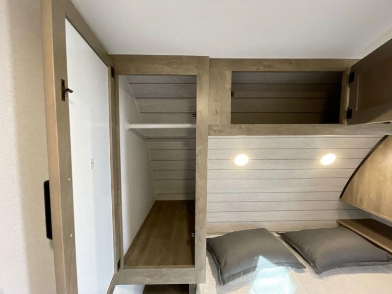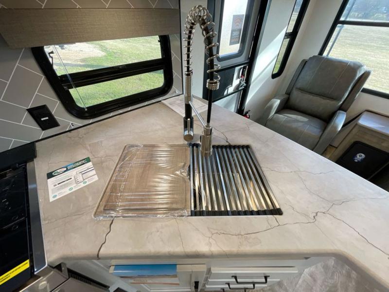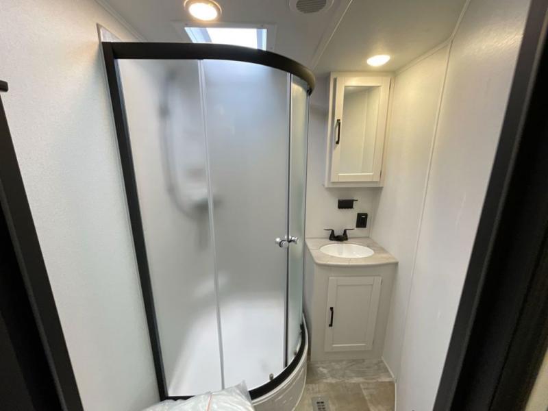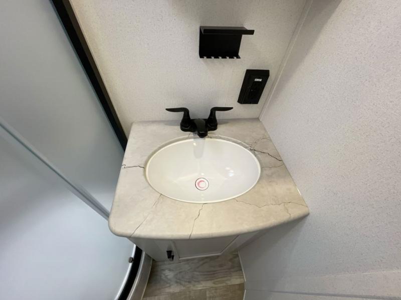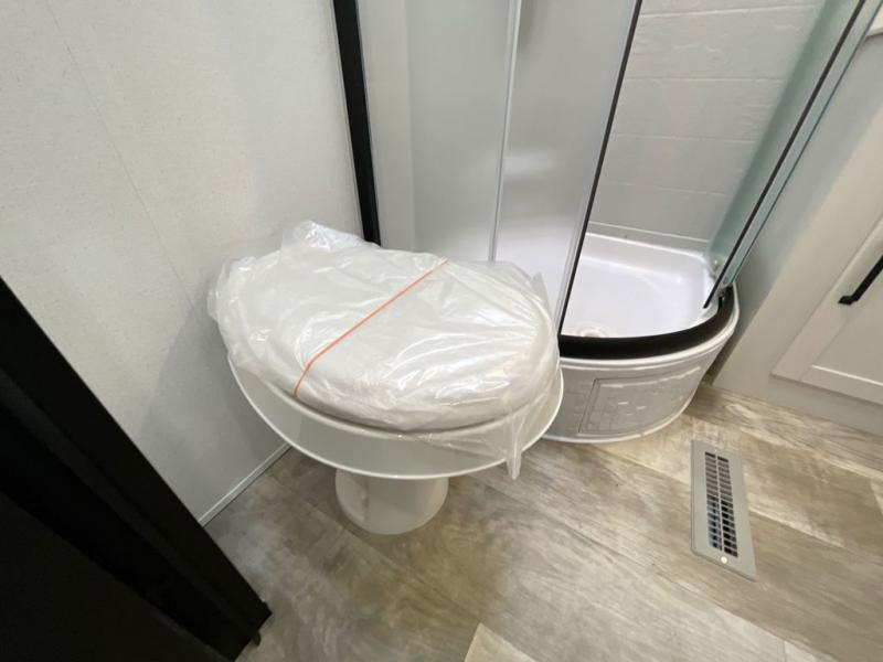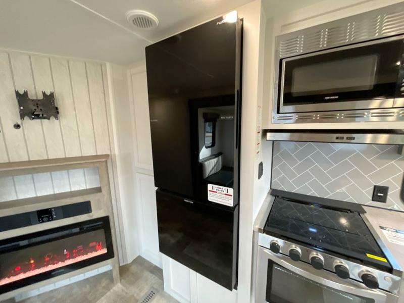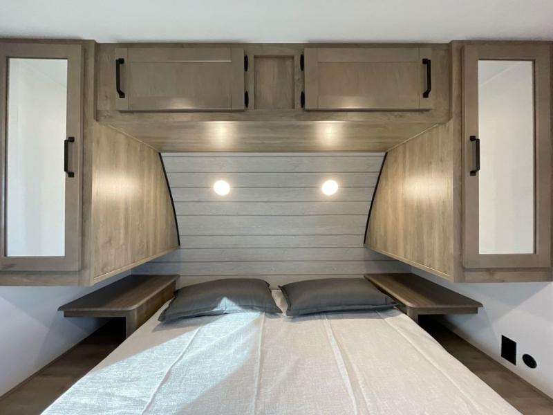 Comfort and convenience is found throughout this travel trailer! The set of rear recliners have an end table in between to set your cup of coffee as you read the newspaper, and the sofa is a great place to take an afternoon nap. After you have prepared your best home cooked meal with the stainless steel oven and 12V refrigerator, you can head to the booth dinette then play a card game or two. The full bathroom has a 34" x 34" radius shower to freshen up in before heading to the front private bedroom to enjoy a good night's rest on the queen bed which has shirt closets and nightstands on either side of it.
