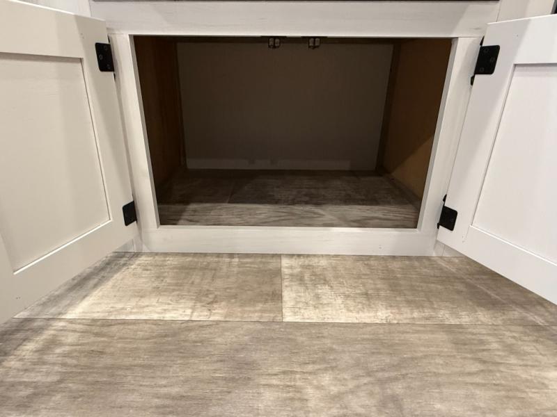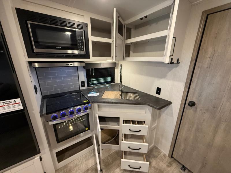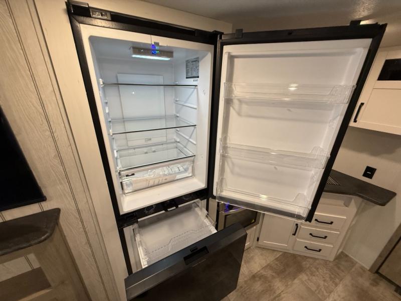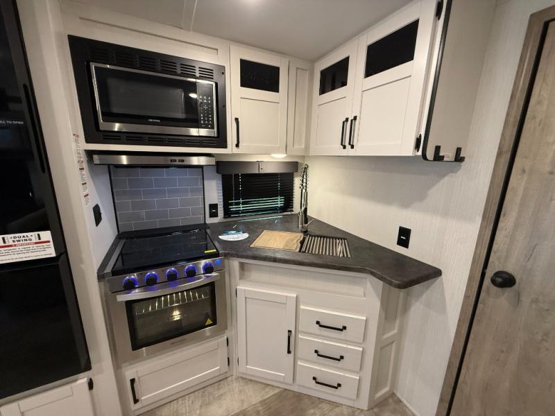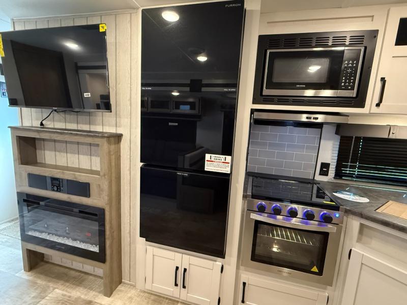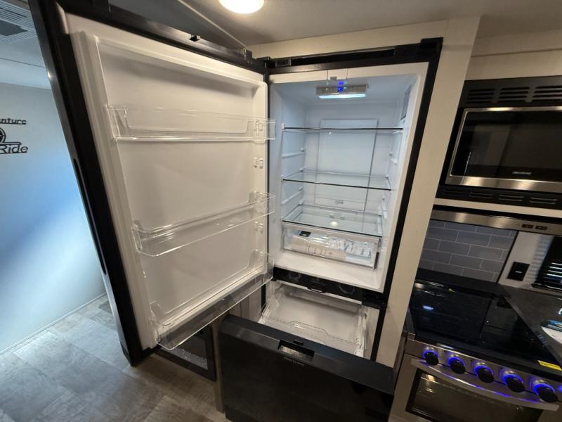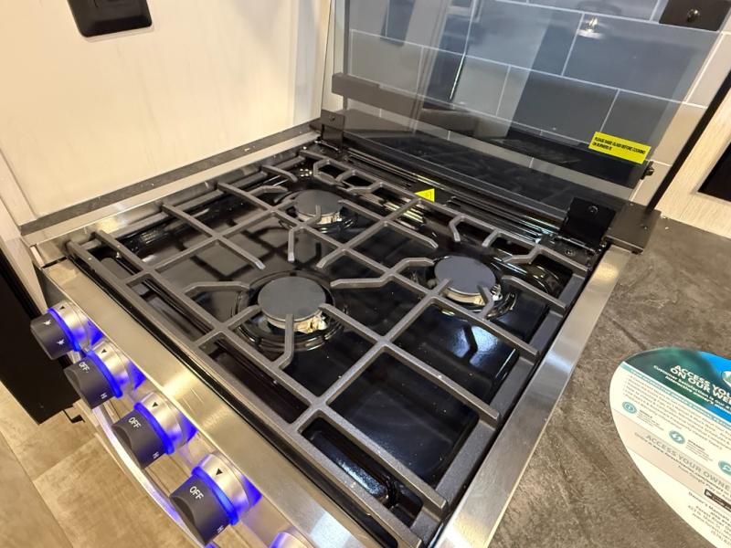 Kitchen includes 3-burner cooktop, stainless-steel oven and range hood, stainless microwave, 11 cu ft 12V refrigerator with black glass doors (dual swing/different sources)