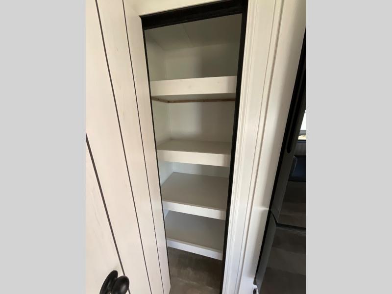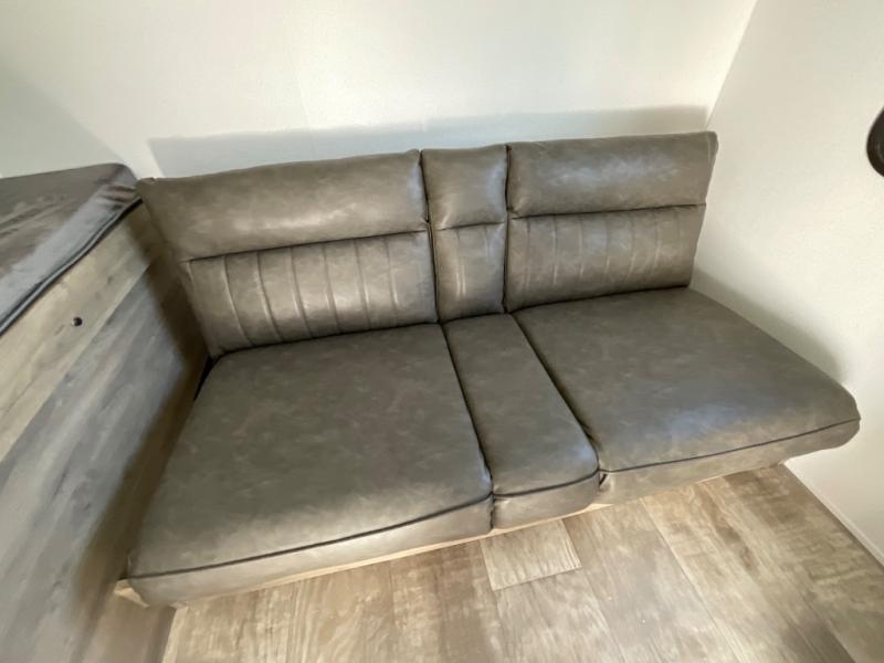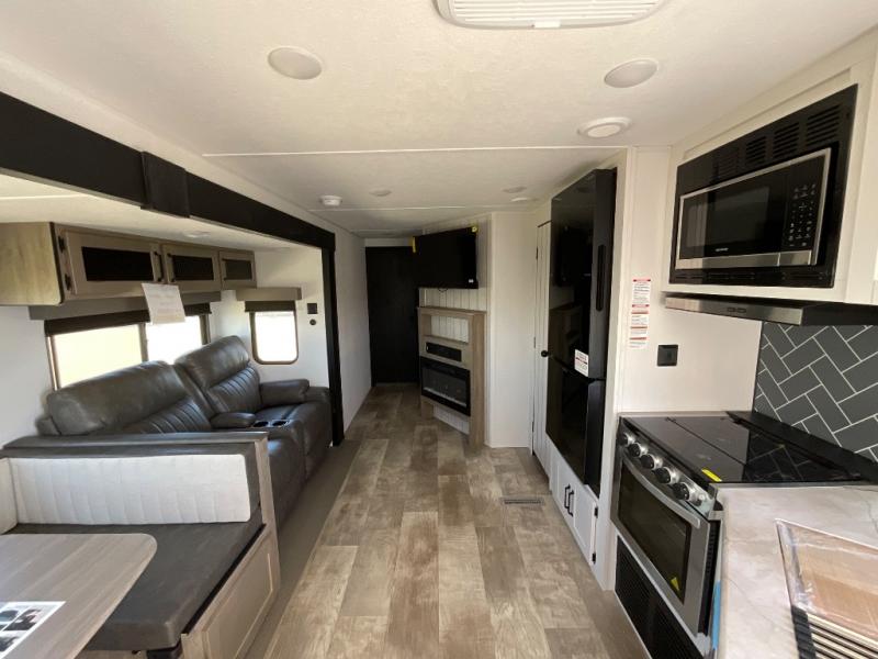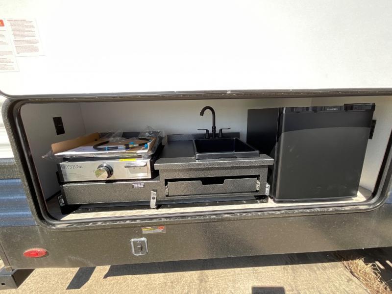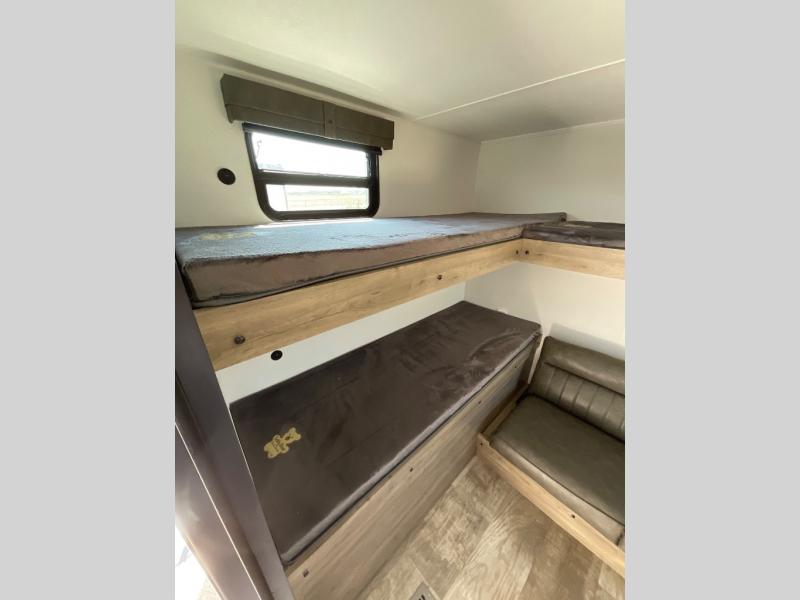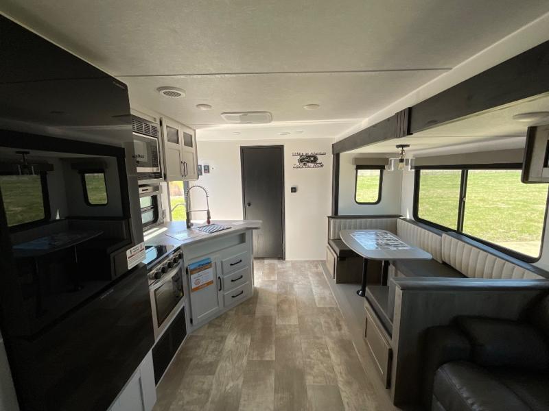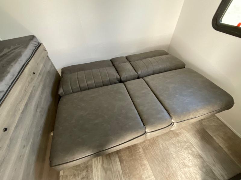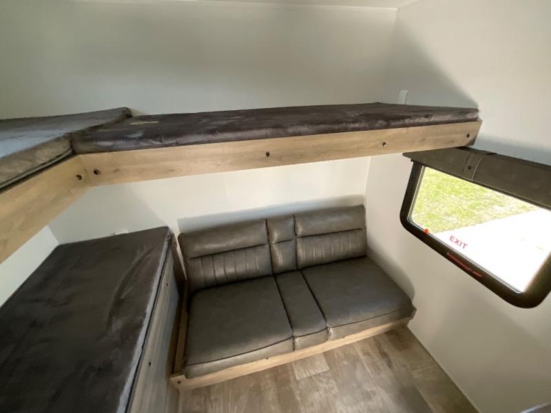 There's a comfortable place to sleep for the whole family in this travel trailer! The rear private bunkhouse has a set of 28" x 76" bunk beds, a 28" x 65" bunk above a sofa, and a wardrobe with an entertainment center above it so they can bring a cousin or two to join in on the fun. You will have your own privacy with the front private bedroom which has a queen bed with shirt closets on either side of it. The spacious full bathroom has a 34" x 34" radius shower for everyone to freshen up and one of the entrances leads directly outside so you can get back to having fun fast. Prepare your best home cooked meals indoors with the walk-in pantry, the three burner cooktop, and the 12V refrigerator. Plus, there is a U-shaped dinette to enjoy your meals and even transform into an extra sleeping space! Choose the optional mini outside kitchen for even more convenience!