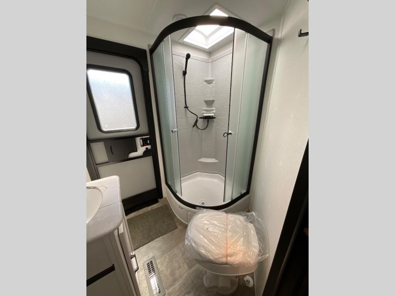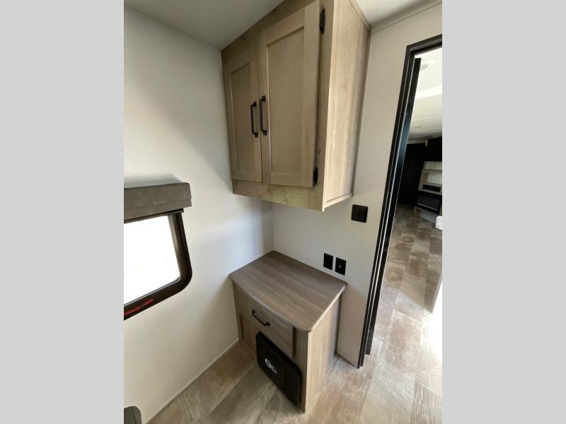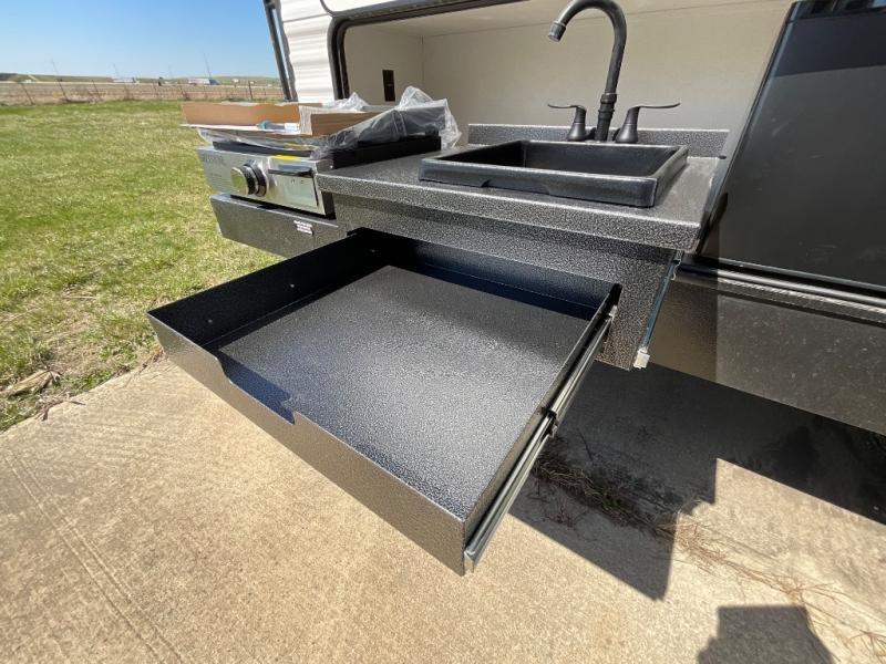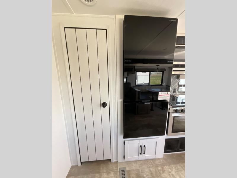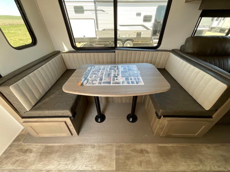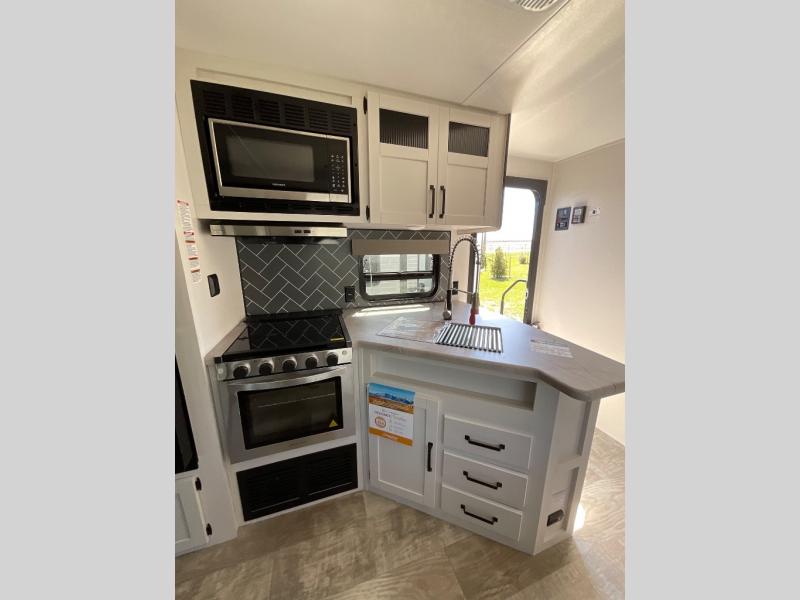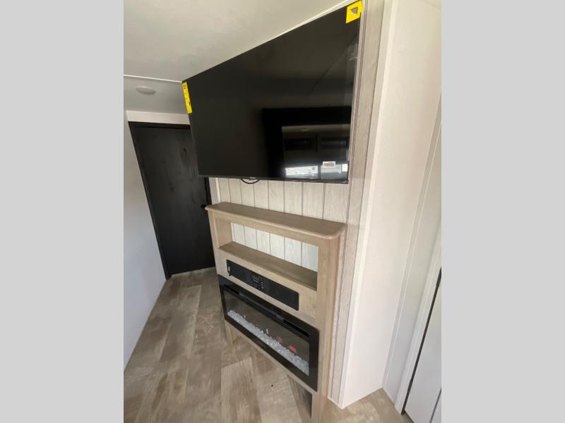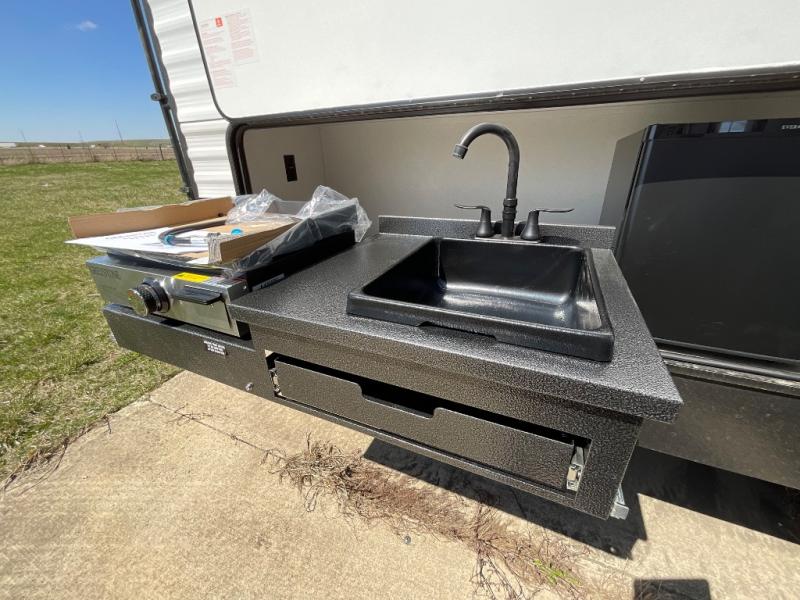 There's a comfortable place to sleep for the whole family in this travel trailer! The rear private bunkhouse has a set of 28" x 76" bunk beds, a 28" x 65" bunk above a sofa, and a wardrobe with an entertainment center above it so they can bring a cousin or two to join in on the fun. You will have your own privacy with the front private bedroom which has a queen bed with shirt closets on either side of it. The spacious full bathroom has a 34" x 34" radius shower for everyone to freshen up and one of the entrances leads directly outside so you can get back to having fun fast. Prepare your best home cooked meals indoors with the walk-in pantry, the three burner cooktop, and the 12V refrigerator. Plus, there is a U-shaped dinette to enjoy your meals and even transform into an extra sleeping space! Choose the optional mini outside kitchen for even more convenience!