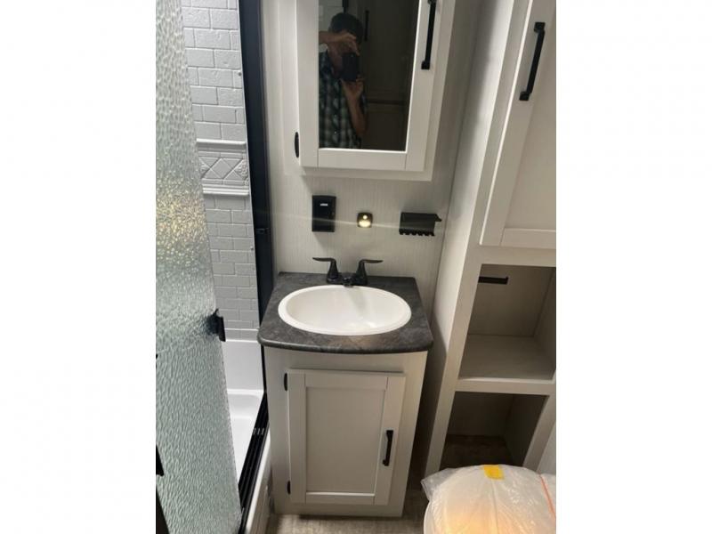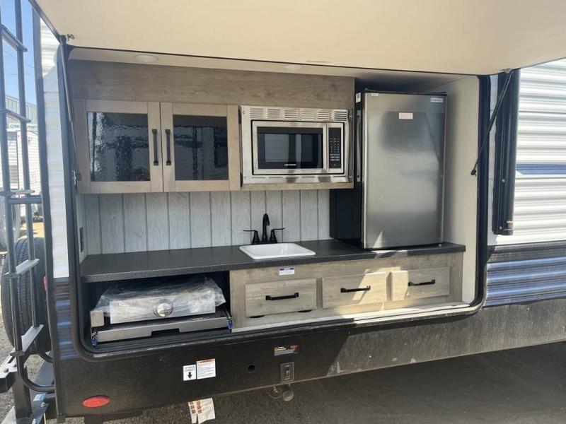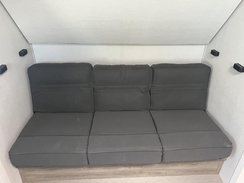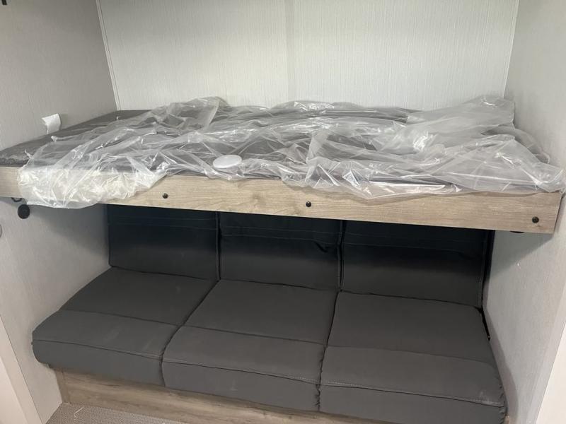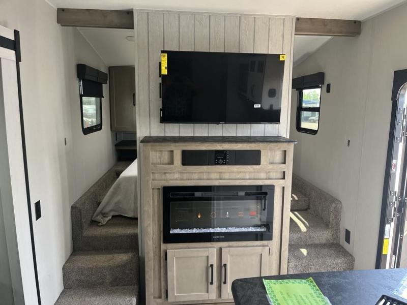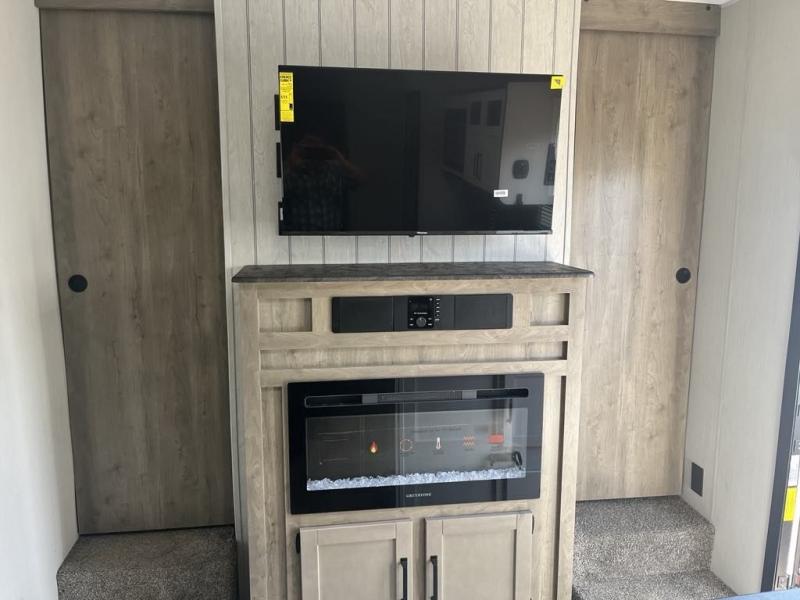 With a rear private bunkhouse in this fifth wheel, your kids or guests will have a comfortable place to lay their head at night! Inside the bunkhouse is a 38" x 76" bunk above an entertainment center and a 32" x 69" bunk above a jiffy sofa slide. The U-shaped dinette and sofa slide can also transform into extra sleeping spaces when you aren't using them to watch a movie across from the entertainment center or enjoying a meal. And the fireplace will provide a cozy evening indoors. Everyone can stay squeaky clean with the 32" x 40" shower with a seat in the full bathroom, and their bellies full with the indoor three burner cooktop.