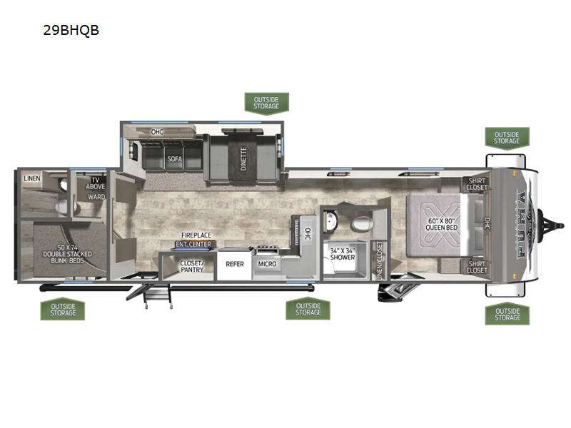 Don't waste another minute camping in an uncomfortable tent when you could be camping in this comfortable travel trailer! It features a private bunkhouse with a set of 50" x 74" double-size bunk beds, wardrobe with TV above it, and half bath including a line cabinet. The front also offers a private bedroom with a queen bed including shirt closets on either side, plus a private exterior entry door so you can slip in and out whenever you like. A booth dinette and sofa slide can convert into extra sleeping spaces if needed and are opposite the entertainment center and fireplace. Everyone can freshen up in the main full bathroom with a 34" x 34" shower including a seat. On the outside, you will find plenty of storage with a front pass-through compartment, plus a 19' power awning to create an inviting outdoor living area to enjoy.
