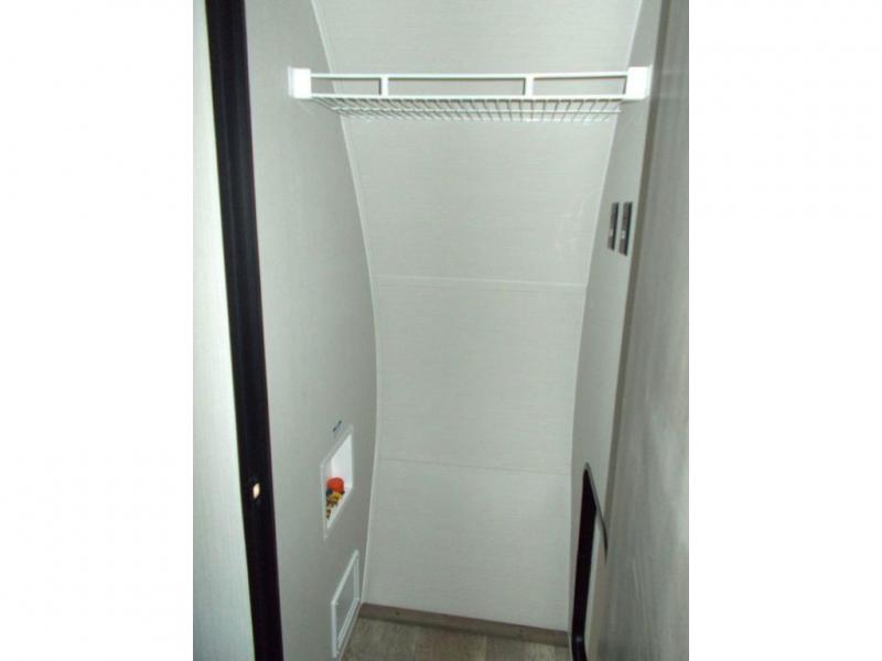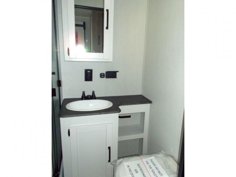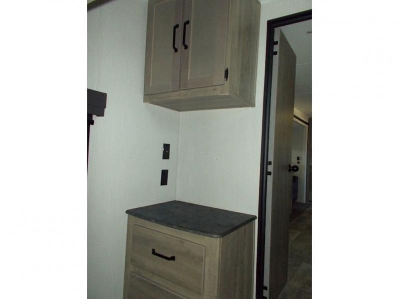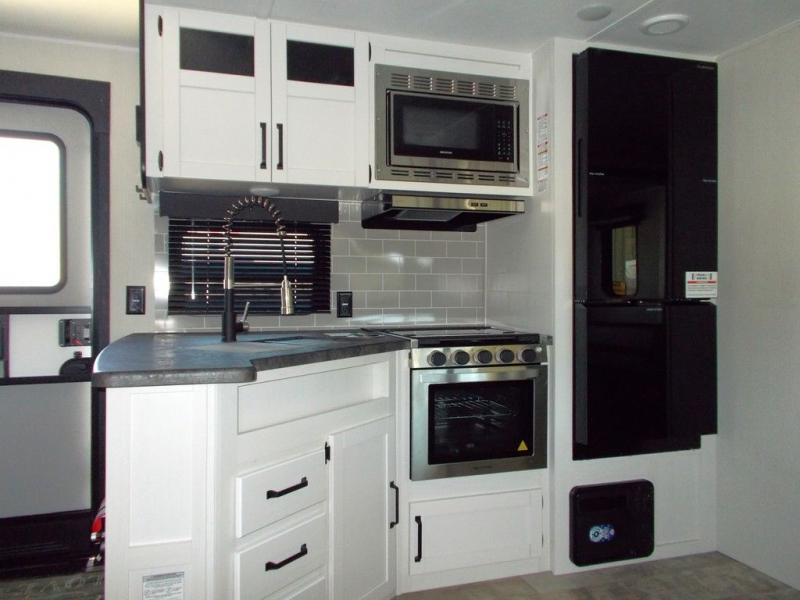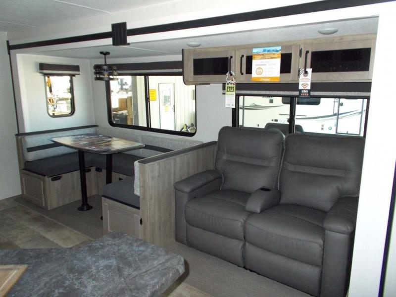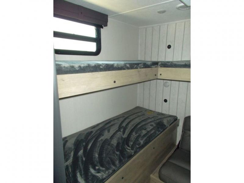 There's a comfortable place to sleep for the whole family in this travel trailer! The rear private bunkhouse features a set of 28" x 76" bunk beds, a 28" x 65" bunk above a sofa, and a wardrobe with an entertainment center above it so they can bring a friend or two to join in on the fun. You will have your own privacy with the front private bedroom which features a queen bed slide for added floor space, plus a large front closet for your clothing, and a second closet with washer/dryer prep, and a dresser too! Everyone will enjoy the full bath which features a 32" x 40" shower with seat to freshen up in so you can skip the public facilities. This unit also offers a spacious combined kitchen and living room which features a U-dinette and sofa slide for plenty of seating for meals and hanging out, and an entertainment center and fireplace to enjoy when spending time inside. You will easily be able to prepare your best home cooked meals using the full interior kitchen, or you may wish to choose the optional outside kitchen with griddle.