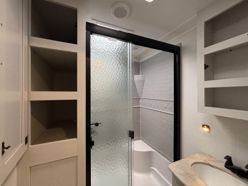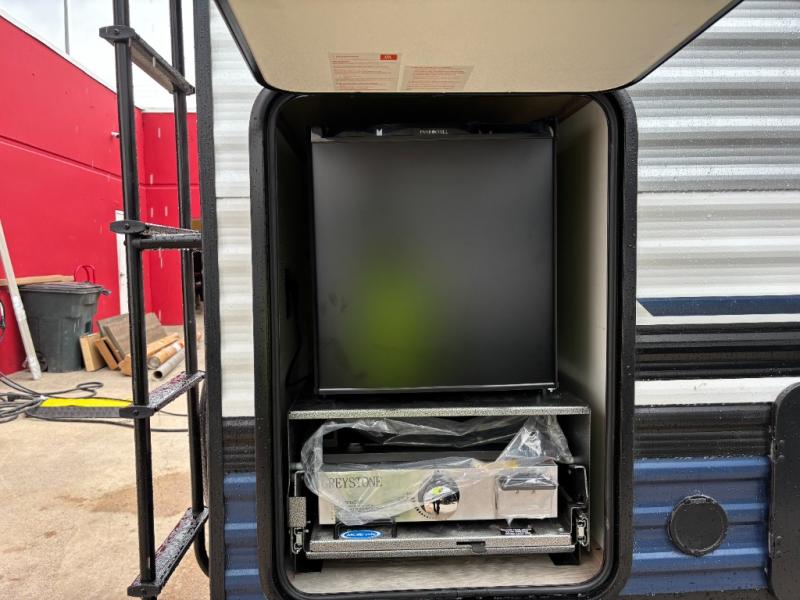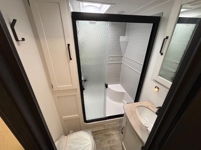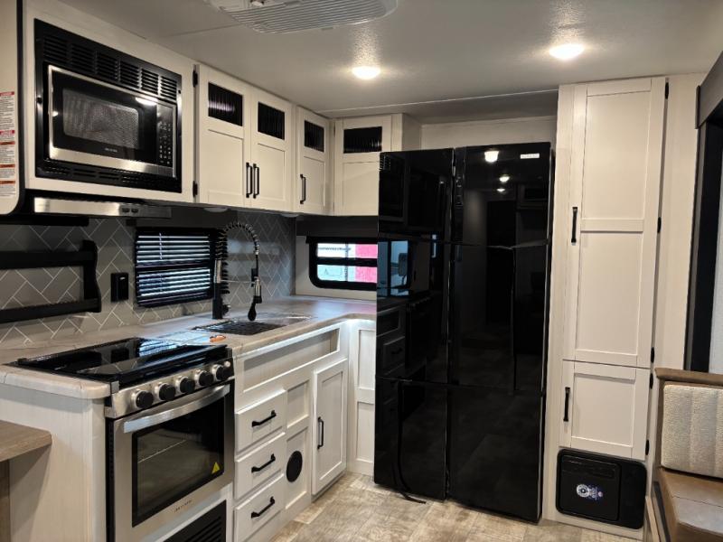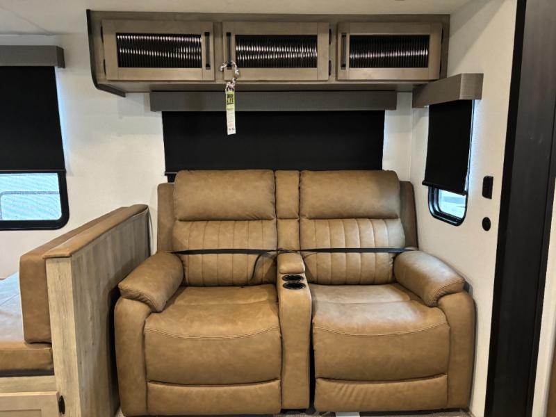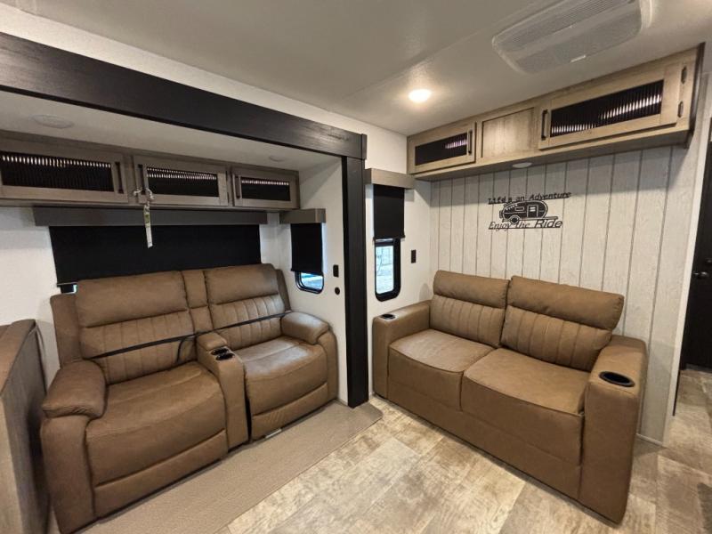 You won't want to camp any other way once you step inside this travel trailer! The rear kitchen has a stainless steel oven and range to prepare your best meals, a 12V refrigerator to keep your perishables fresh, and a walk-in pantry for your canned goods and snacks for movie night. After a fun day at the beach, you can play a card game at the booth dinette, relax in either one of the two recliners and sofa, or rinse the sand out of your hair in the 32" x 40" shower with a seat in the full bathroom. There is also a front private bedroom with a queen bed slide across from a dresser and a front closet with another closet with washer and dryer prep.
