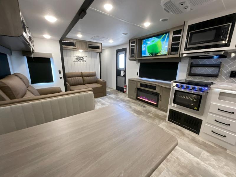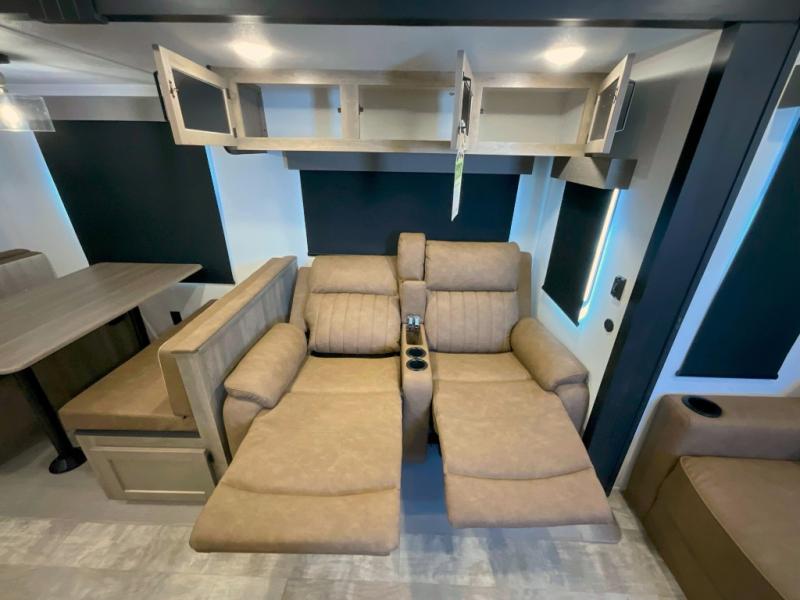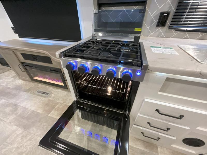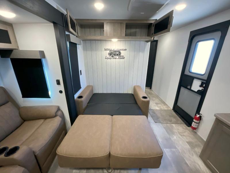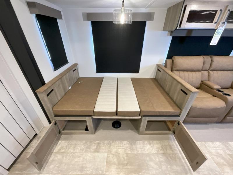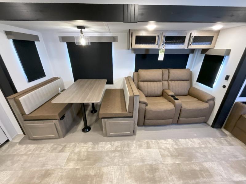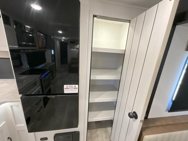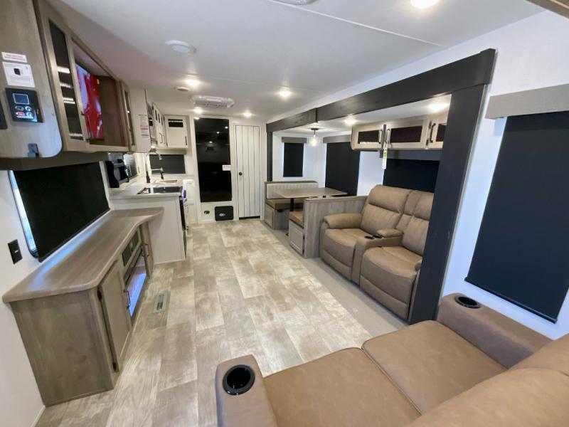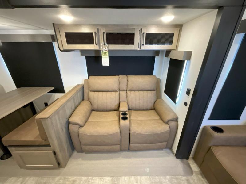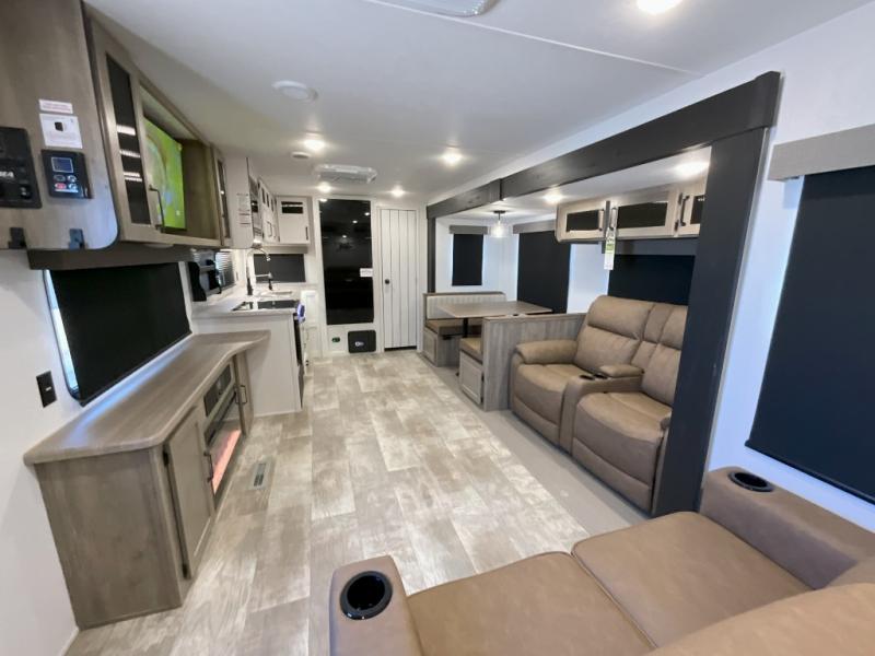 You won't want to camp any other way once you step inside this travel trailer! The rear kitchen has a stainless steel oven and range to prepare your best meals, a 12V refrigerator to keep your perishables fresh, and a walk-in pantry for your canned goods and snacks for movie night. After a fun day at the beach, you can play a card game at the booth dinette, relax in either one of the two recliners and sofa, or rinse the sand out of your hair in the 32" x 40" shower with a seat in the full bathroom. There is also a front private bedroom with a queen bed slide across from a dresser and a front closet with another closet with washer and dryer prep.