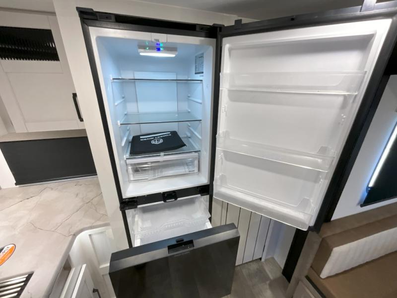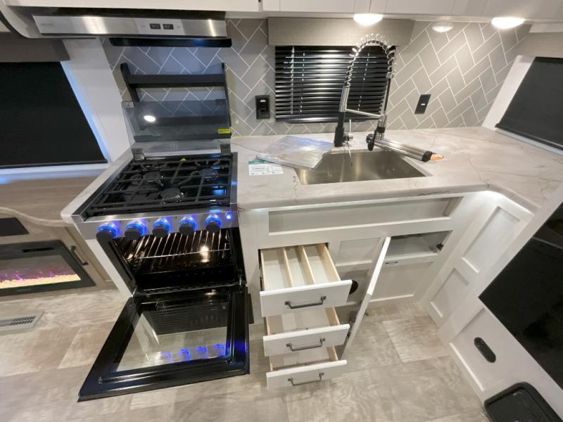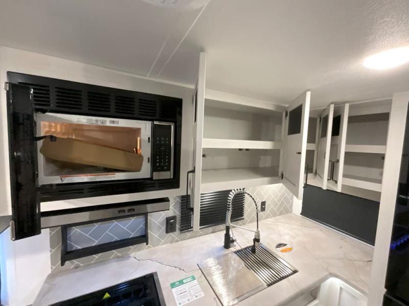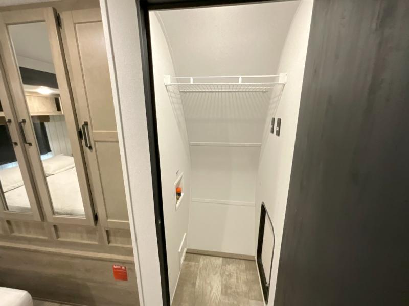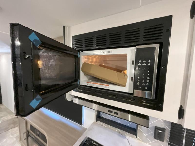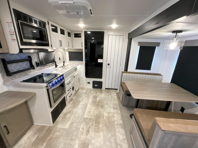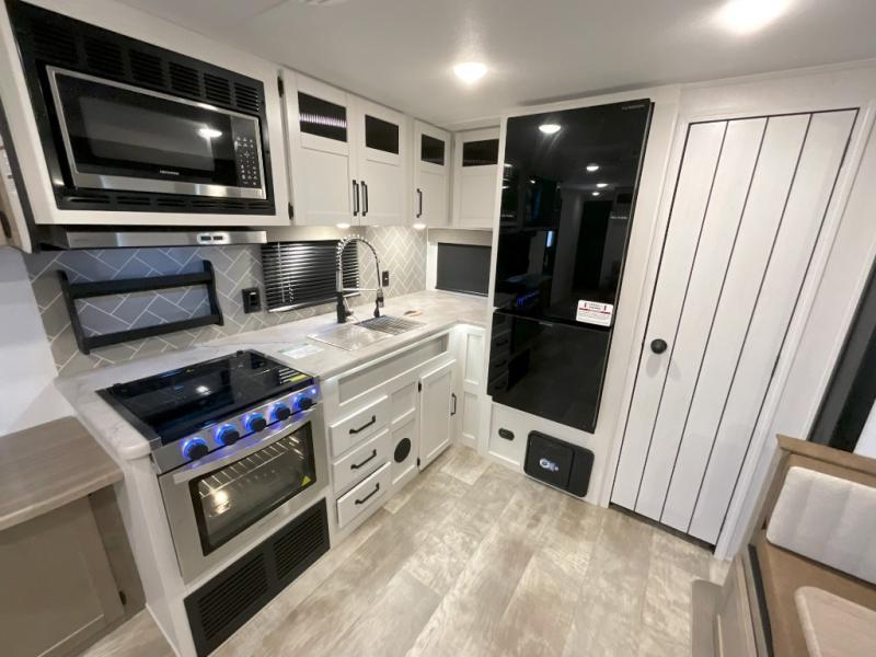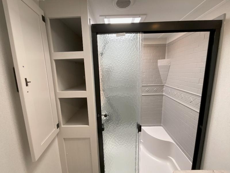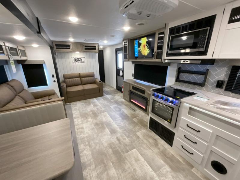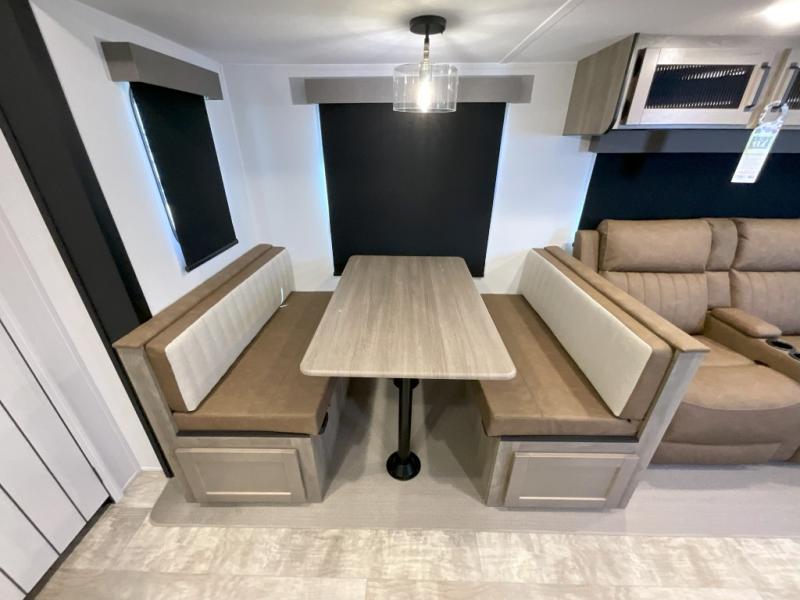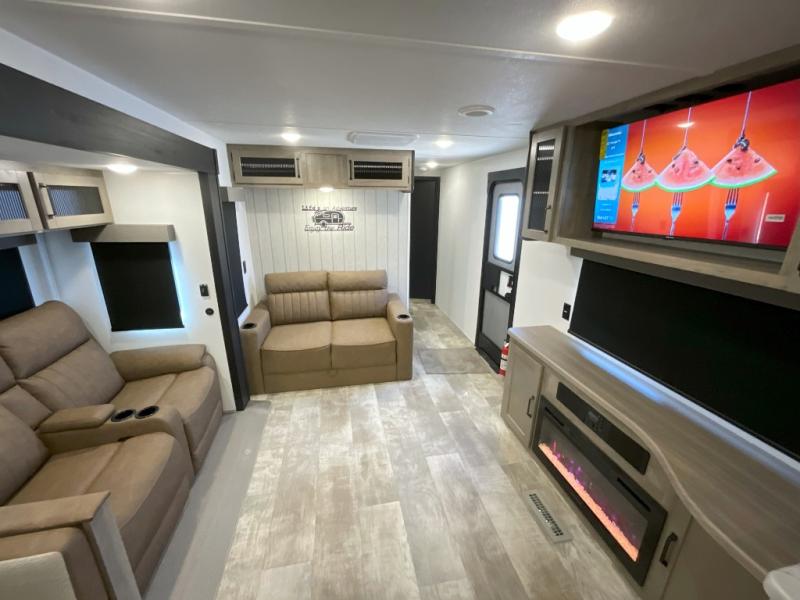 You won't want to camp any other way once you step inside this travel trailer! The rear kitchen has a stainless steel oven and range to prepare your best meals, a 12V refrigerator to keep your perishables fresh, and a walk-in pantry for your canned goods and snacks for movie night. After a fun day at the beach, you can play a card game at the booth dinette, relax in either one of the two recliners and sofa, or rinse the sand out of your hair in the 32" x 40" shower with a seat in the full bathroom. There is also a front private bedroom with a queen bed slide across from a dresser and a front closet with another closet with washer and dryer prep.