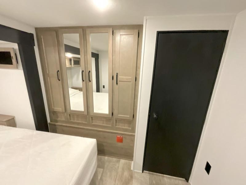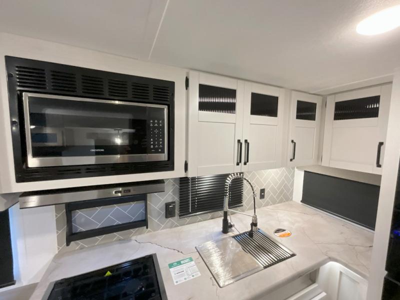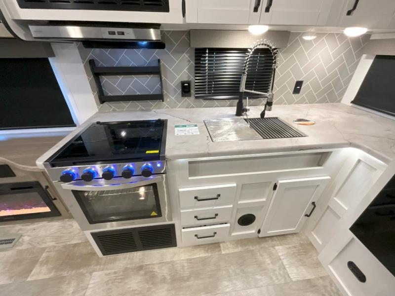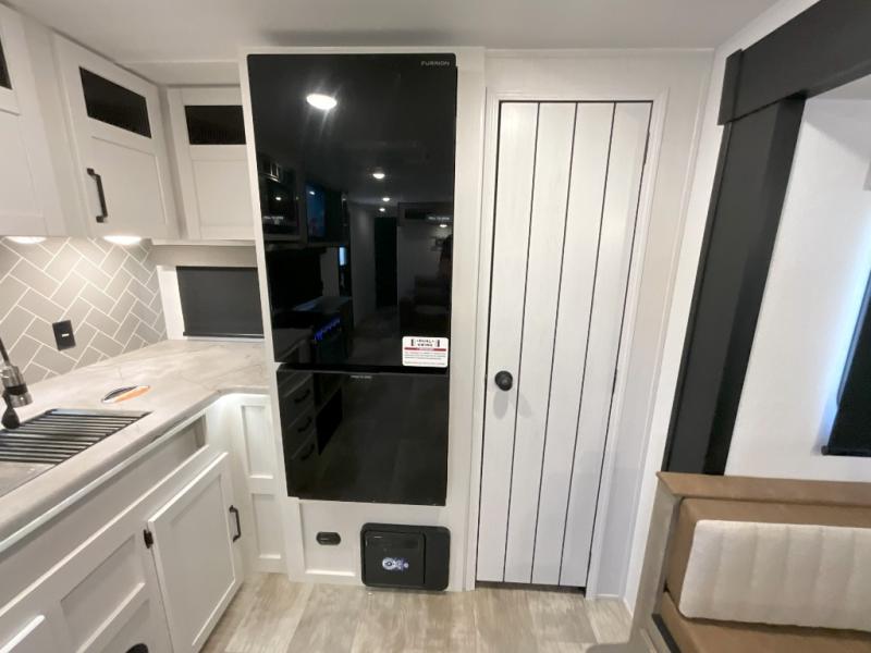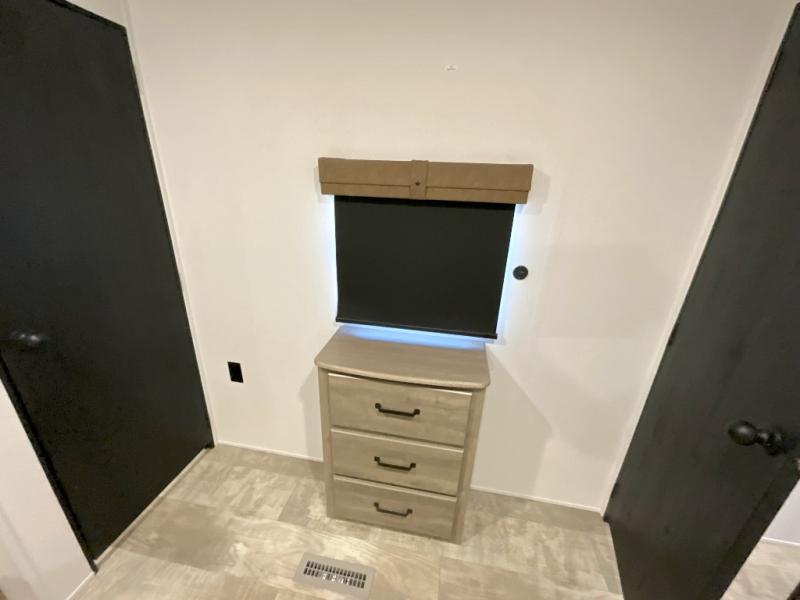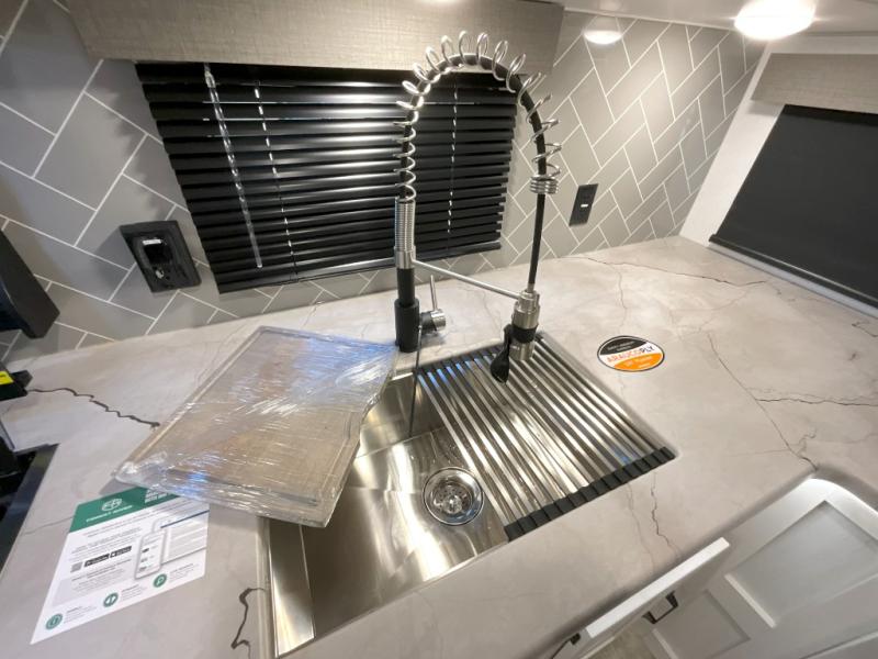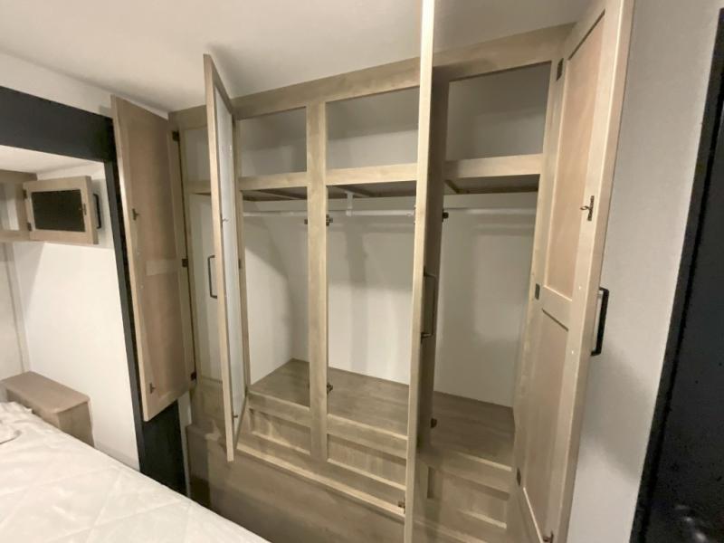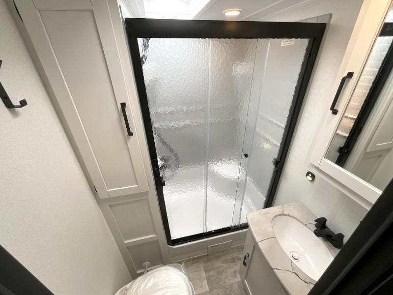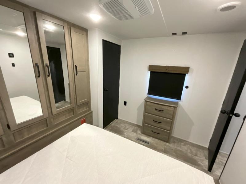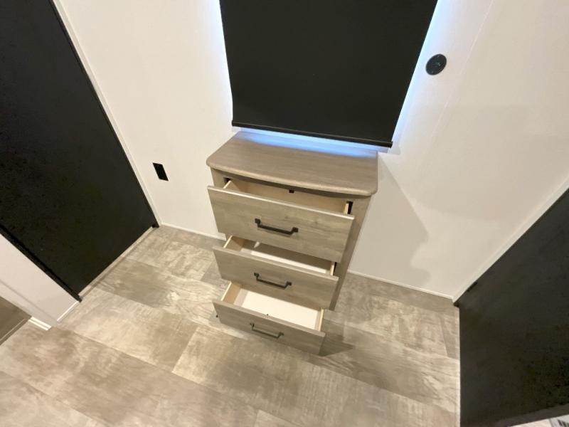 You won't want to camp any other way once you step inside this travel trailer! The rear kitchen has a stainless steel oven and range to prepare your best meals, a 12V refrigerator to keep your perishables fresh, and a walk-in pantry for your canned goods and snacks for movie night. After a fun day at the beach, you can play a card game at the booth dinette, relax in either one of the two recliners and sofa, or rinse the sand out of your hair in the 32" x 40" shower with a seat in the full bathroom. There is also a front private bedroom with a queen bed slide across from a dresser and a front closet with another closet with washer and dryer prep.